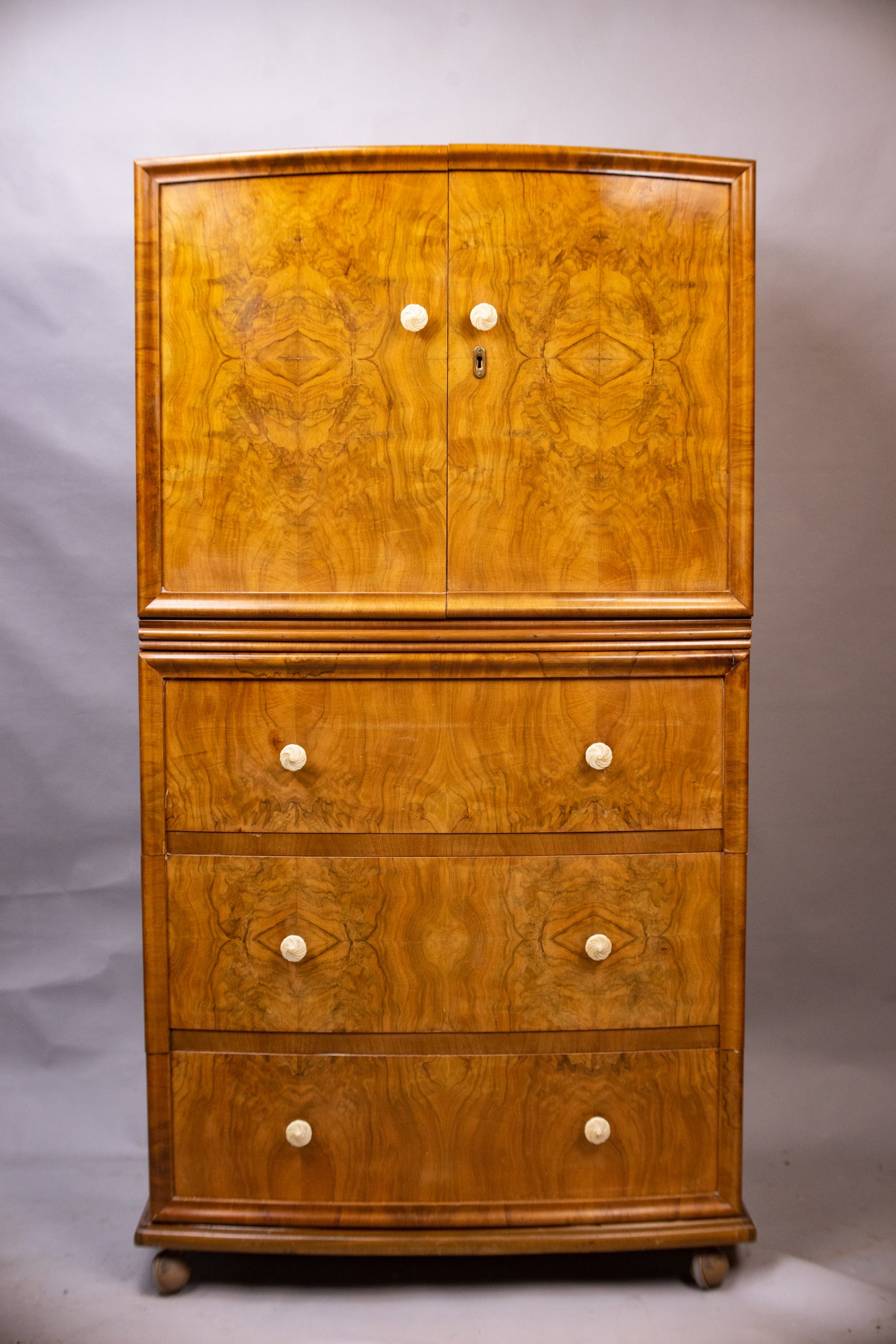 with a shelved cupboard over three drawers finished in sumptuously grained walnut veneer. It was apparently imported to the UK from Austria in 1938 although the Art Nouveau styling of the handles and solid quality of the construction suggest Hungarian origin. Original lacquered finish and round bakelite handles. Sits on a base with castors.