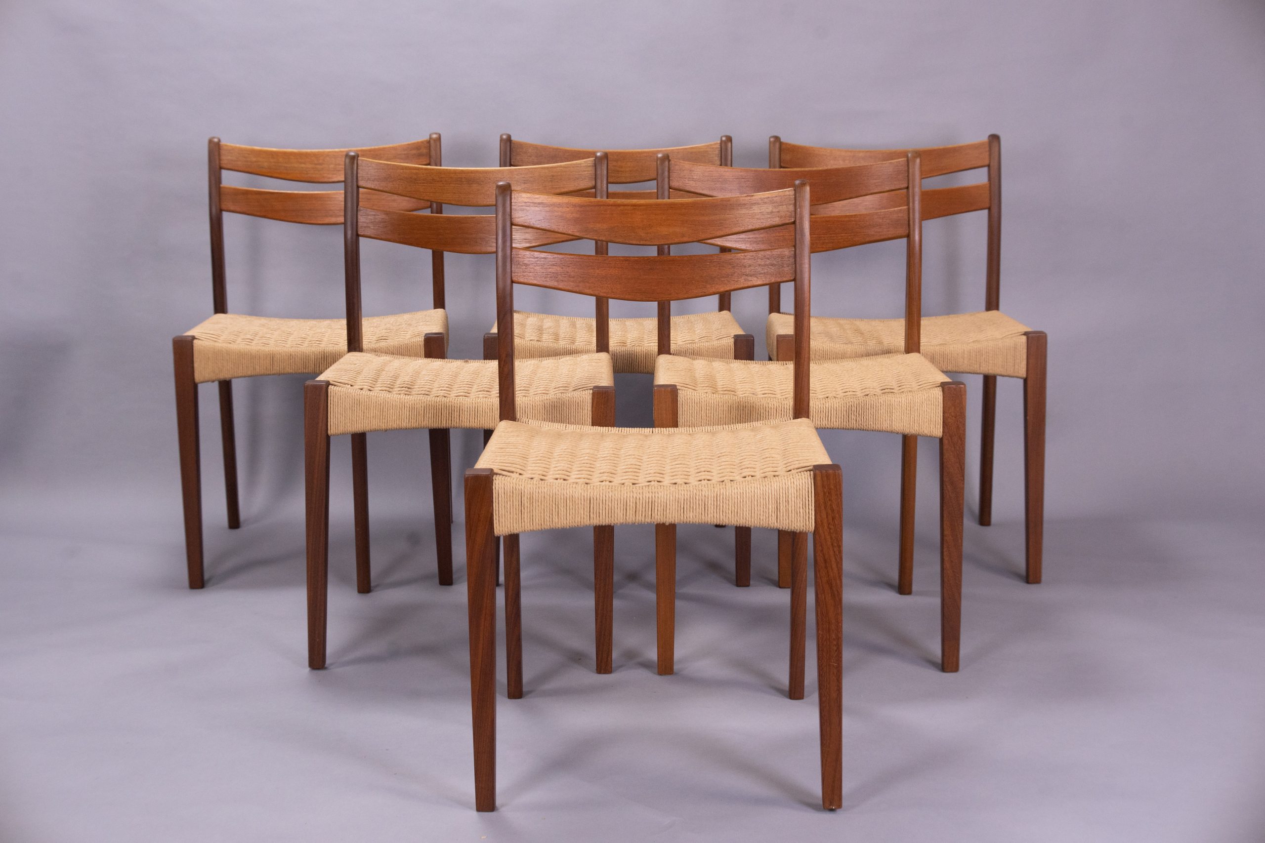 Designed by Arne Hovmand-Olsen and produced by Mogens Kold in the late 1960s. The tapered legs and swept-back back posts are made of solid afromosia with flowing grain in shades from walnut to dark chocolate brown. The backrests are formed from bentwood laminated teak. All frames in very good original condition, cleaned and re-oiled and the seats have been fully restored and re-woven with Danish paper cord following the original pattern and method.