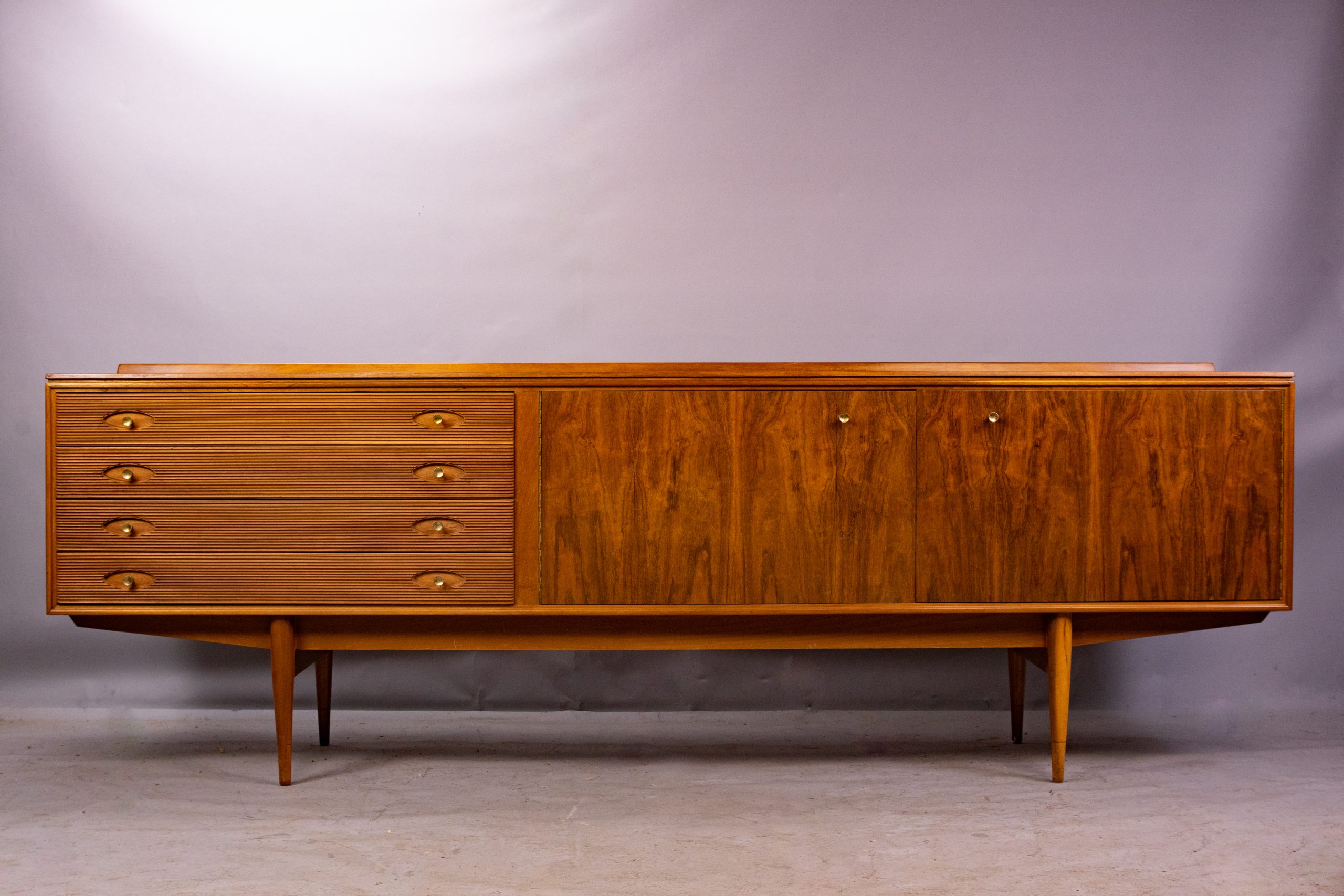 This finely crafted, elegant credenza has two wide rosewood-veneered doors with trumpet-shaped brass handles opening onto cupboards with cut-away shelves. The same handles are set into oval recesses on the reeded fronts of the four wide teak drawers. The upper drawer is lined with green baize and has fixed dividers for cutlery.