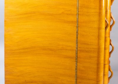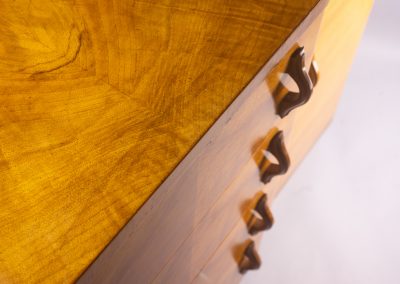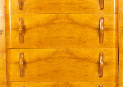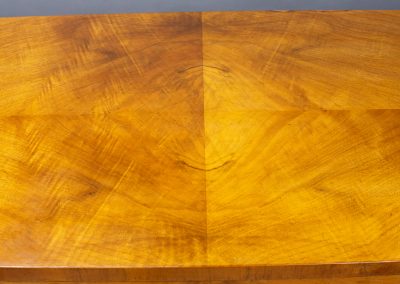 The golden walnut veneer is quarter-matched on the top and book-matched on the drawer fronts with lines of banding running all around the top and bottom of the cabinet. The finish has been restored by French polishing with button shellac to show off the stunning grain.