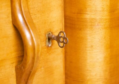 The top drawer has a small sliding cutlery tray made of oak and is lined with khaki-coloured felt. An original key is present which fits the locks on both cupboard doors.