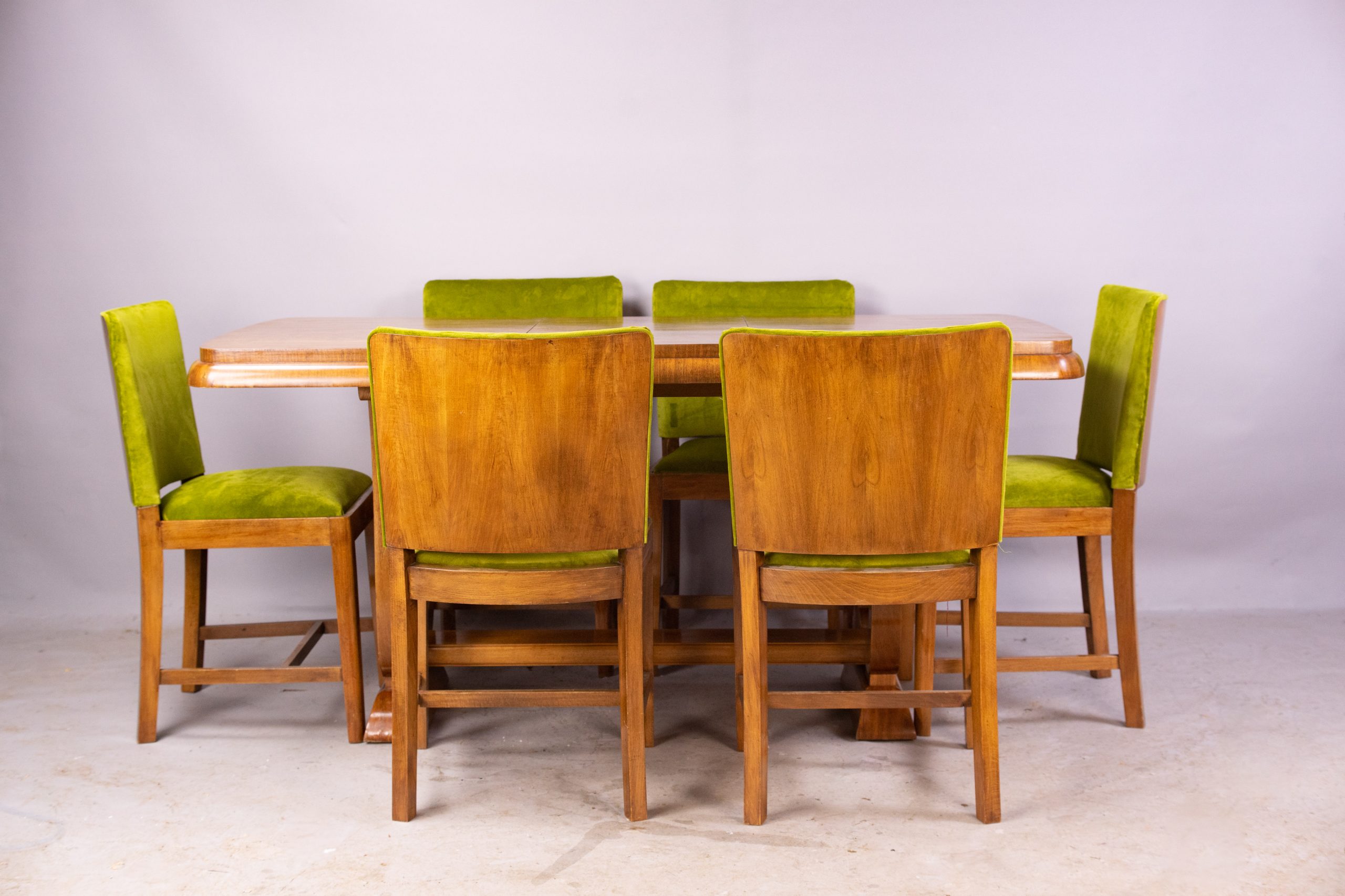 English walnut veneer over a solid wood core of beech and spruce. The table has elegant lyre-shaped legs and a sculpted edge. The table extends from 125cm to 168cm with the leaf inserted. Six matching walnut dining chairs with curved upholstered backs and sprung drop-in seats re-covered in peridot green velvet.