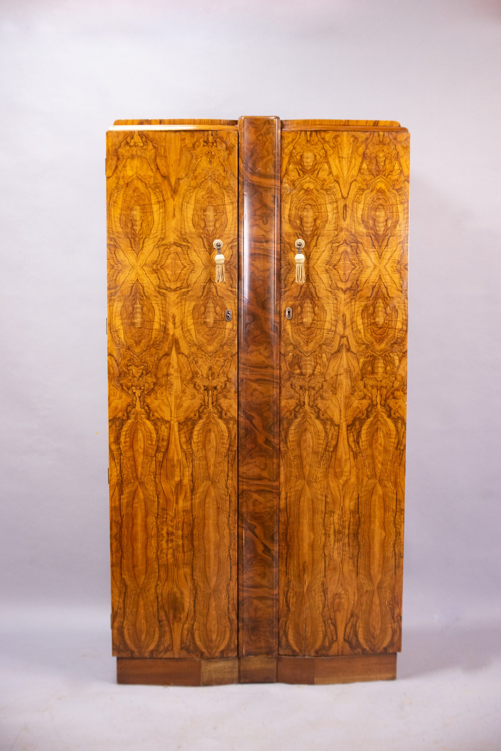 The serpentine front is finished in very striking burr walnut veneers in a book-matched pattern. Ornate tasselled Bakelite handles and working locks with key. Full-length hanging on one side and two drawers with shelf above and a hanging rail below on the other.