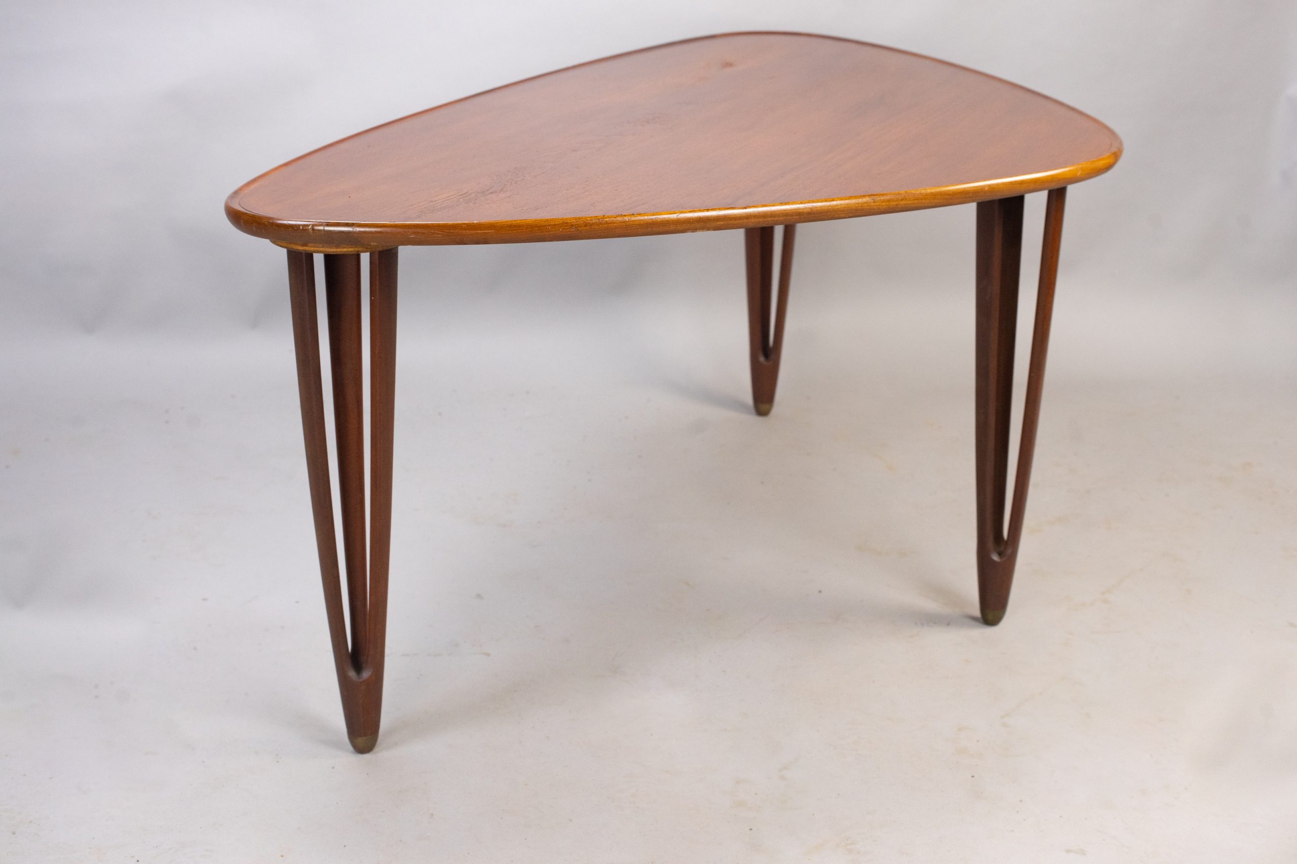 Triangular-shaped teak side table with swept curves and a rounded lip. The three distinctive sculptural teak legs end in brass ferrule feet.
