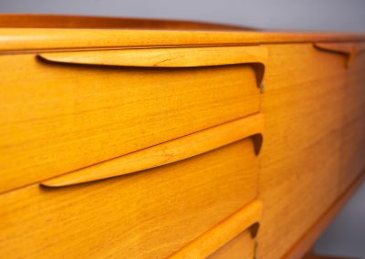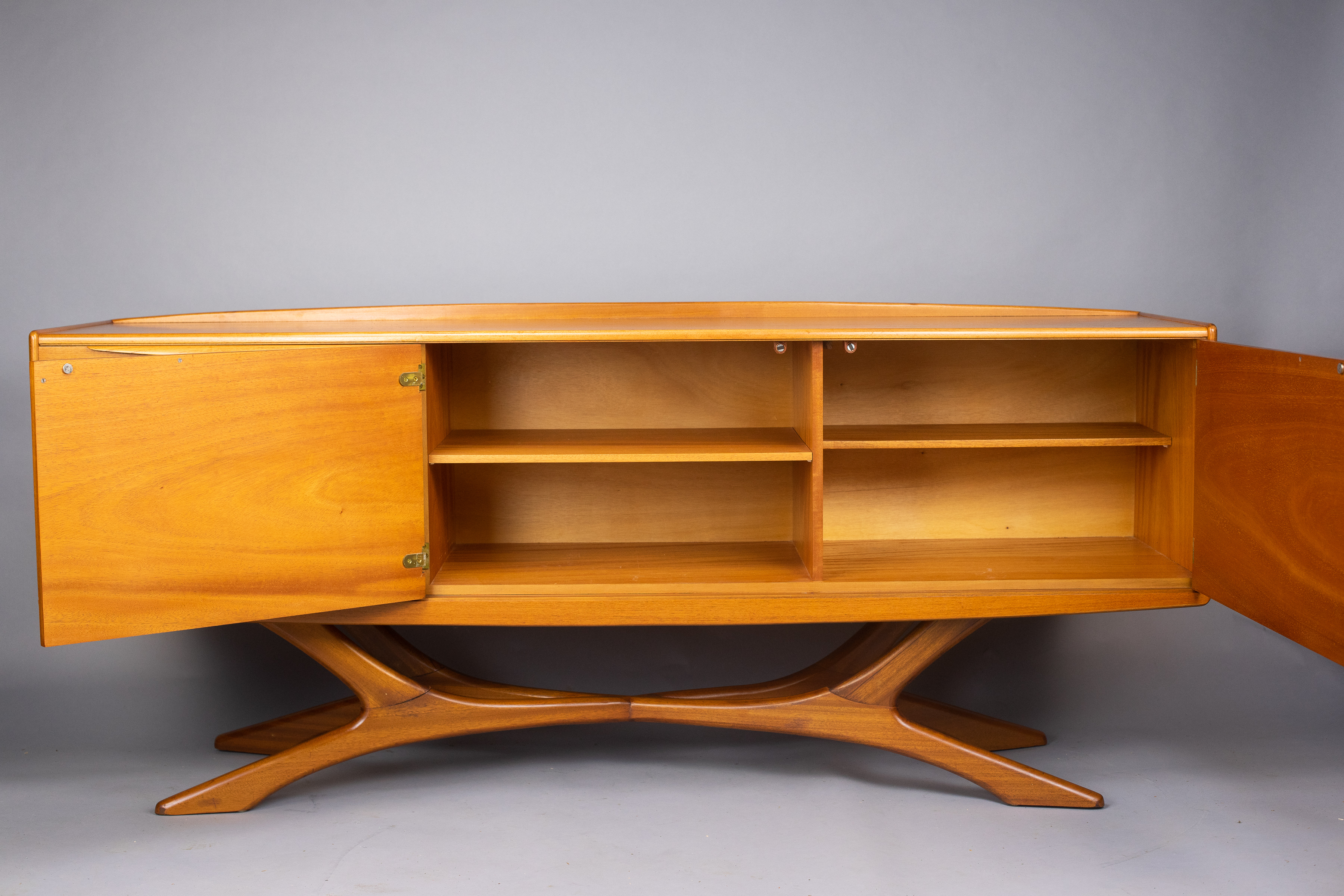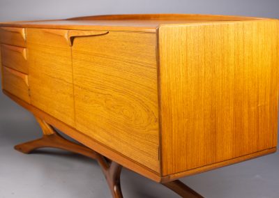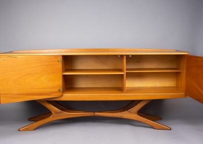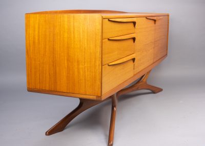 Flowing organic lines in the sculpted handles and that unmistakable cruciform base on which the cabinet appears to float. Val Rossi also worked for McIntosh before moving to the smaller firm Beithcraft to create some of their most iconic furniture. Production volumes were small and construction mostly by hand making what were expensive, premium pieces at the time. With such individual design and exceptional quality of manufacture, it is easy to see how this has become such a sought-after and now rarely-available piece of design.