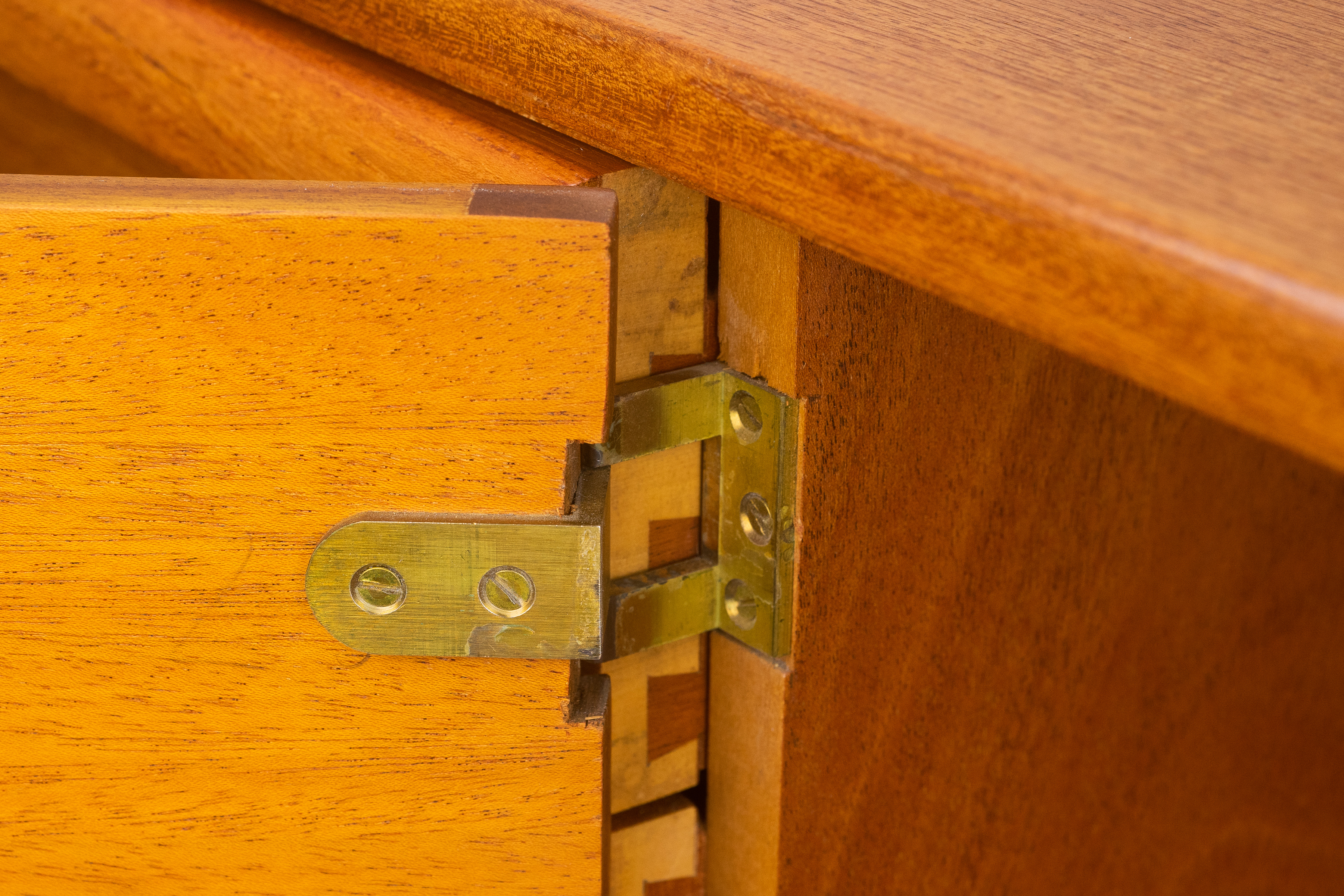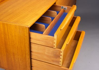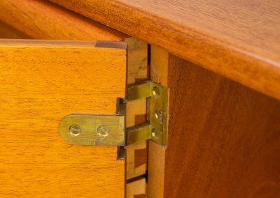 Two cupboards – full depth shelf on the left and half-depth on the right. Three drawers with the uppermost drawer having cutlery dividers and blue baize lining. All finished in stunning golden teak with carved solid teak base in a warmer tone. High-quality brass door hinges.