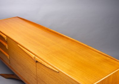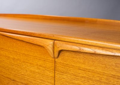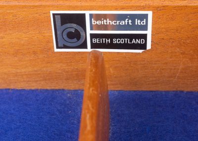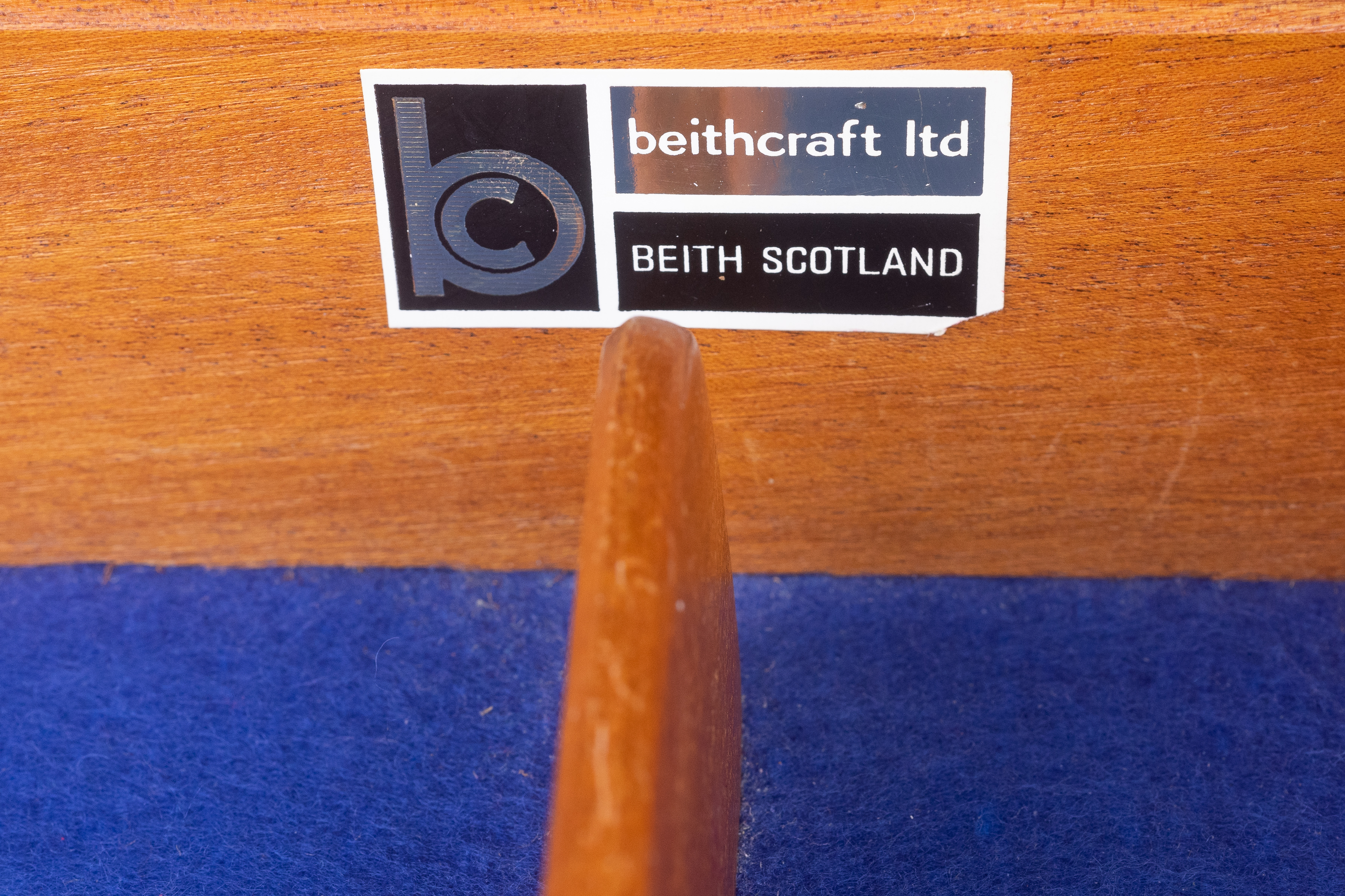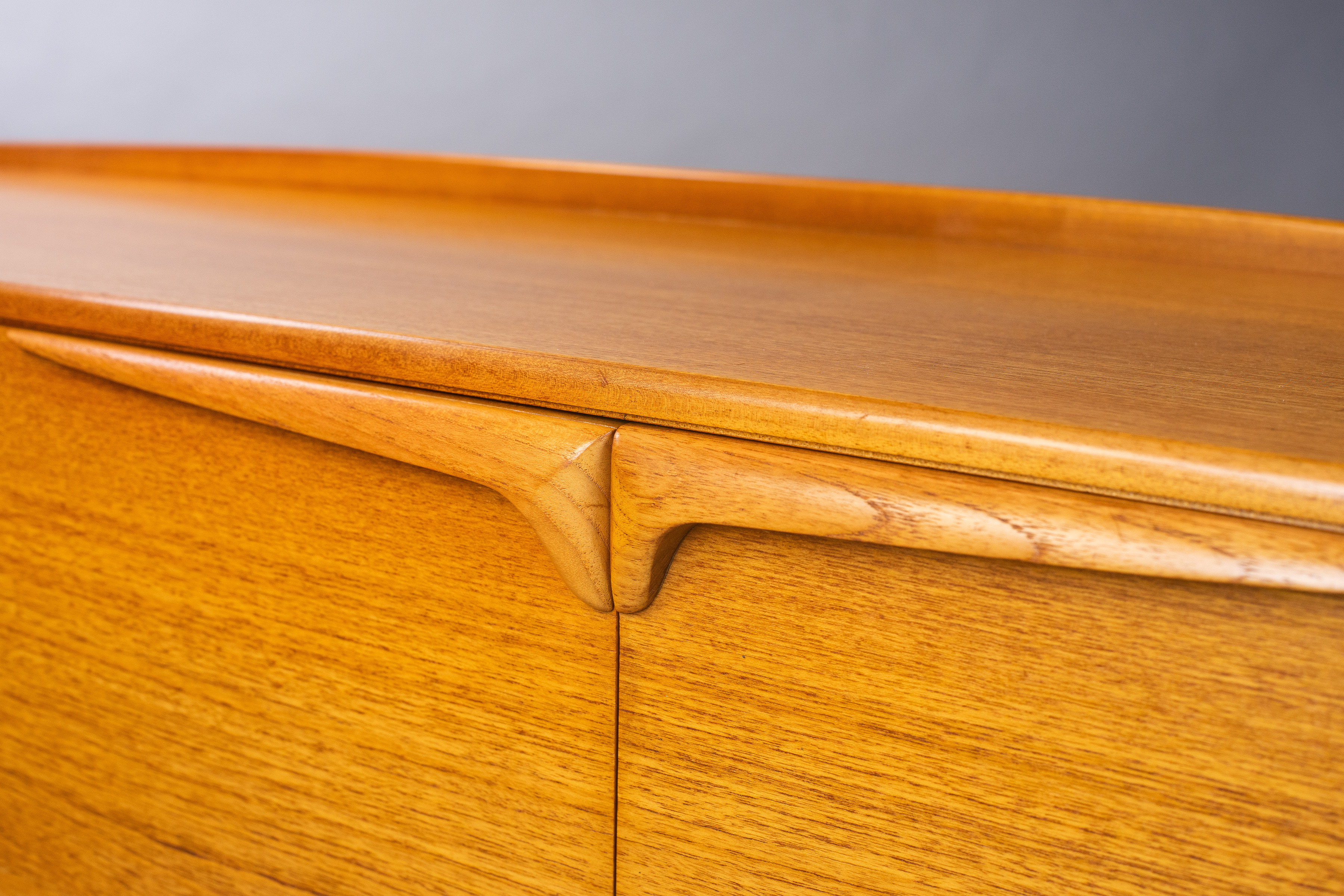 A very distinctive teak sideboard designed c.1970 by Val Rossi for high-end Scottish cabinet makers Beithcraft. Bears the original maker’s label.