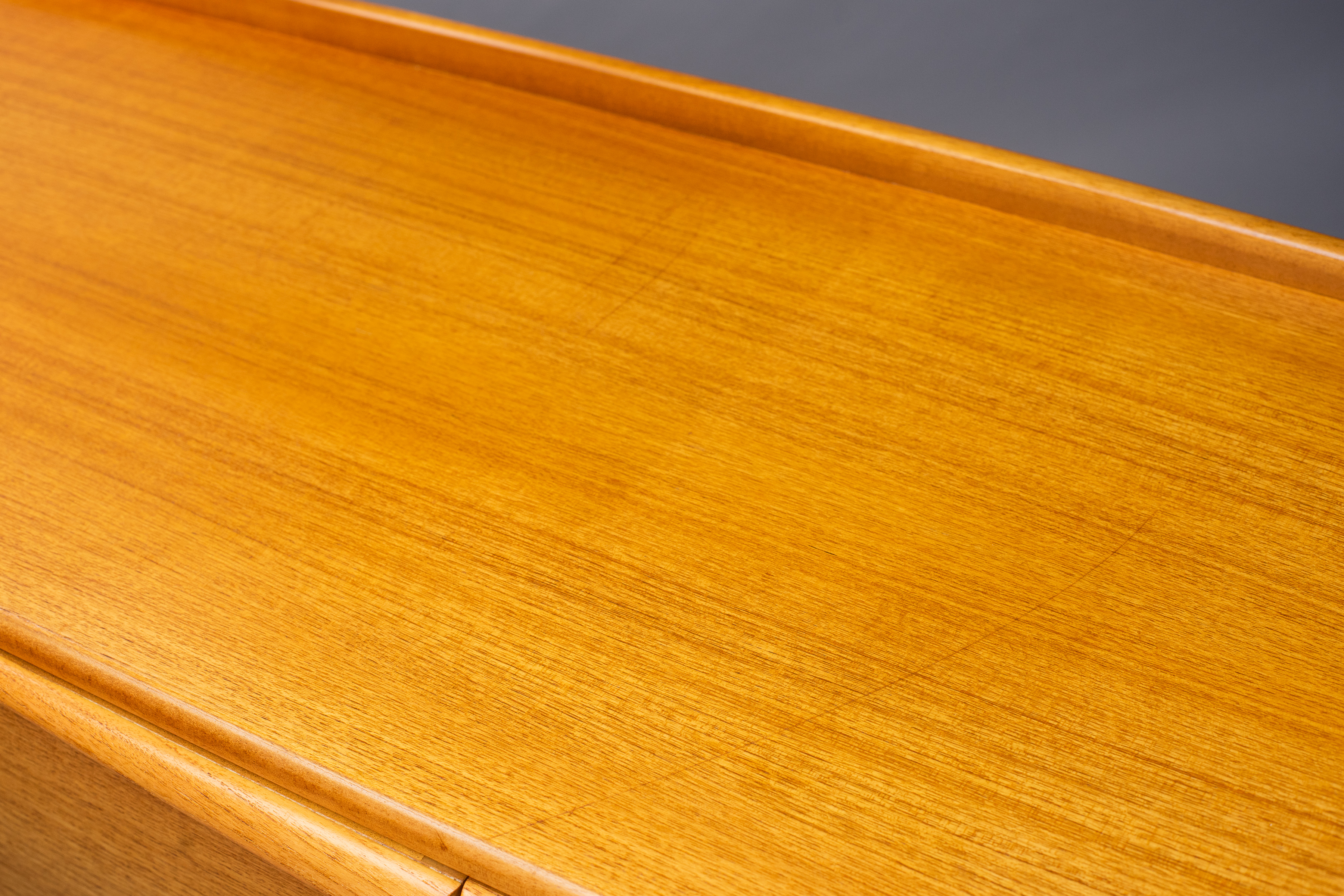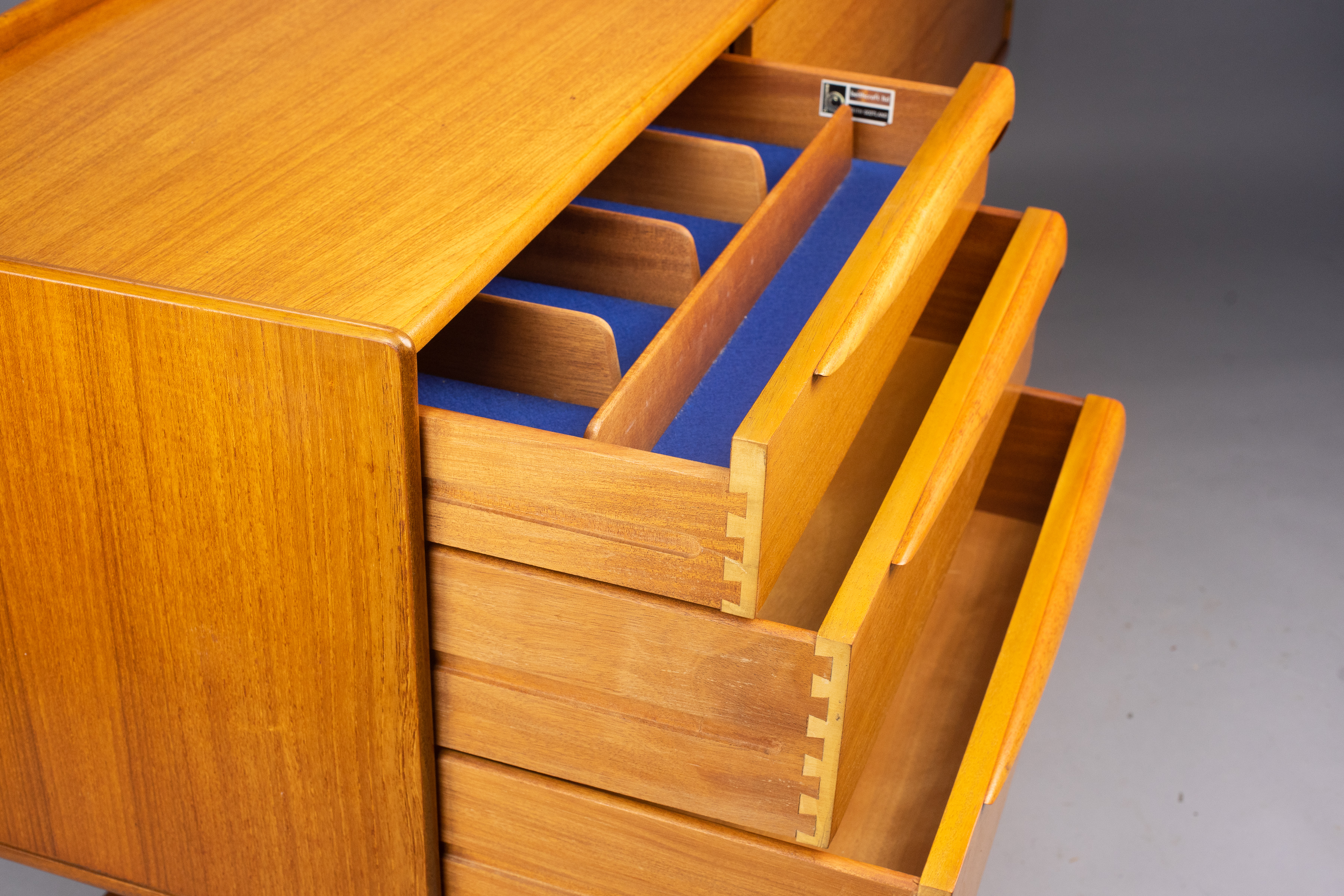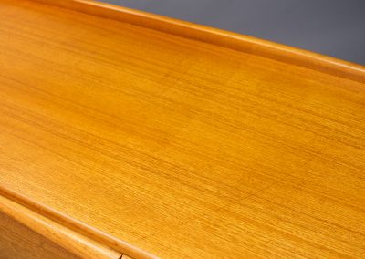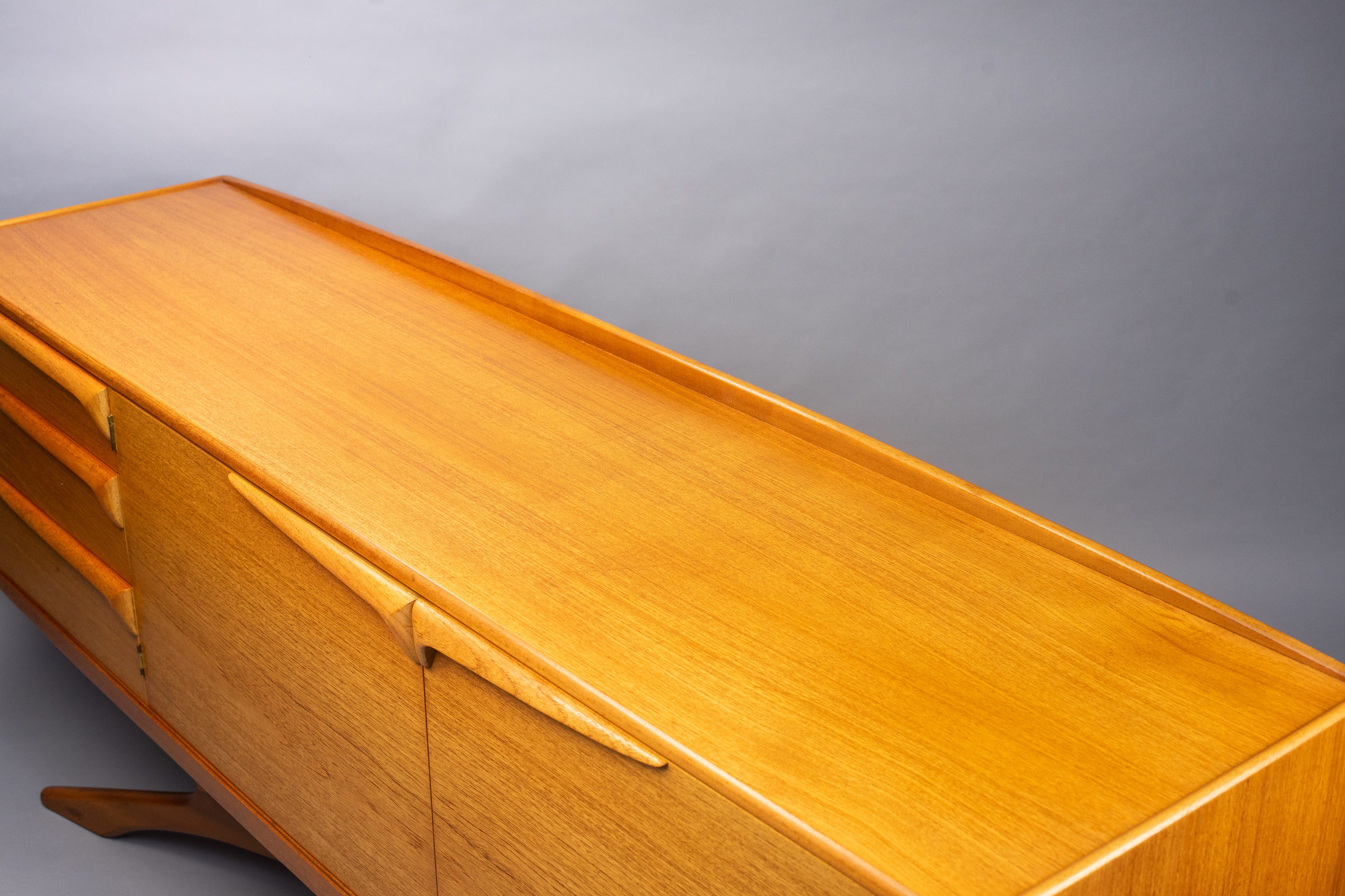 A very distinctive teak sideboard designed c.1970 by Val Rossi for high-end Scottish cabinet makers Beithcraft. Bears the original maker’s label.