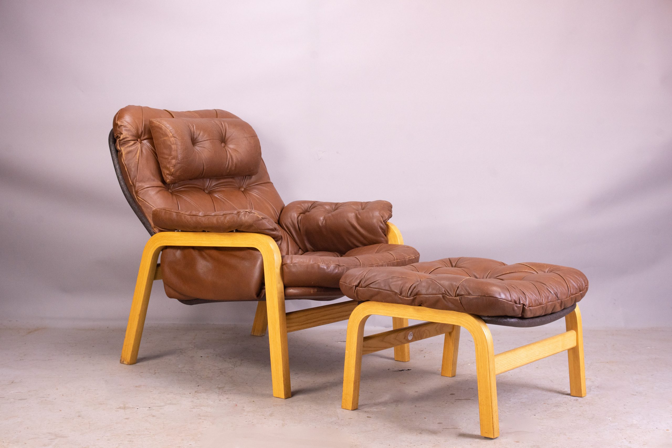 A rarely available Model 180 leather lounge chair and footstool set from CADO, Denmark.