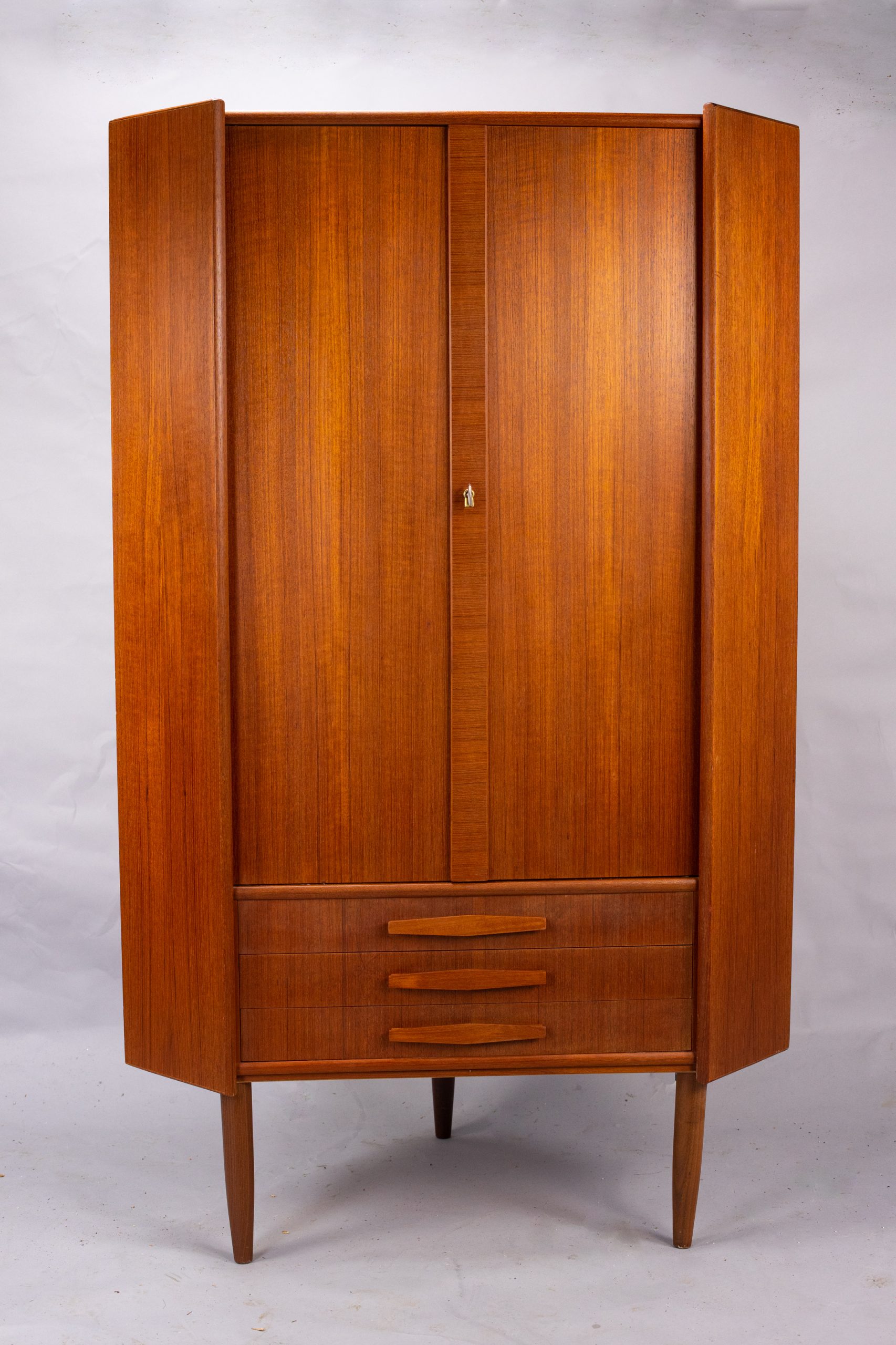 A beautiful and unusual Danish tall corner cabinet finished in teak.