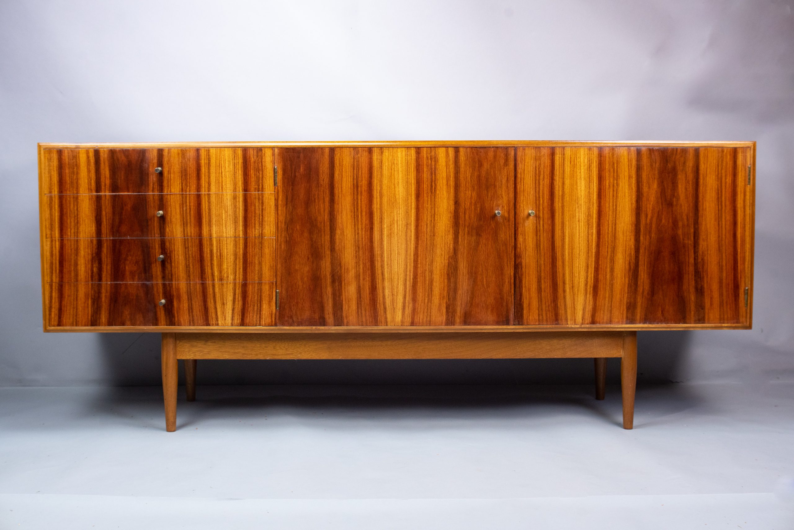 The sideboard has been restored and re-lacquered by hand with a brush lacquer and finished with beeswax polish. There are some minor blemishes in the wood, light signs of wear and a small repair at the back right-hand corner.