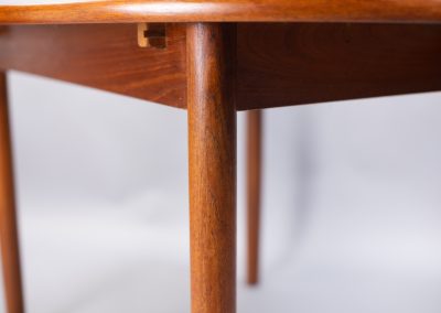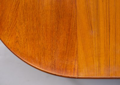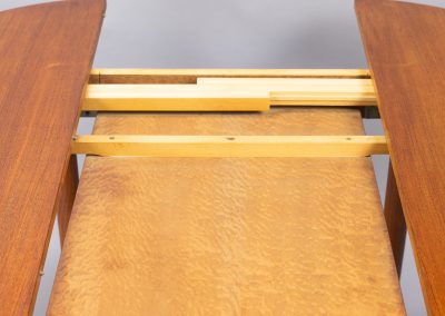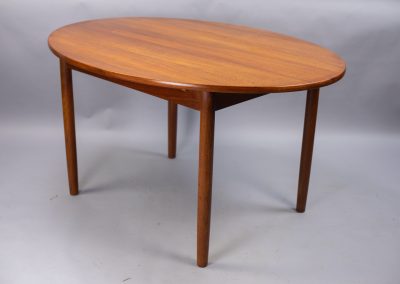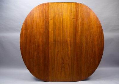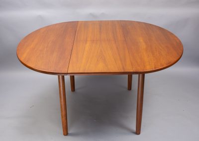 The company was renowned for fine quality English cabinet-making in designs that are often uncannily close to the work produced by Danish firm Omann Jun. Unusually, this teak table extends along its length making a rounder table when full size. The extension leaves are in a self-contained ‘butterfly’ mechanism