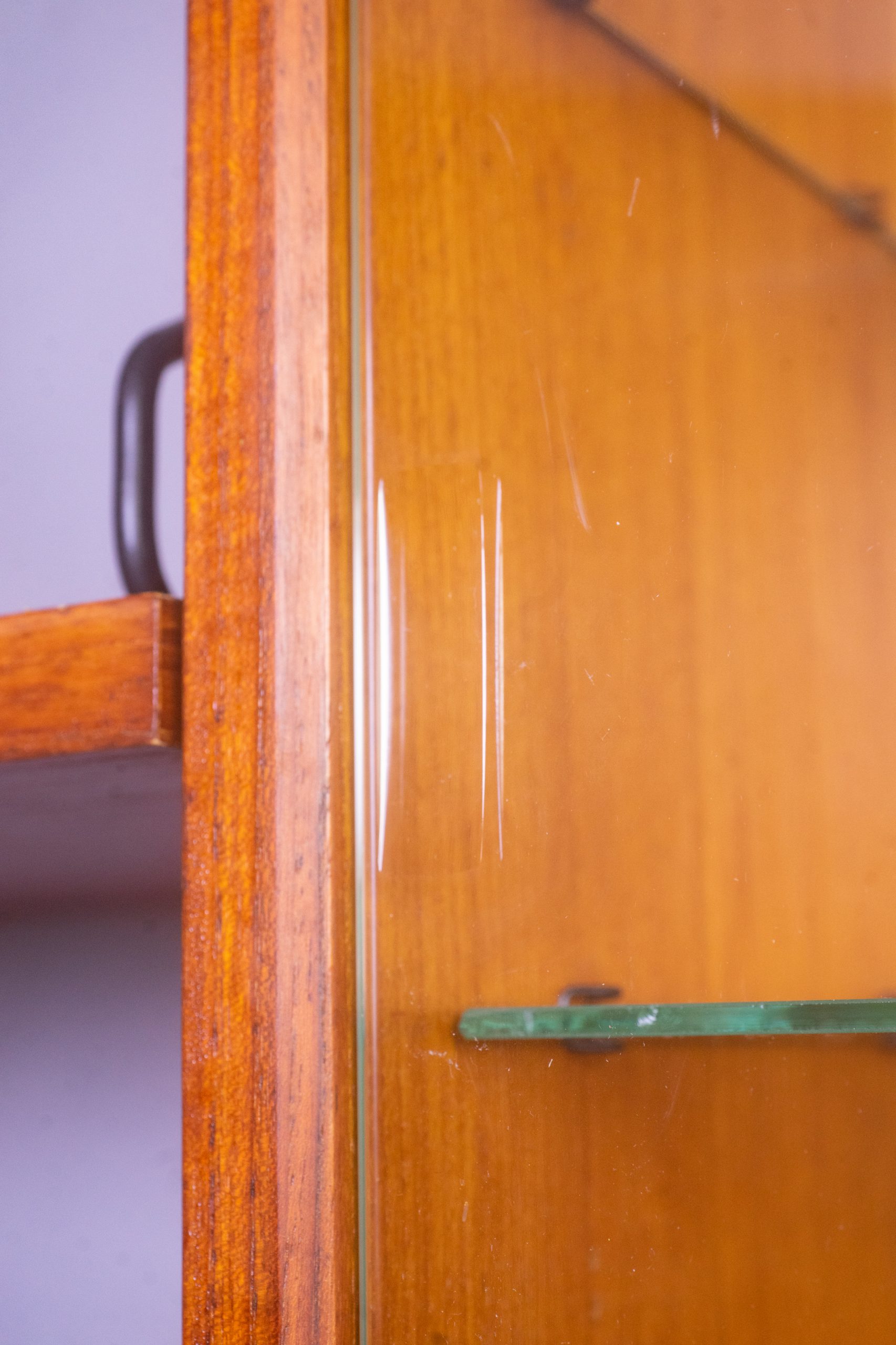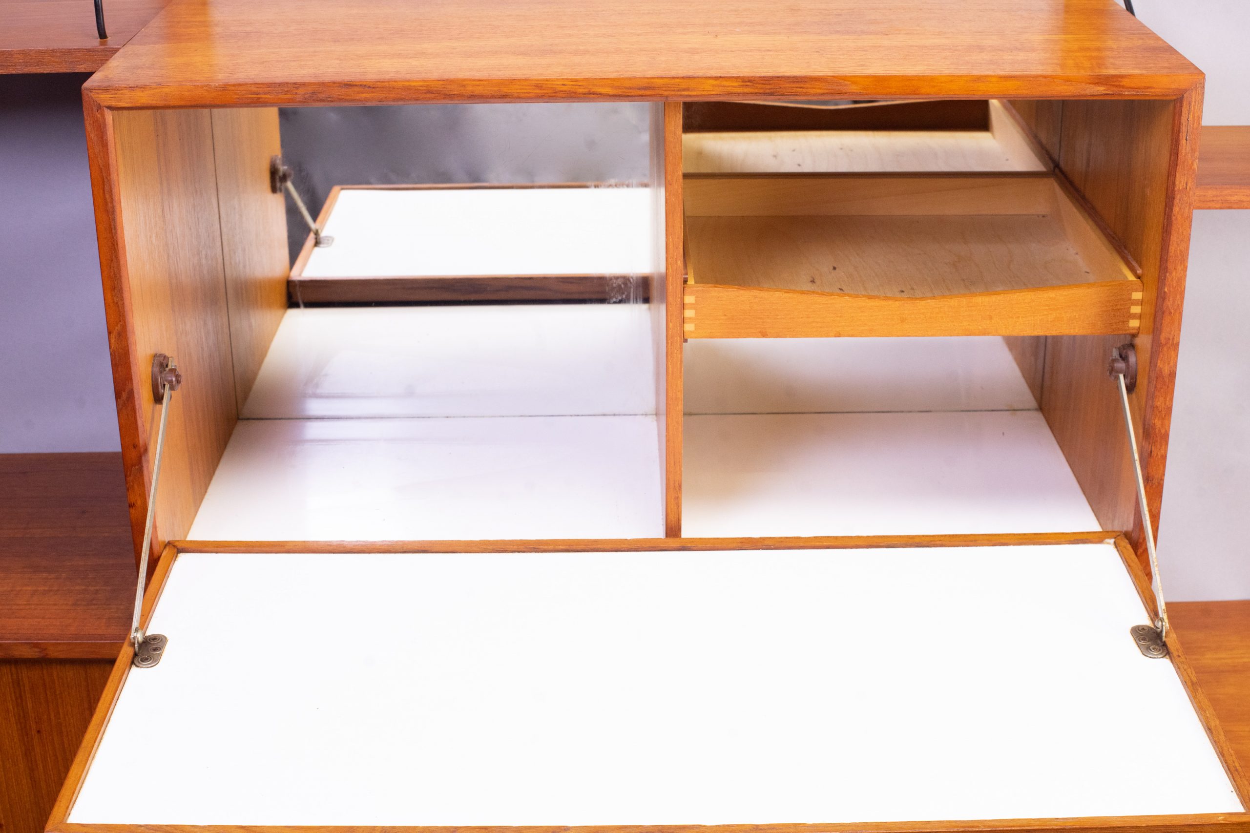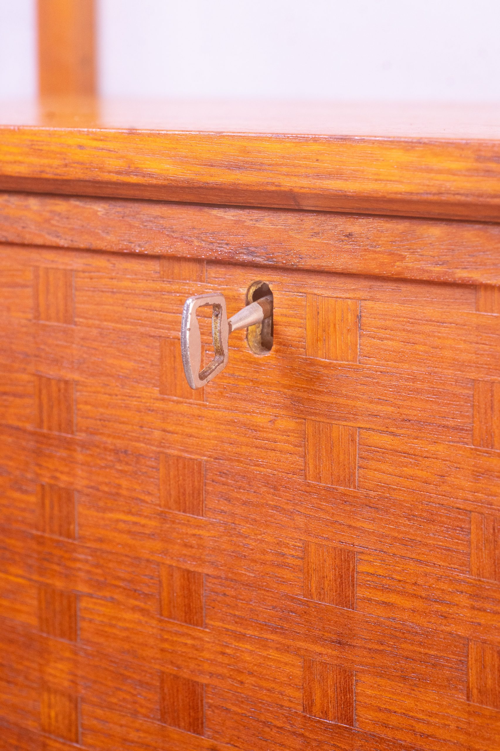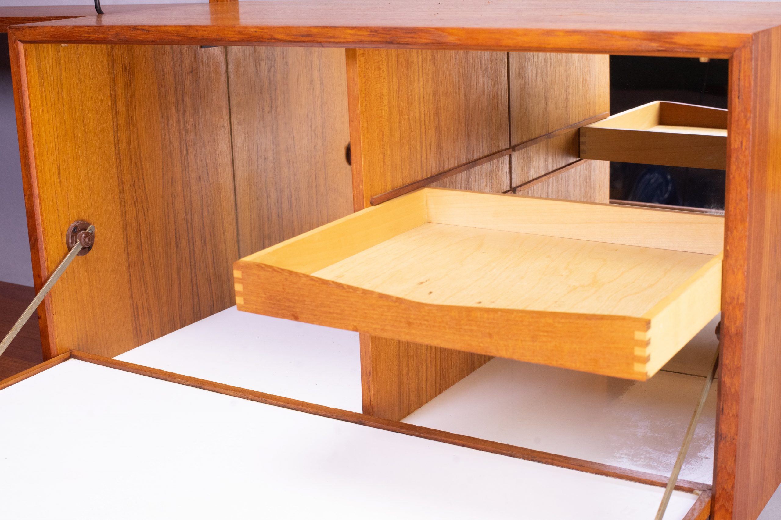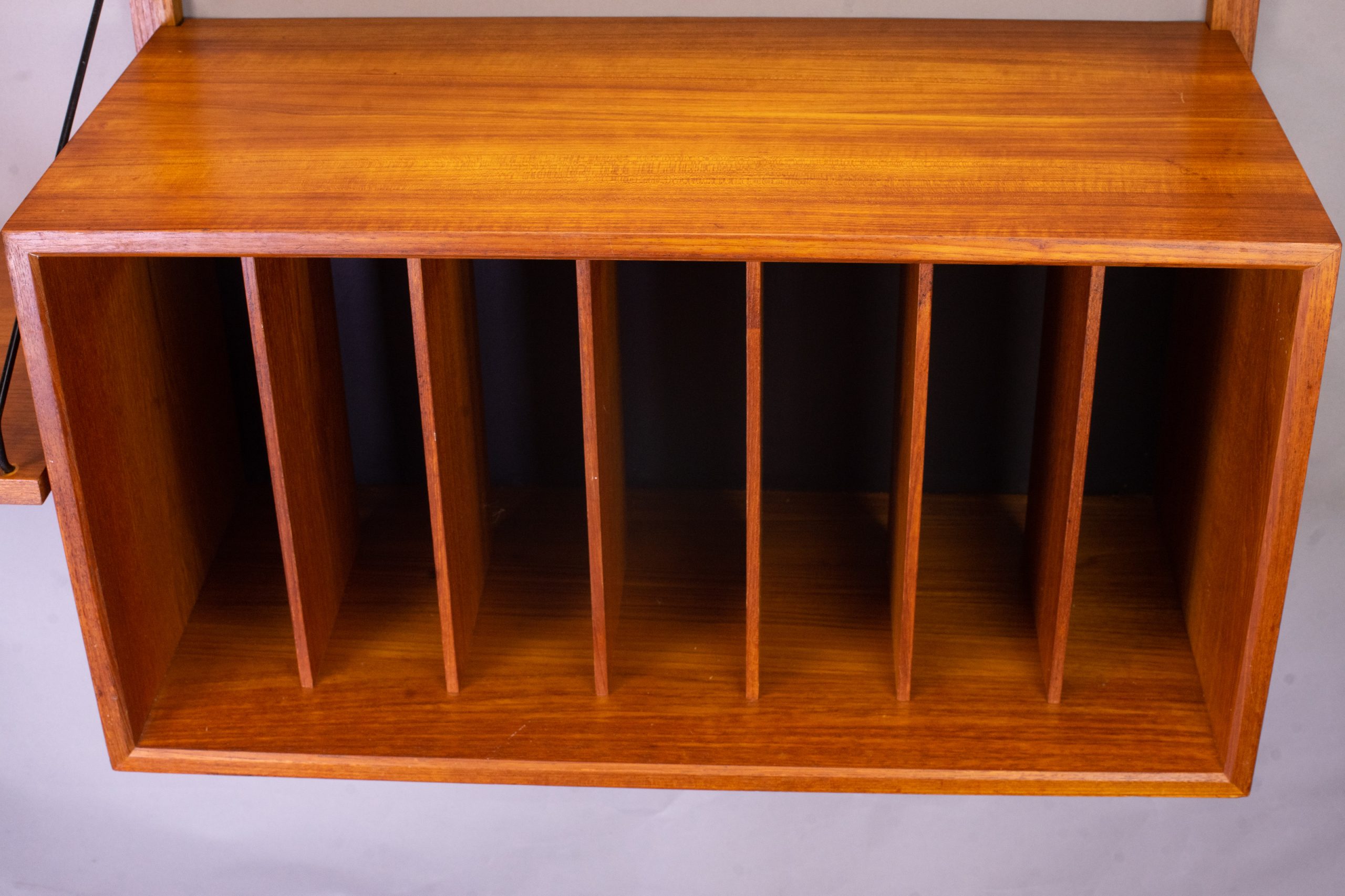 Finished in teak with solid teak wall rails and black-coated steel shelf hangers. This collection includes a cocktail cabinet unit with a distinctive basket-weave front, internal drawer, melamine interior floor, and mirrored back; a sliding-door cabinet with adjustable shelf; record cabinet; glass-fronted sliding-door display cabinet; and a selection of 9 shelves.
