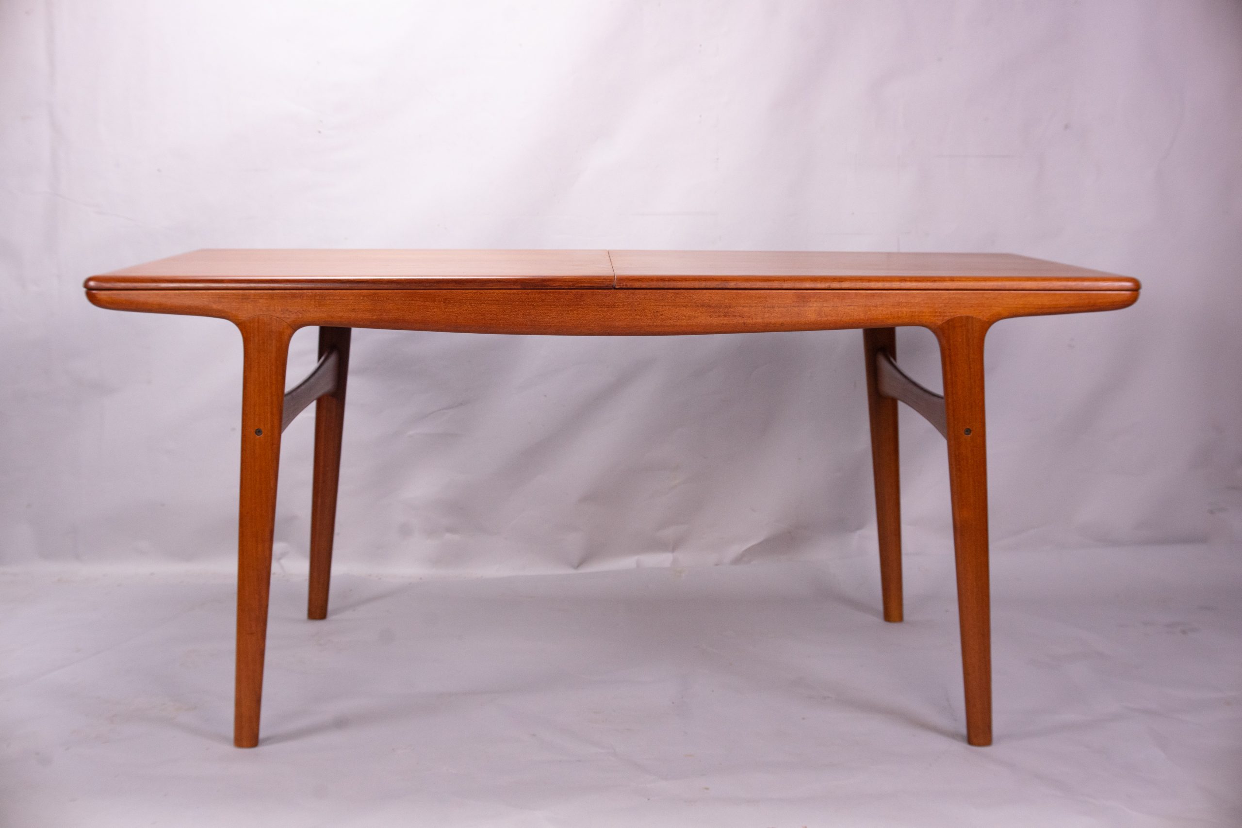 A classic 1960s Danish teak dining table Model MK 169 designed by Arne Hovmand Olsen for Mogens Kold. Rounded edges and organic curves with the distinctively shaped stretchers that taper to the middle. The two extension leaves can be stored underneath when not in use. Very good restored condition; light signs of wear and use consistent with age (see photos).