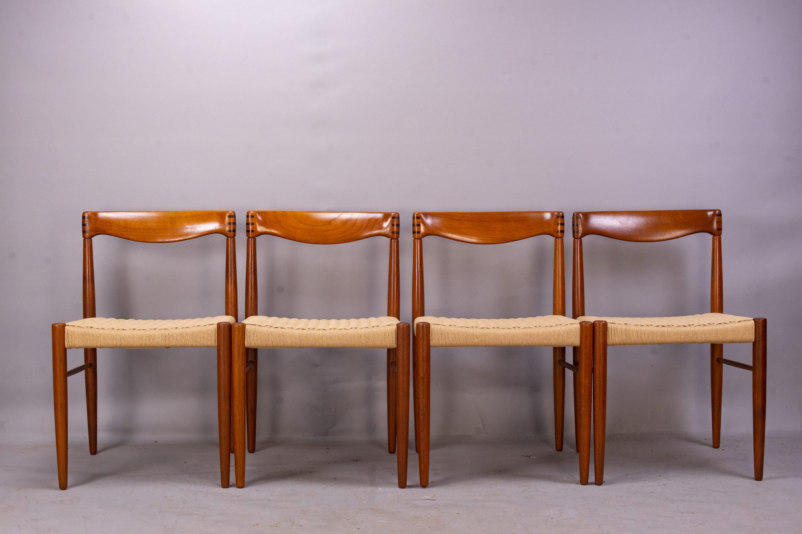 A set of four elegant teak dining chairs designed by HW Klein for the high-quality manufacturer Bramin in Denmark in the 1960s.
