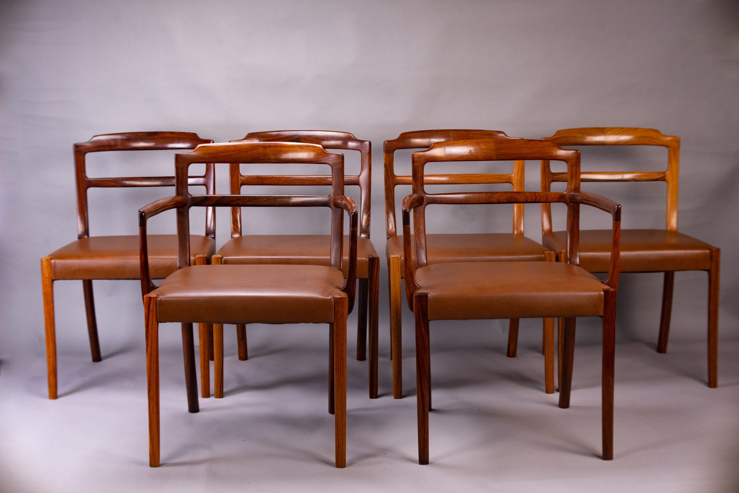 A luxurious set of six dining chairs (two carvers; four chairs) designed by Ole Wanscher for CADO, Denmark in the 1960s. In very good original condition. Solid rosewood frames in a highly polished finish with gently curving lines and a distinctive finger-joint detail in the back rail. Real leather upholstery, smooth texture and brown ochre in colour.