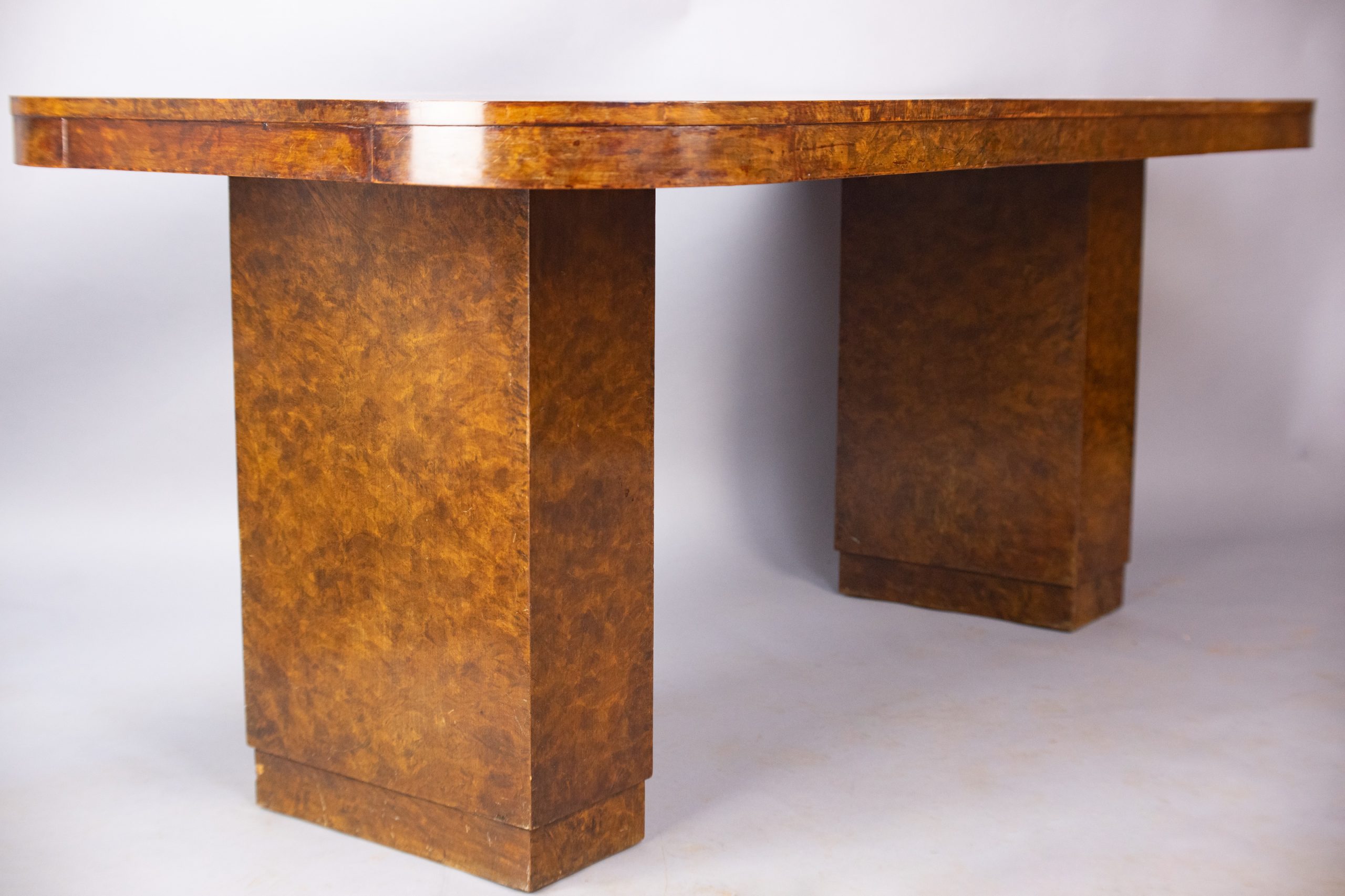 Burr maple top with rounded corners supported on two rectangular pedestals decorated with a faux burr woodgrain effect of the type used in many Biedermeier style pieces. It appears that at some point in the table’s history it has been modified from being a fixed 6ft x 3ft table to having a central section that can be removed to produce a smaller 4ft wide table or re-extended when required. The convoluted flowing grain of the table top veneer does have some historic flaws and signs of wear but remains stunningly beautiful to look at.
