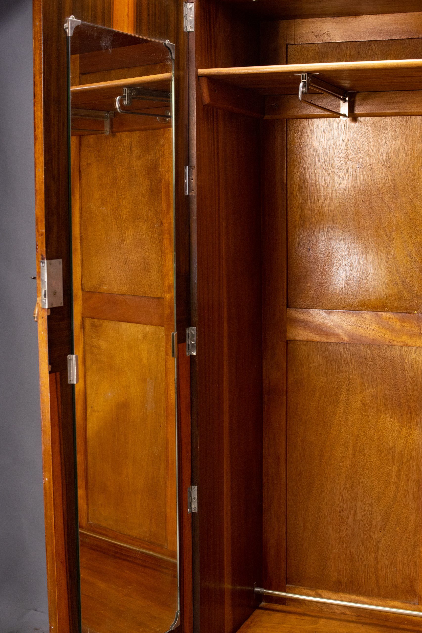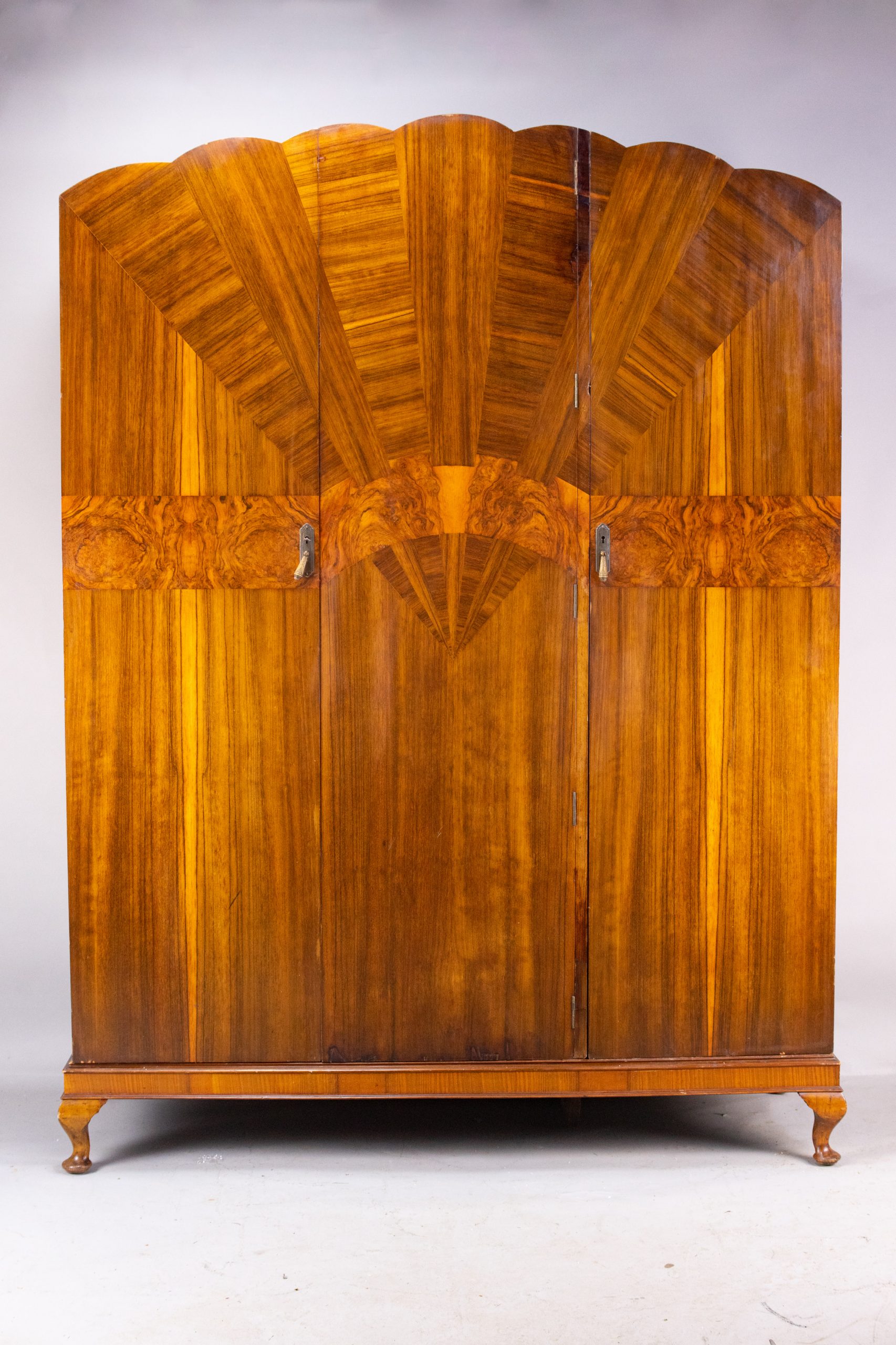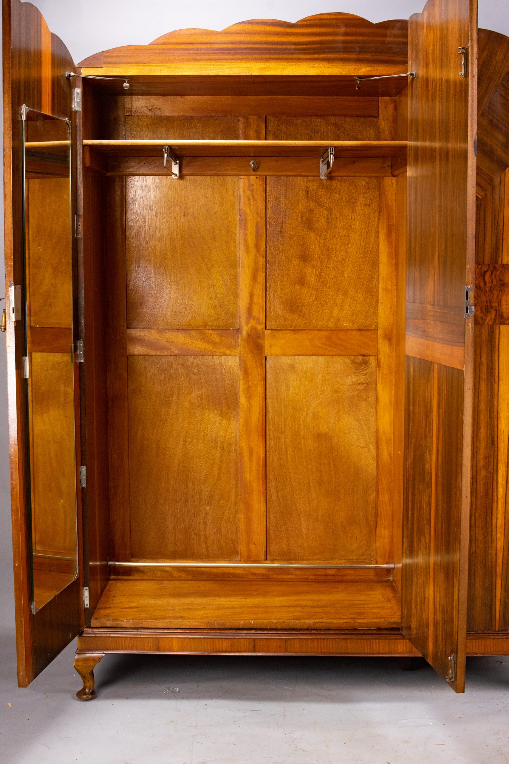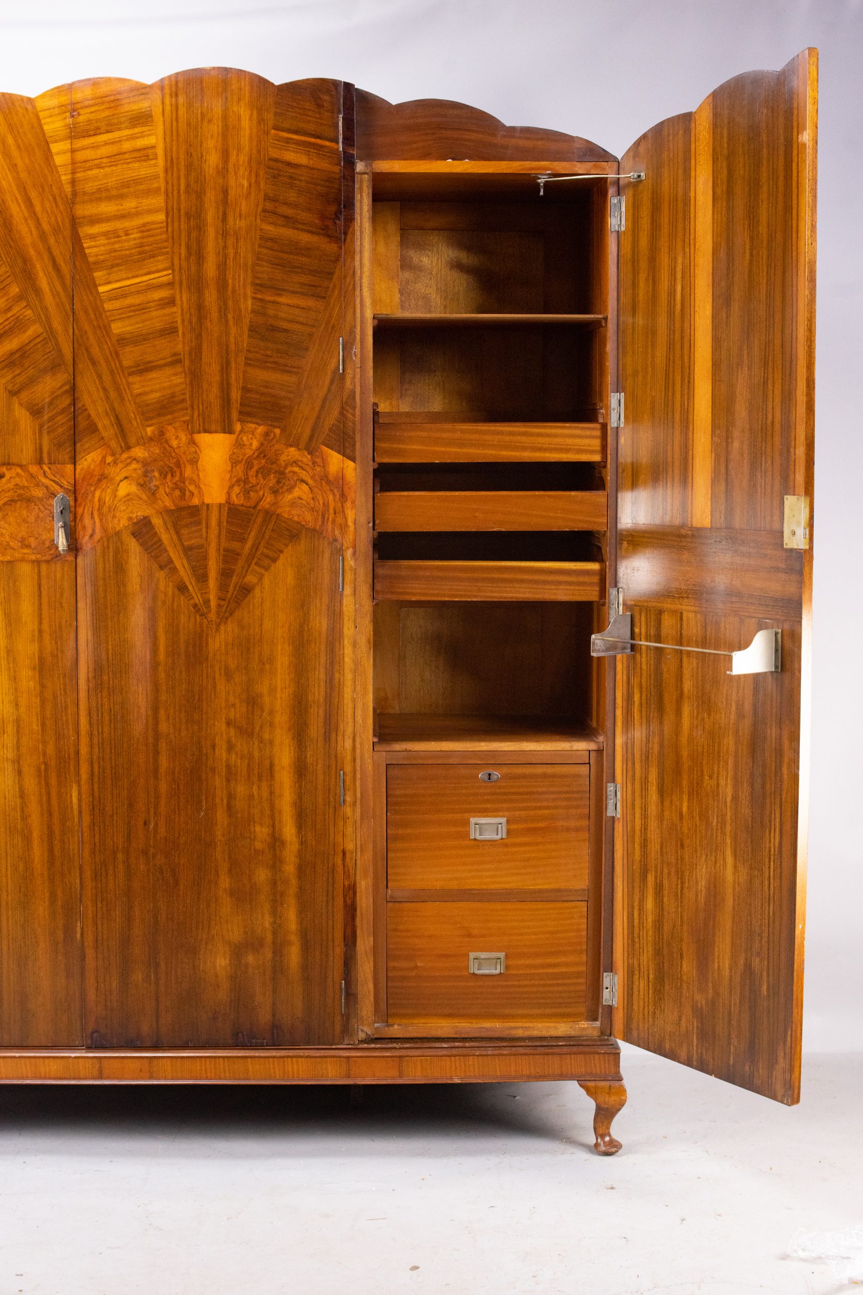 with mahogany interior and side panels. Distinctive marquetry fan design across the front ending in a scalloped edge along the top. Sits on a base plinth with cabriole legs. Chrome-plated brass drop door handles with engraved detail. Heavy and high-quality construction with particularly fine decorative veneers applied to a solid wood casing. Full-length double-door hanging space on the left-hand side with two pull-out hanging rails, shoe rail, shelf, and mirror. Behind the right-hand door there are two deep box drawers with campaign handles, three shallow drawers, shelves, and a metal hanging rail inside the door.