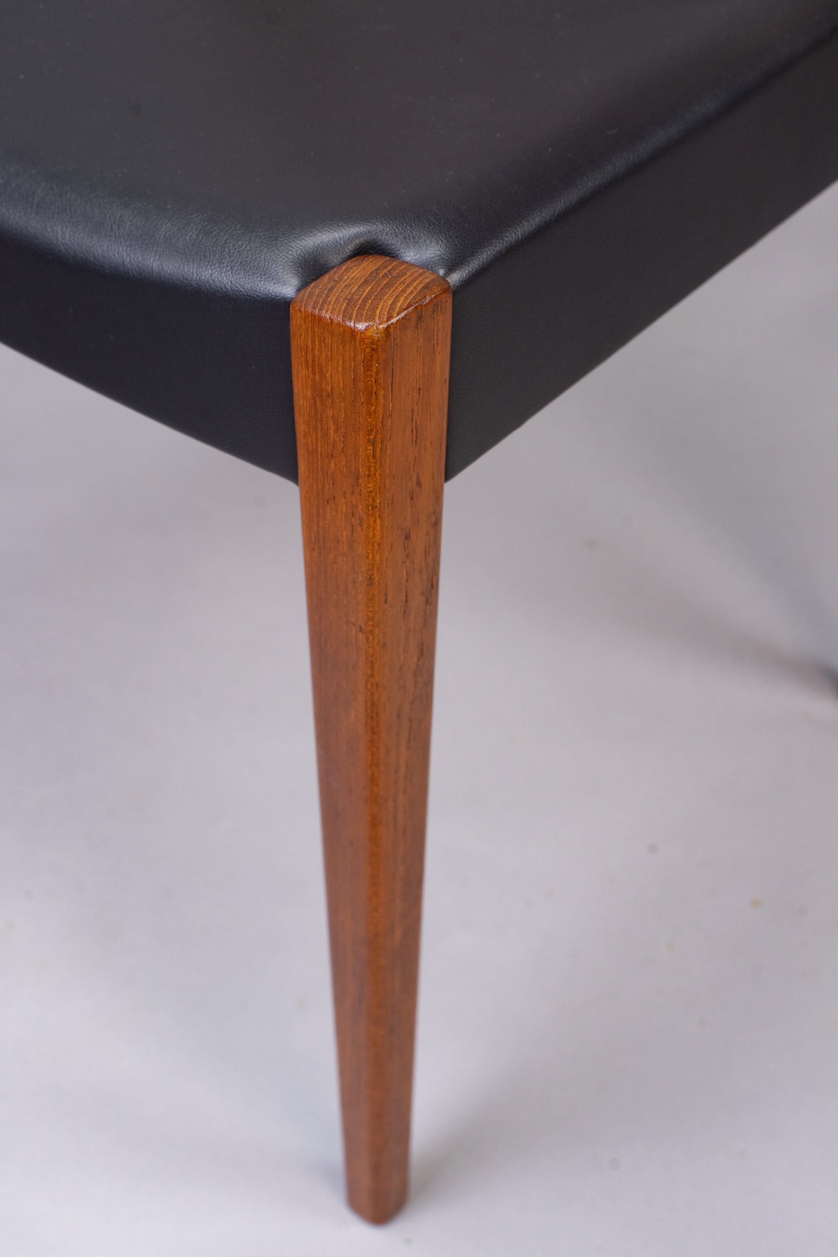 The frames are made of solid teak of very fine quality and are in good original condition with just minor signs of wear. The chairs can be unbolted for transport or storage. The wood has been gently cleaned and oiled to revive the natural beauty of the teak grain. All the seats have been newly reupholstered in high-quality black vinyl leather and new foam to meet current UK fire regulations.
