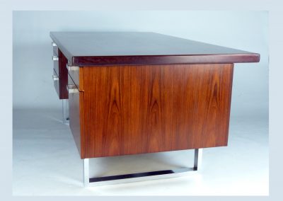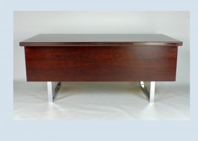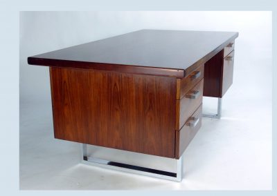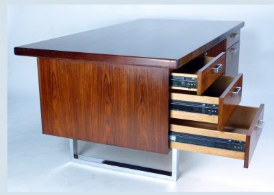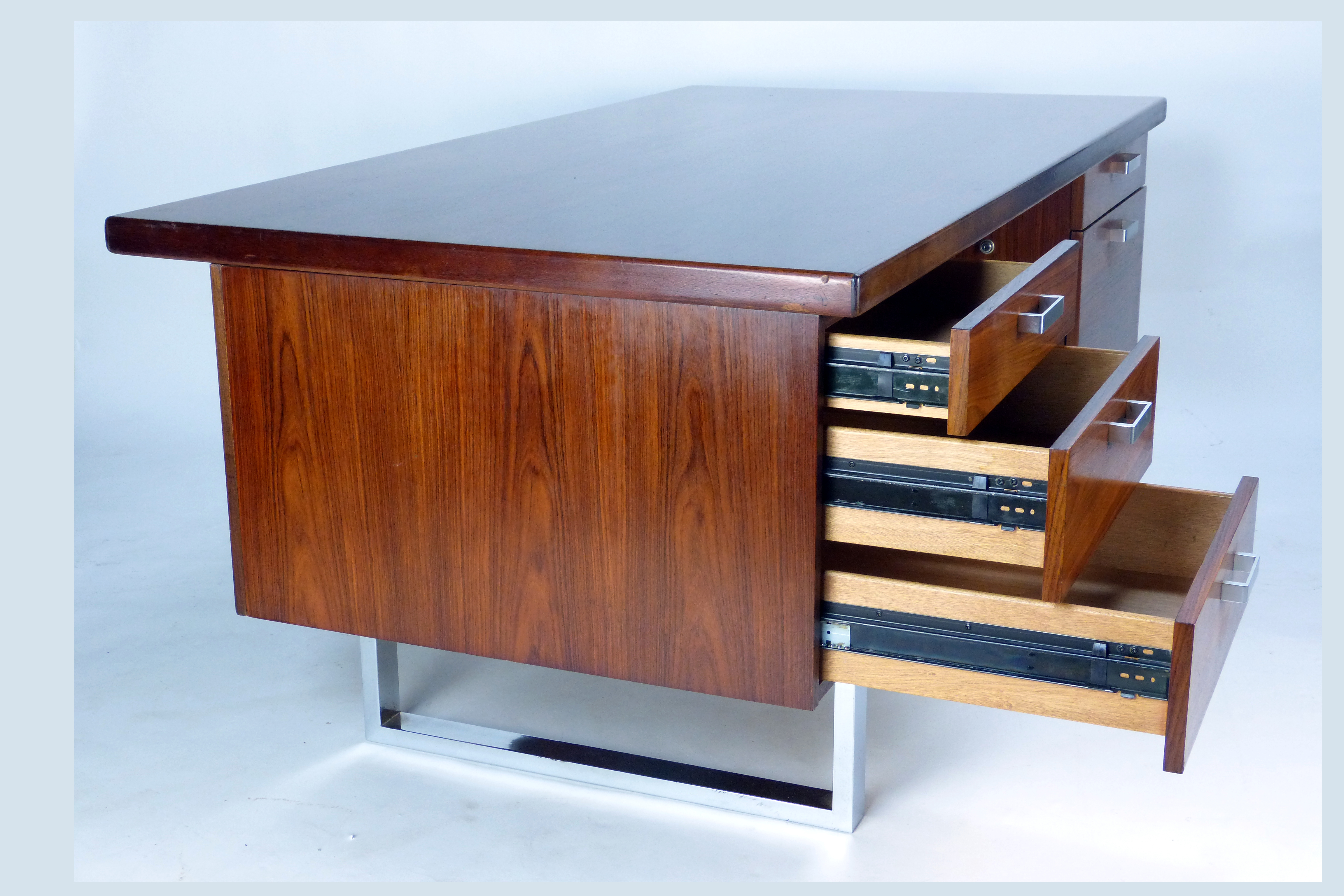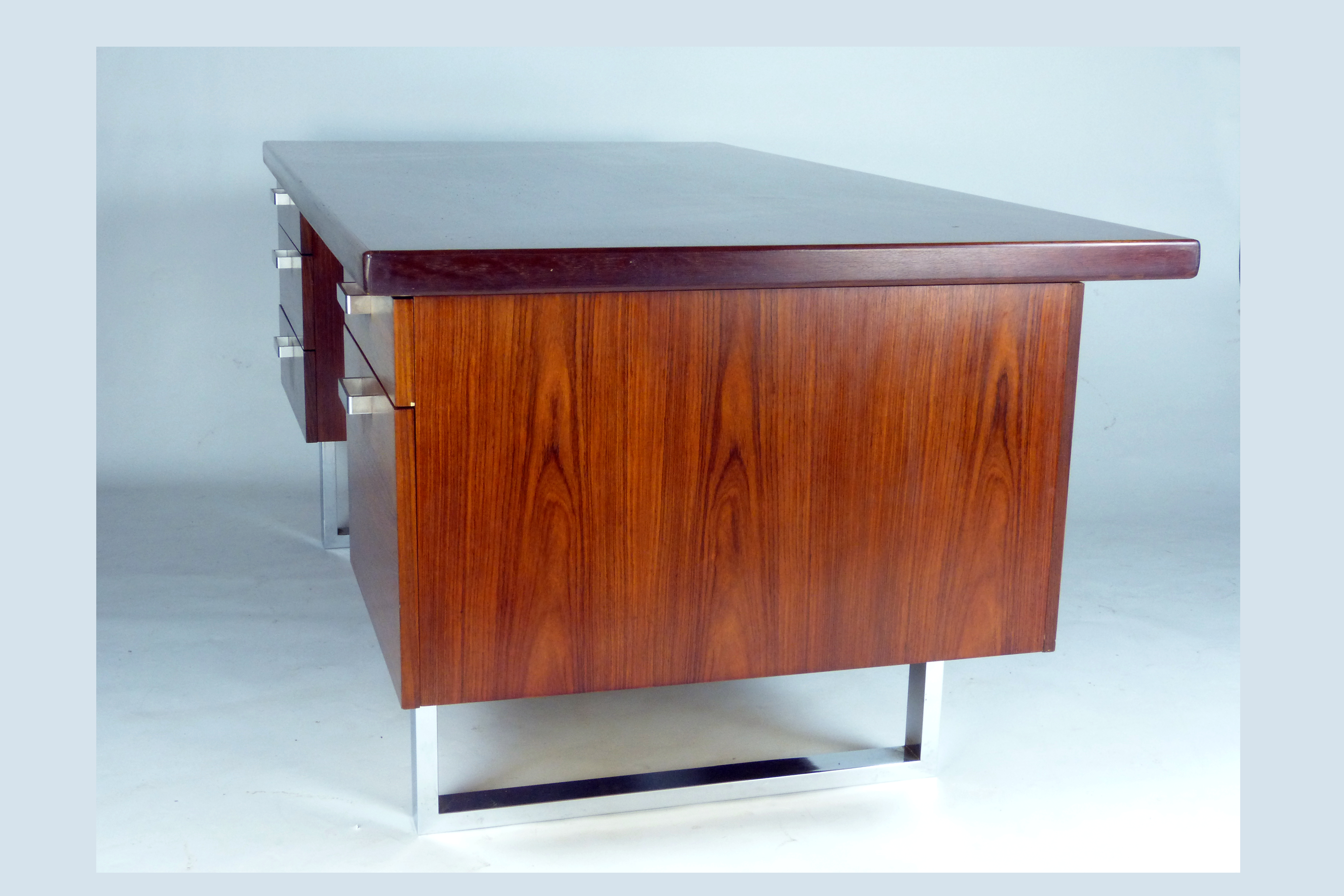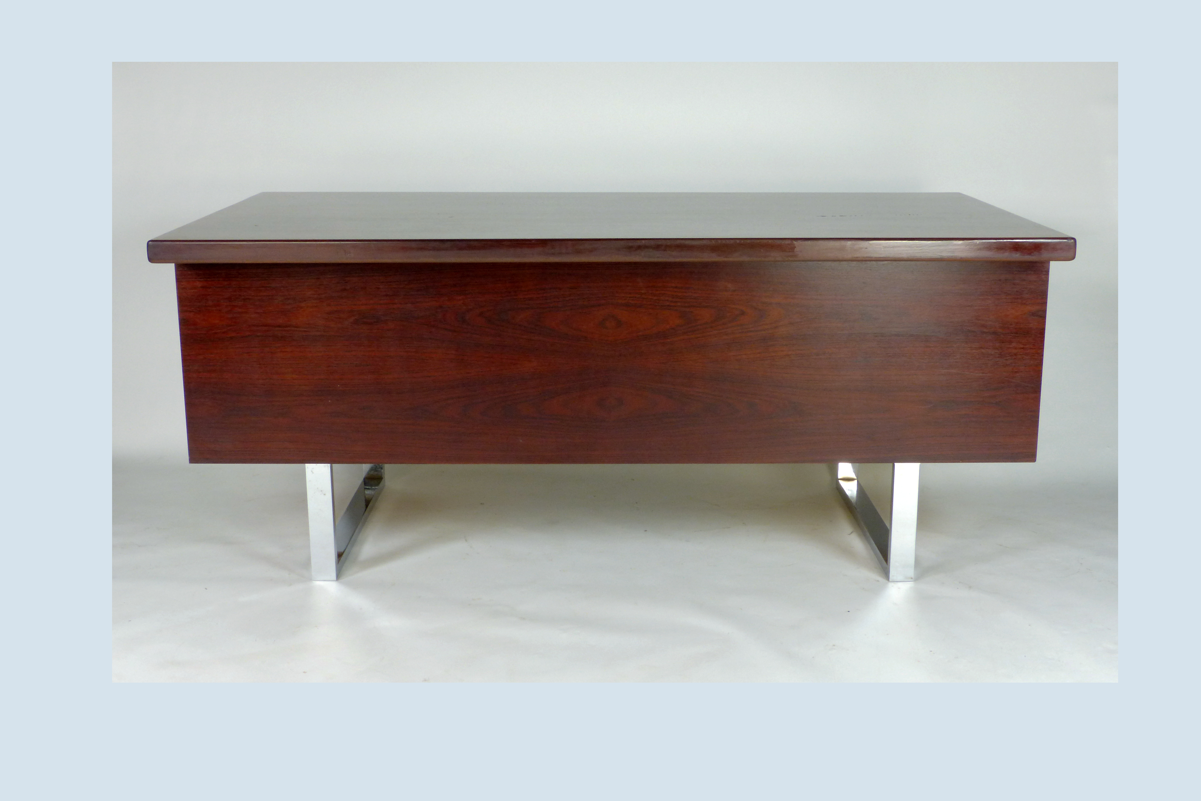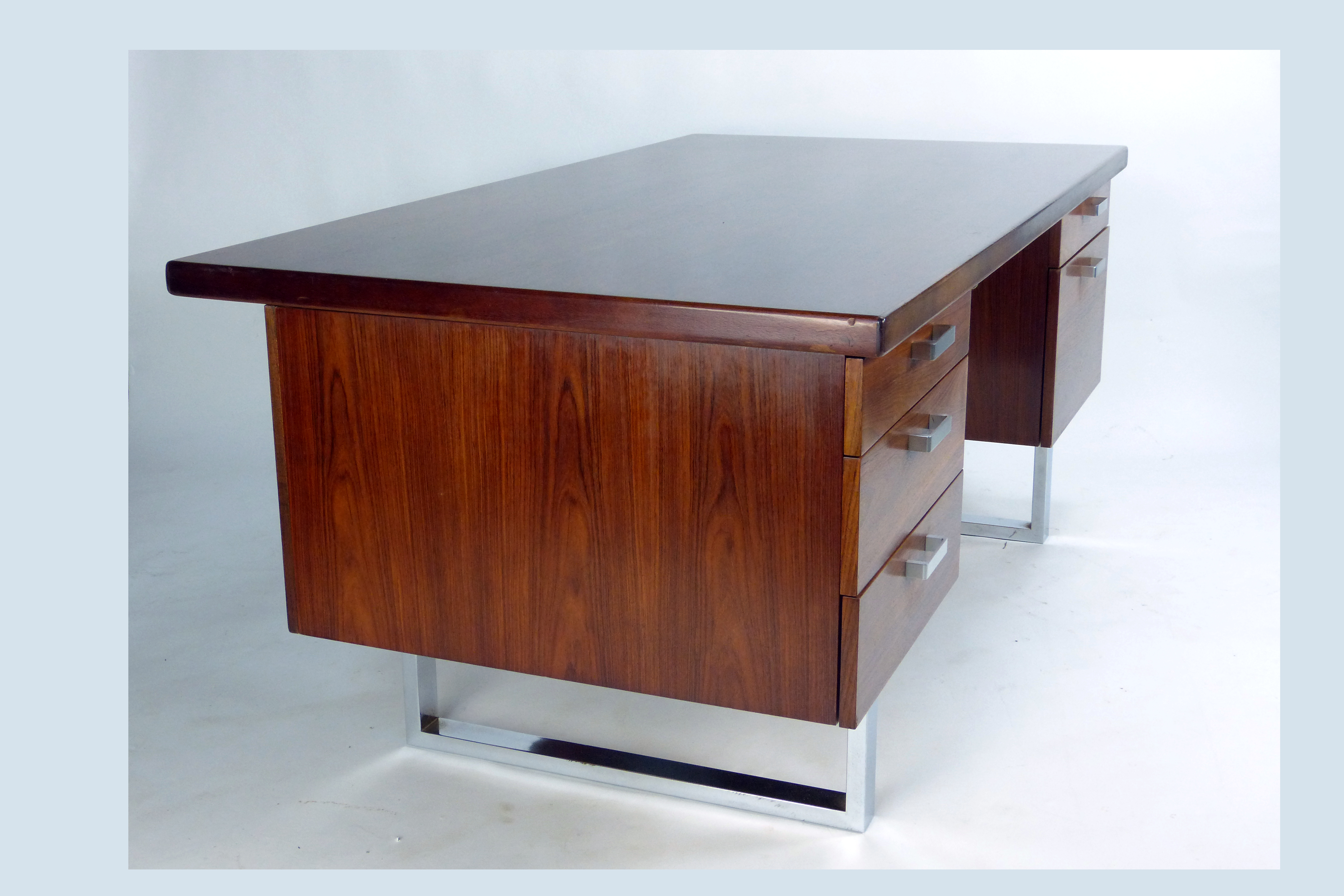 Clean minimalist lines and superb retro styling. The substantial rosewood desktop sits on graduated drawers on one side; and a drawer with tray insert, plus a deep filing drawer on the other: all supported on simple, angular, polished chrome legs. There is a very small repair to one corner of the larger drawer (see photos) but otherwise in excellent condition. The original locks are open, but sadly the key is not present.