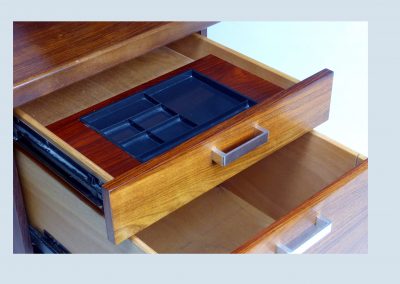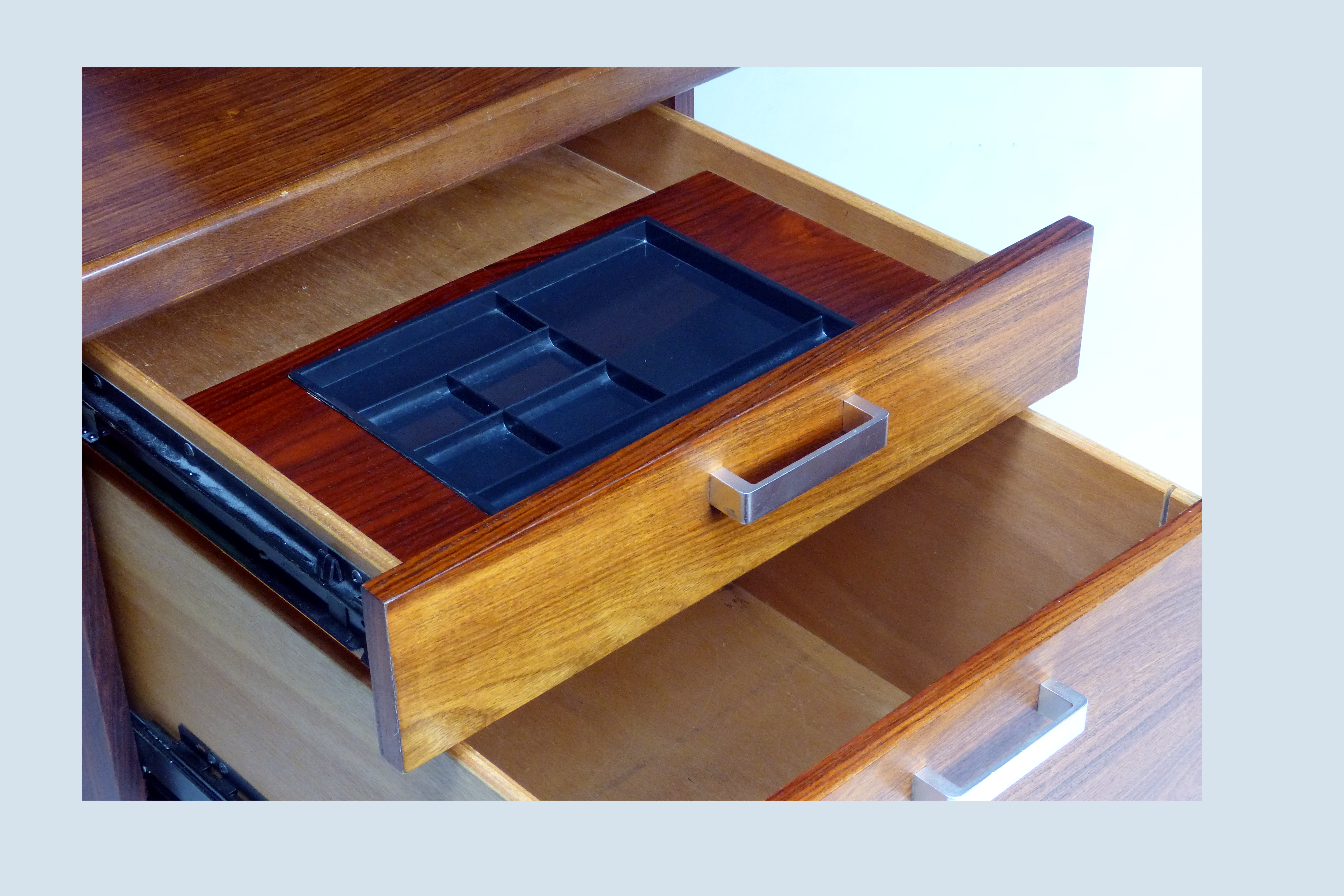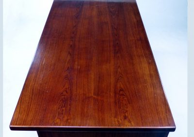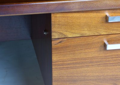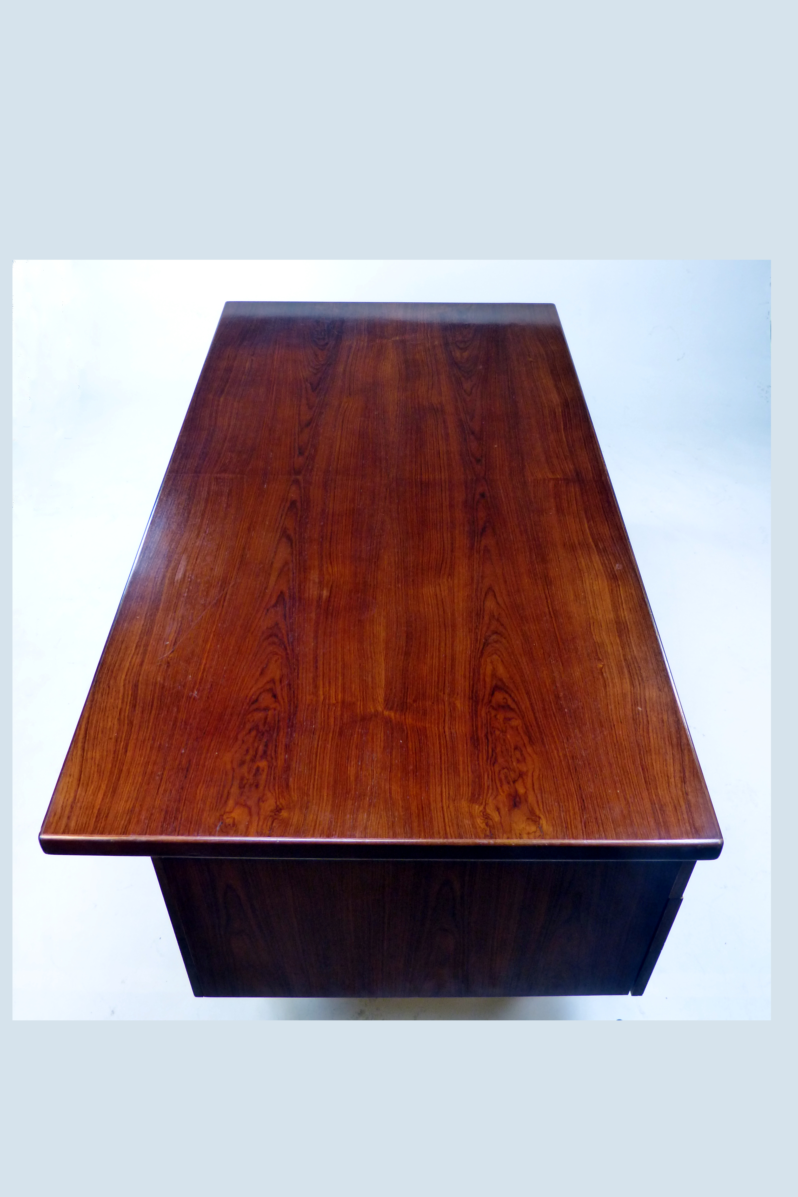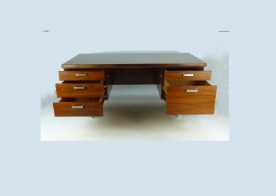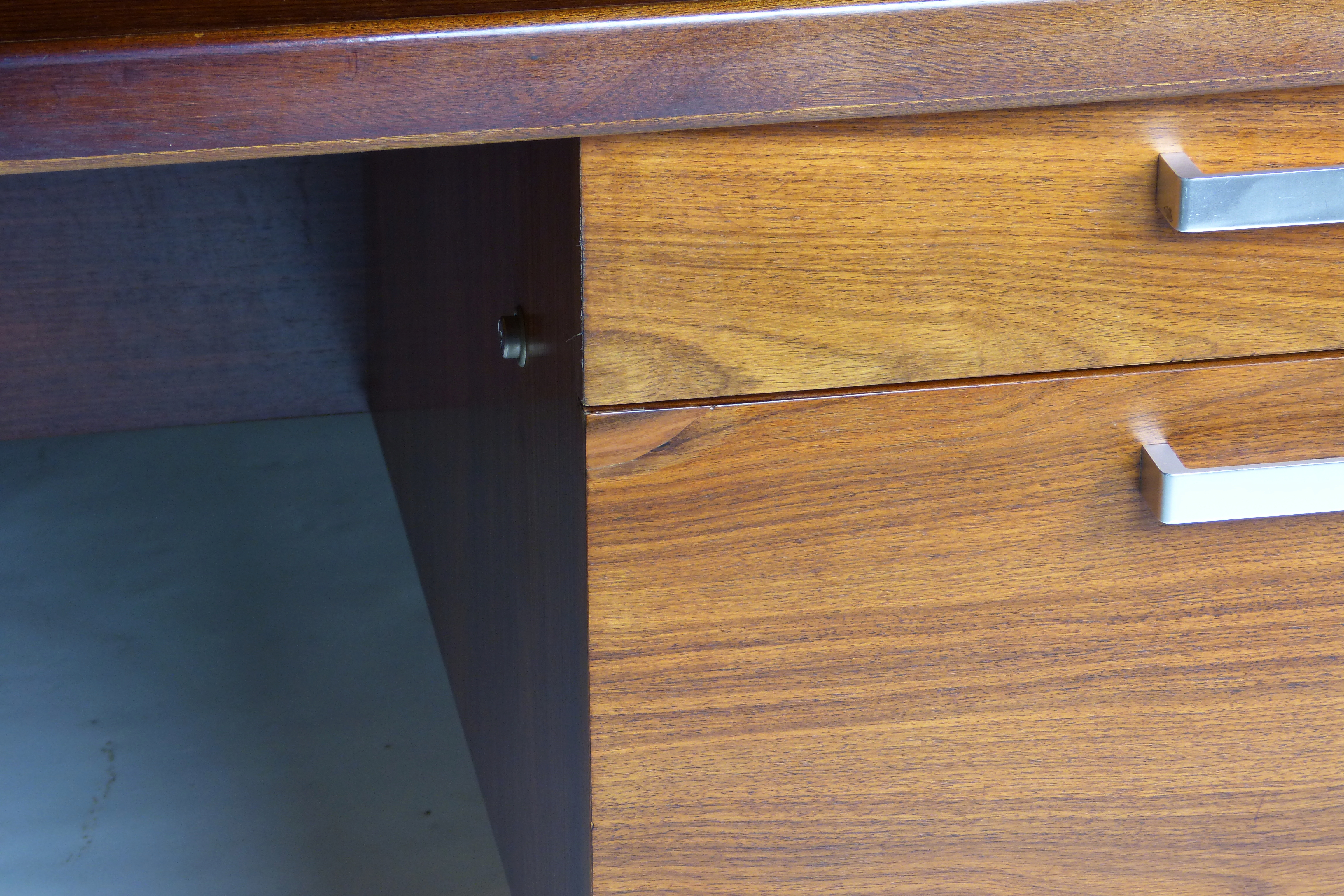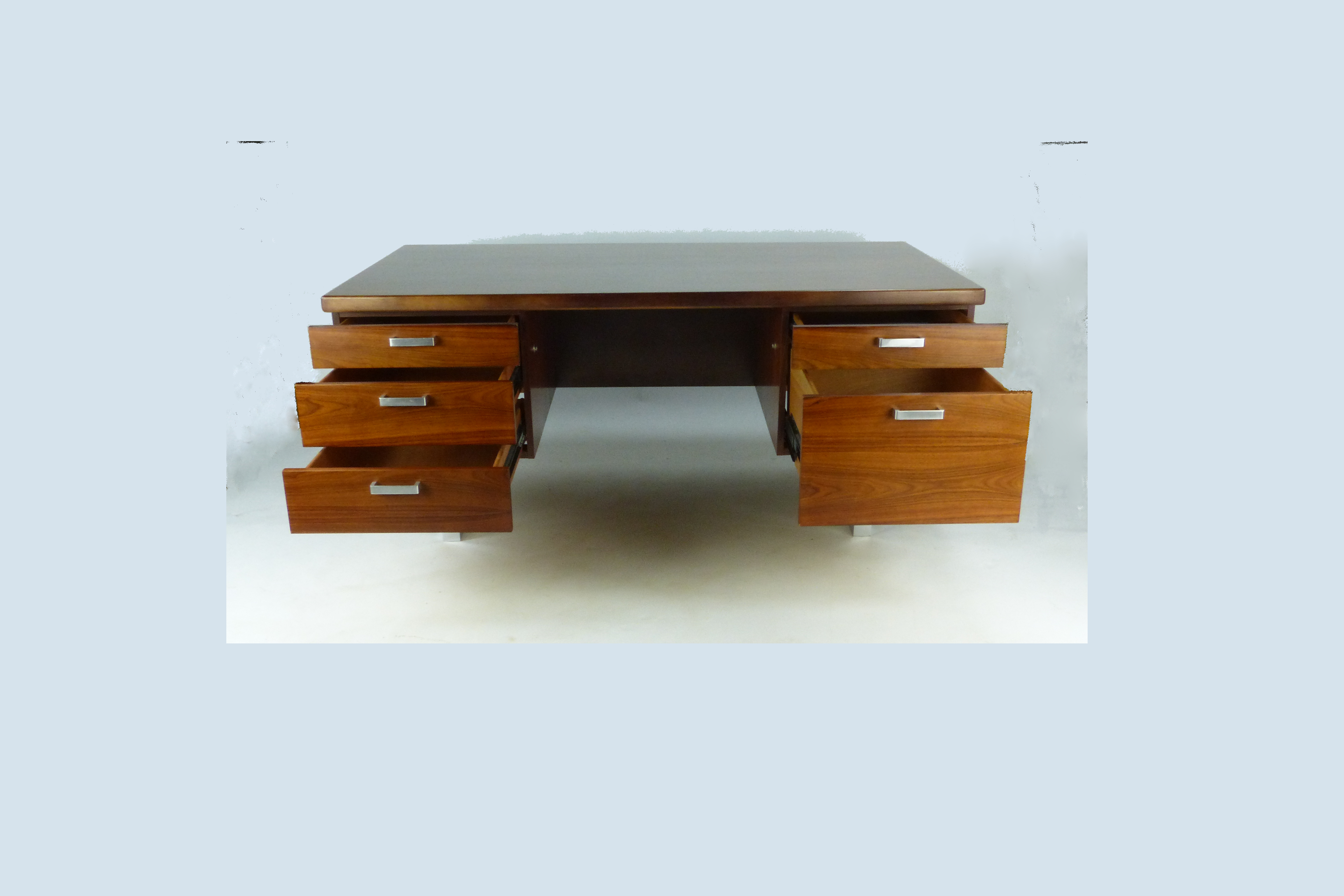 Clean minimalist lines and superb retro styling. The substantial rosewood desktop sits on graduated drawers on one side; and a drawer with tray insert, plus a deep filing drawer on the other: all supported on simple, angular, polished chrome legs. There is a very small repair to one corner of the larger drawer (see photos) but otherwise in excellent condition. The original locks are open, but sadly the key is not present.