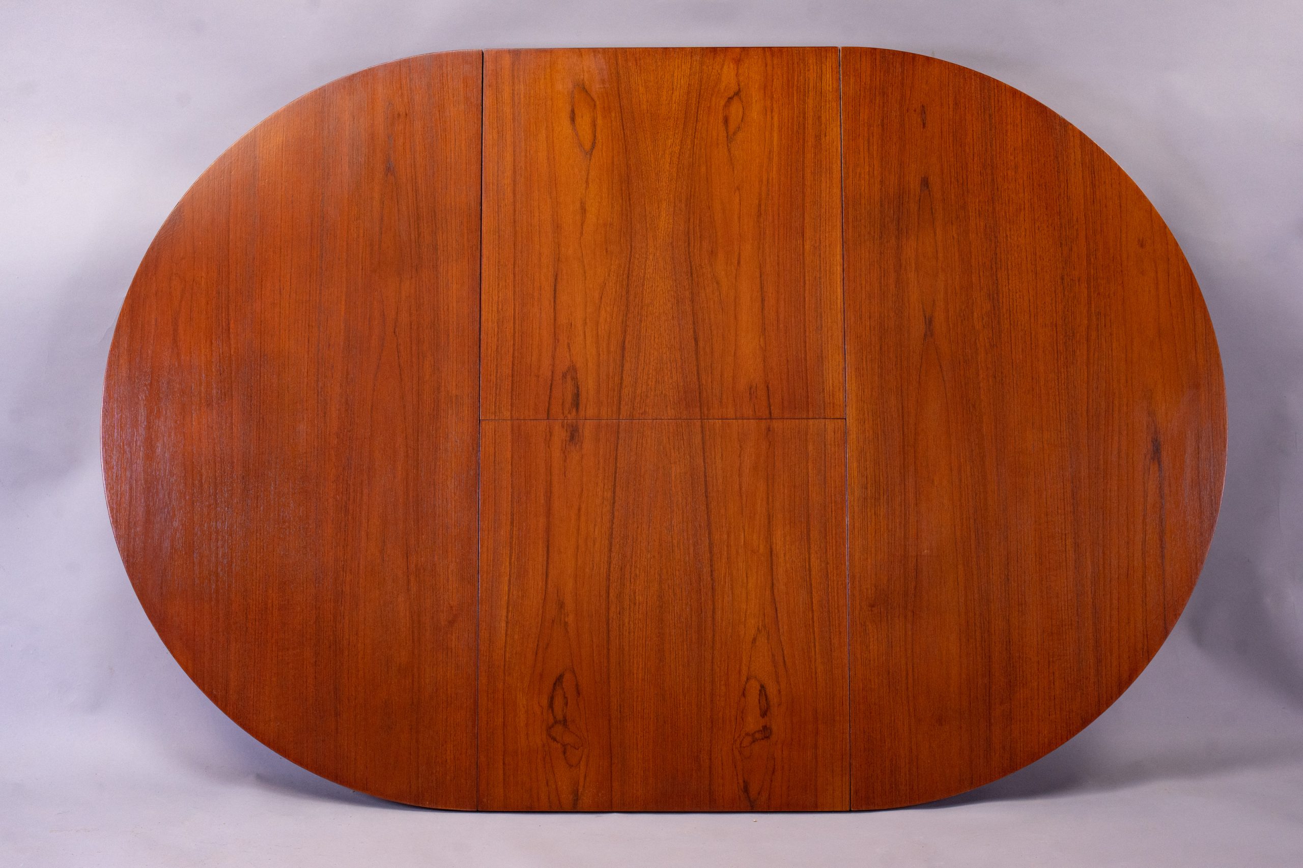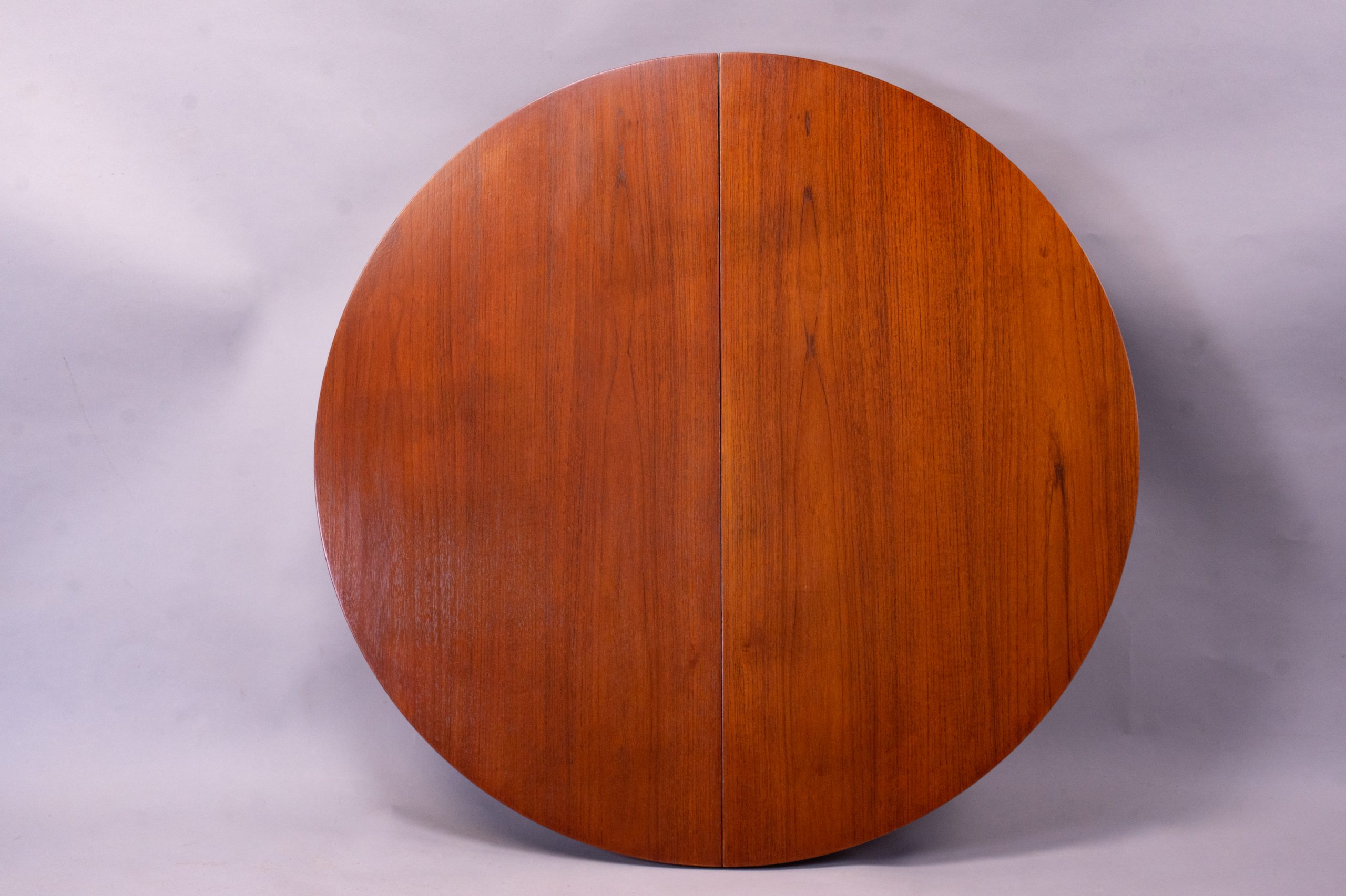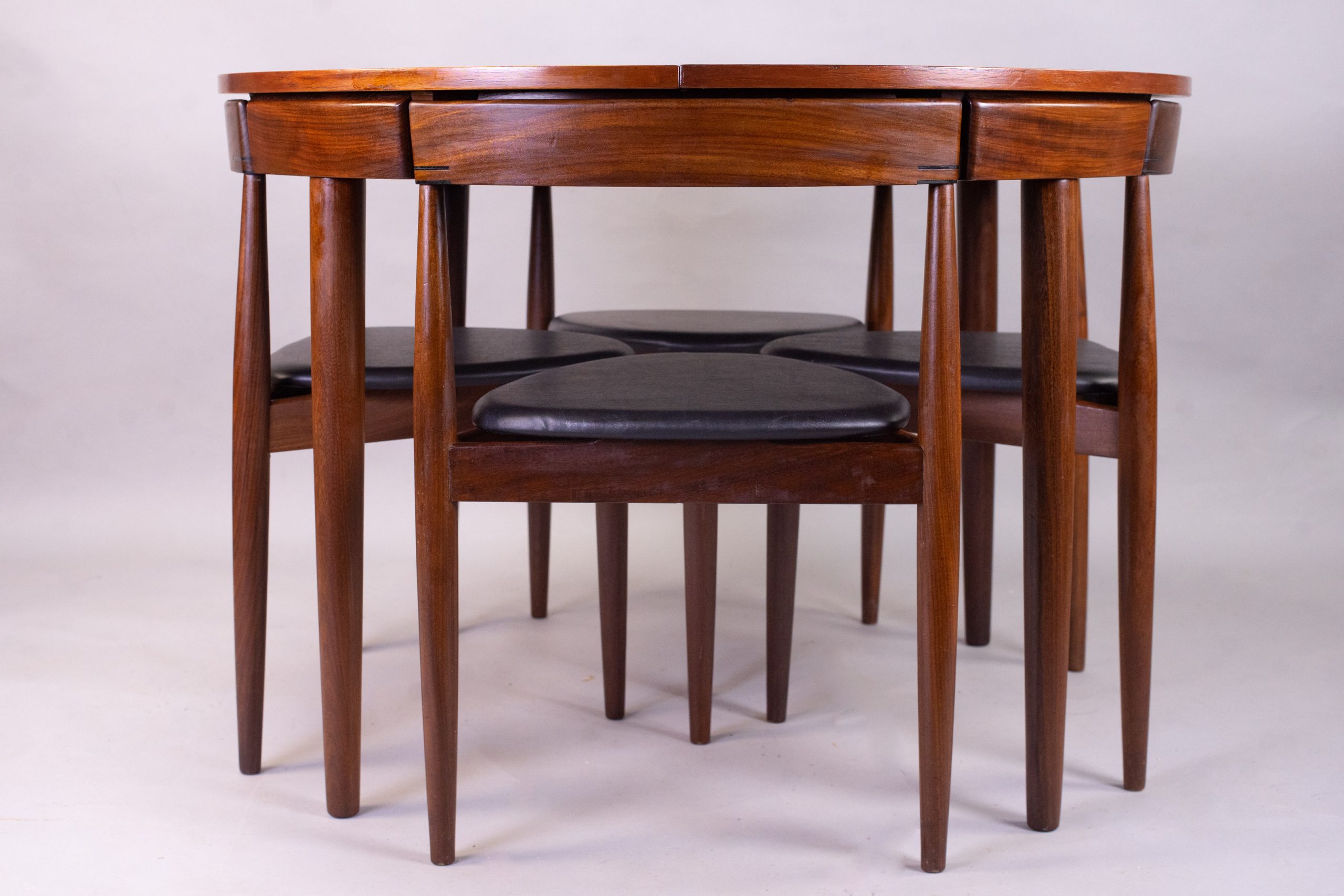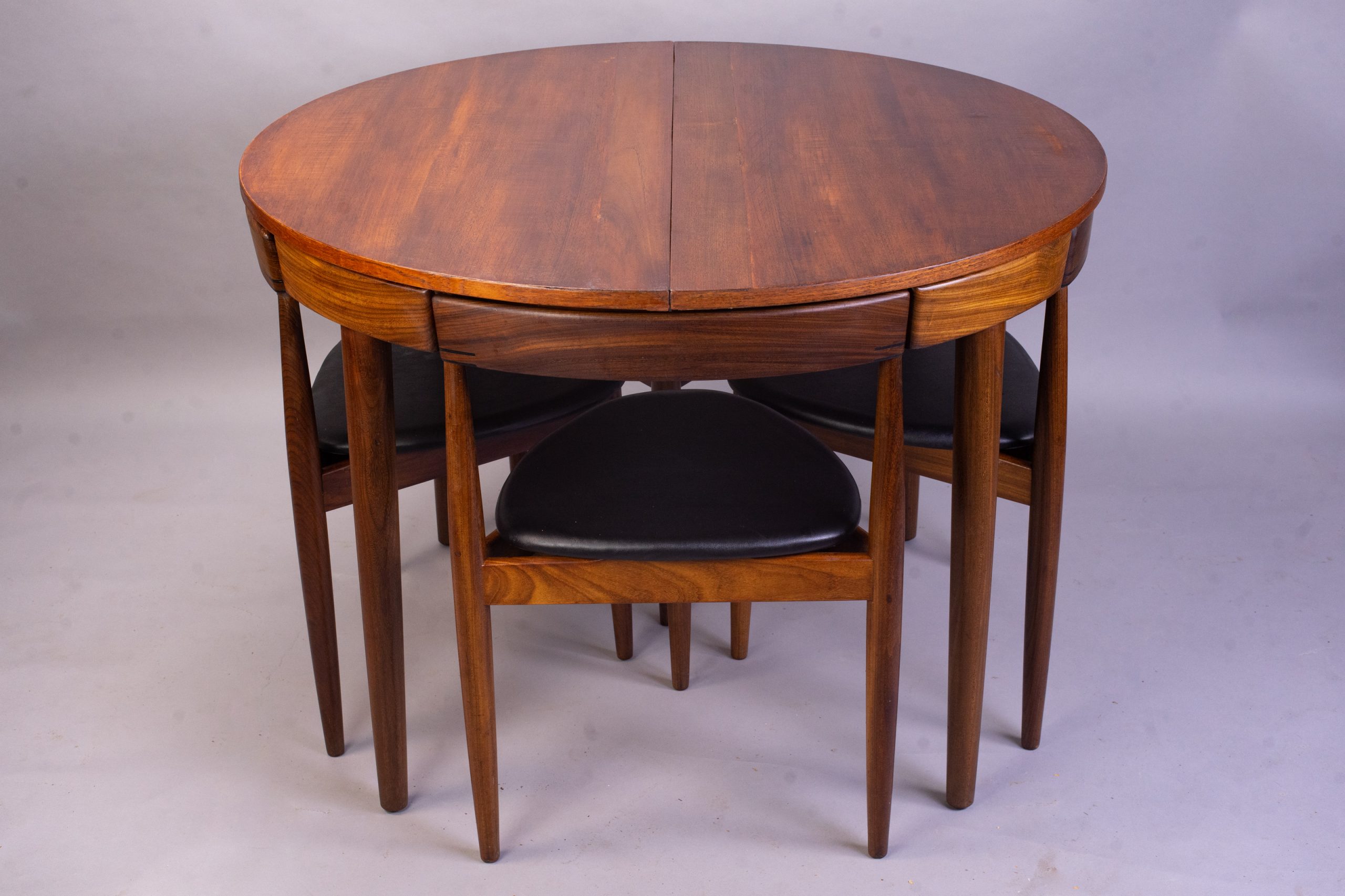 Compact circular dining set with an integral butterfly extension mechanism which expands from 4 to 6 places. In this iconic design the chairs fit seamlessly beneath the table when not in use forming a continuous band of beautifully grained afromosia wood. The extra chairs can be stacked when not in use. A stunning dining set perfect for use in any setting, particularly where space is at a premium.