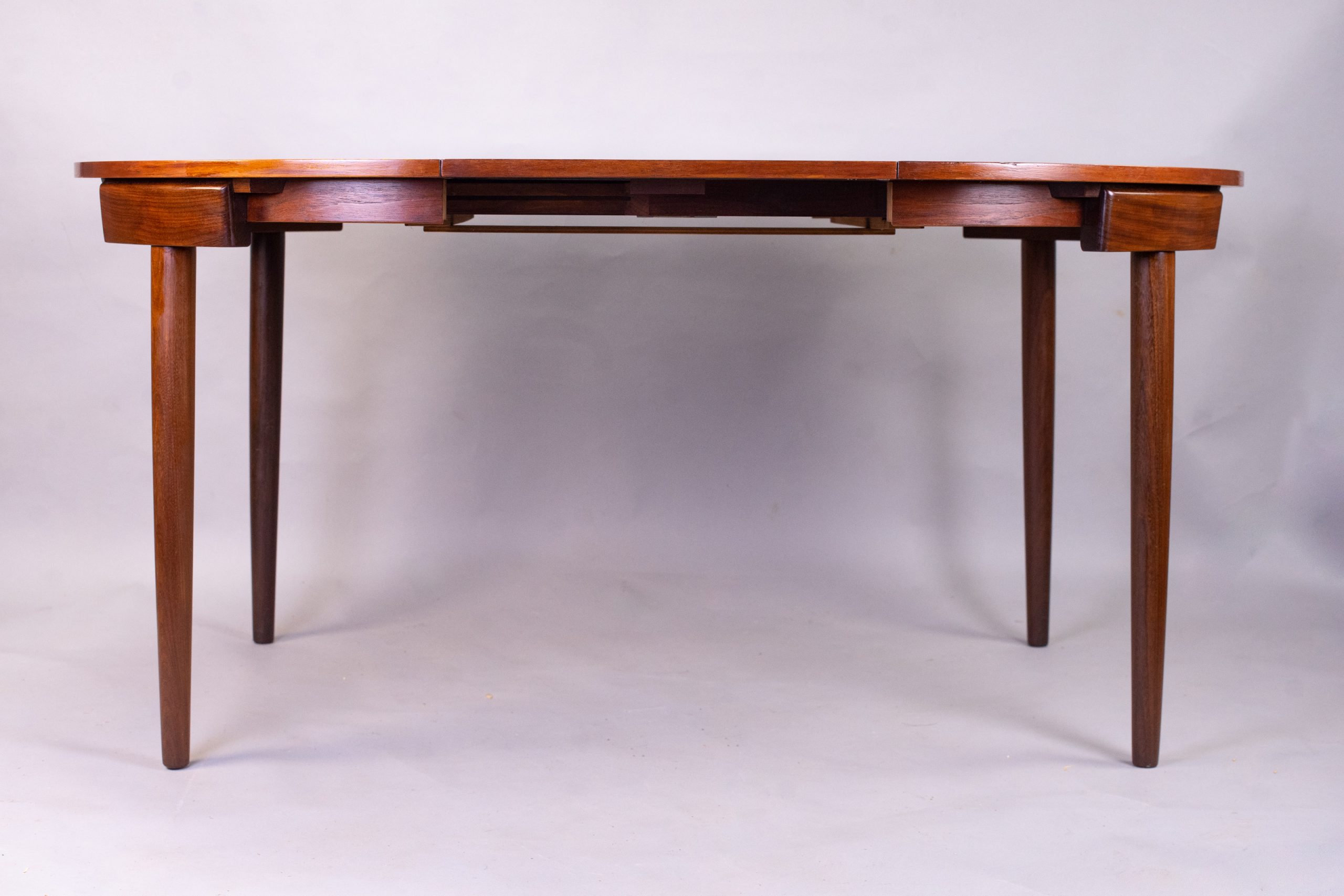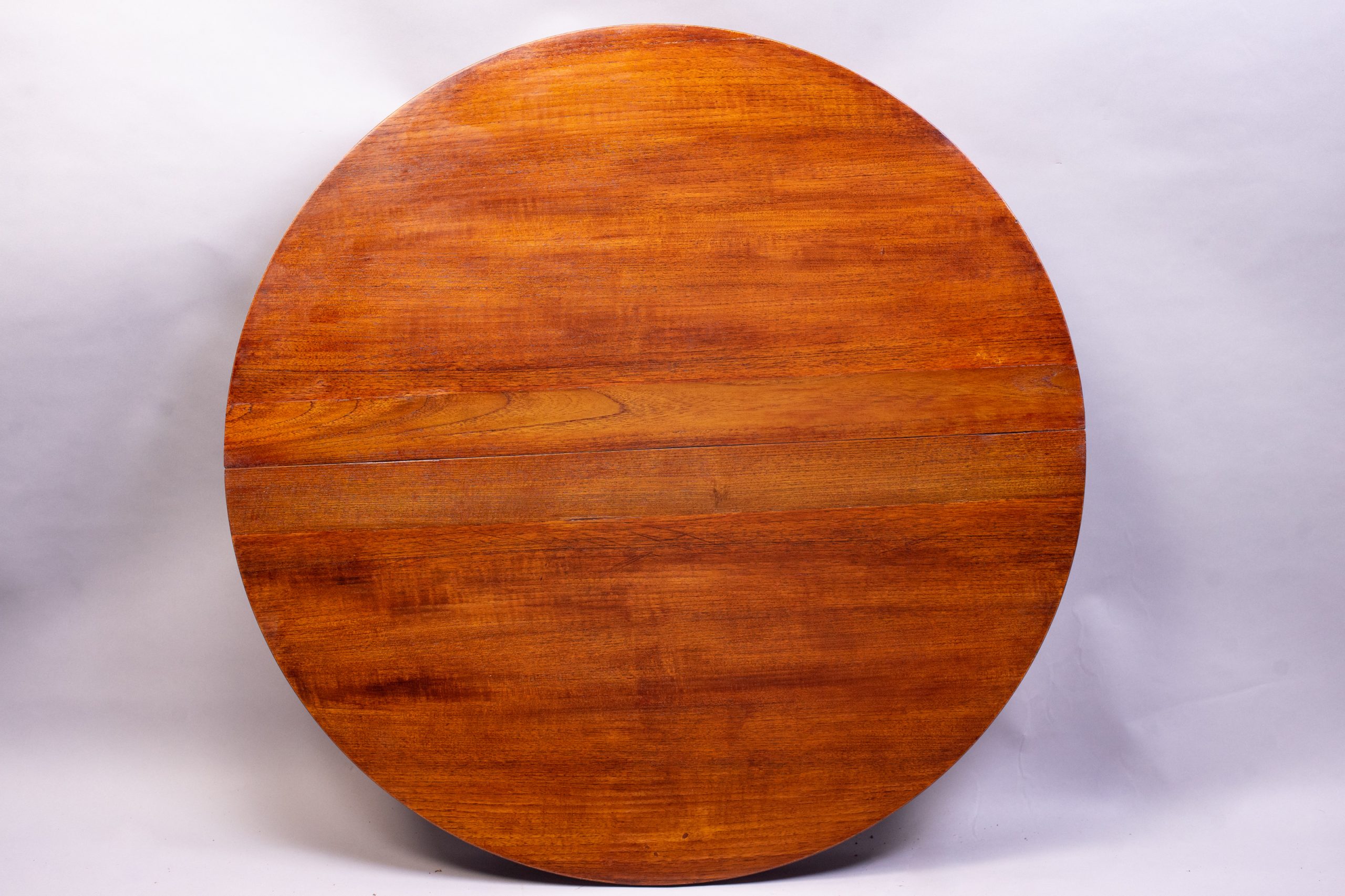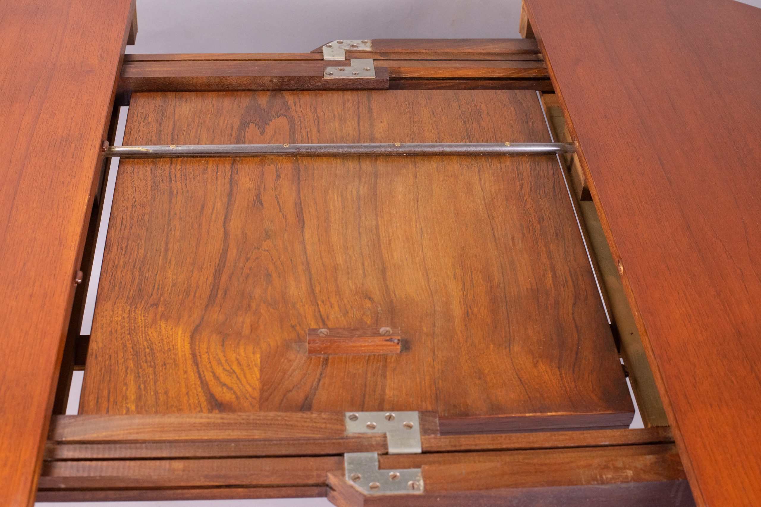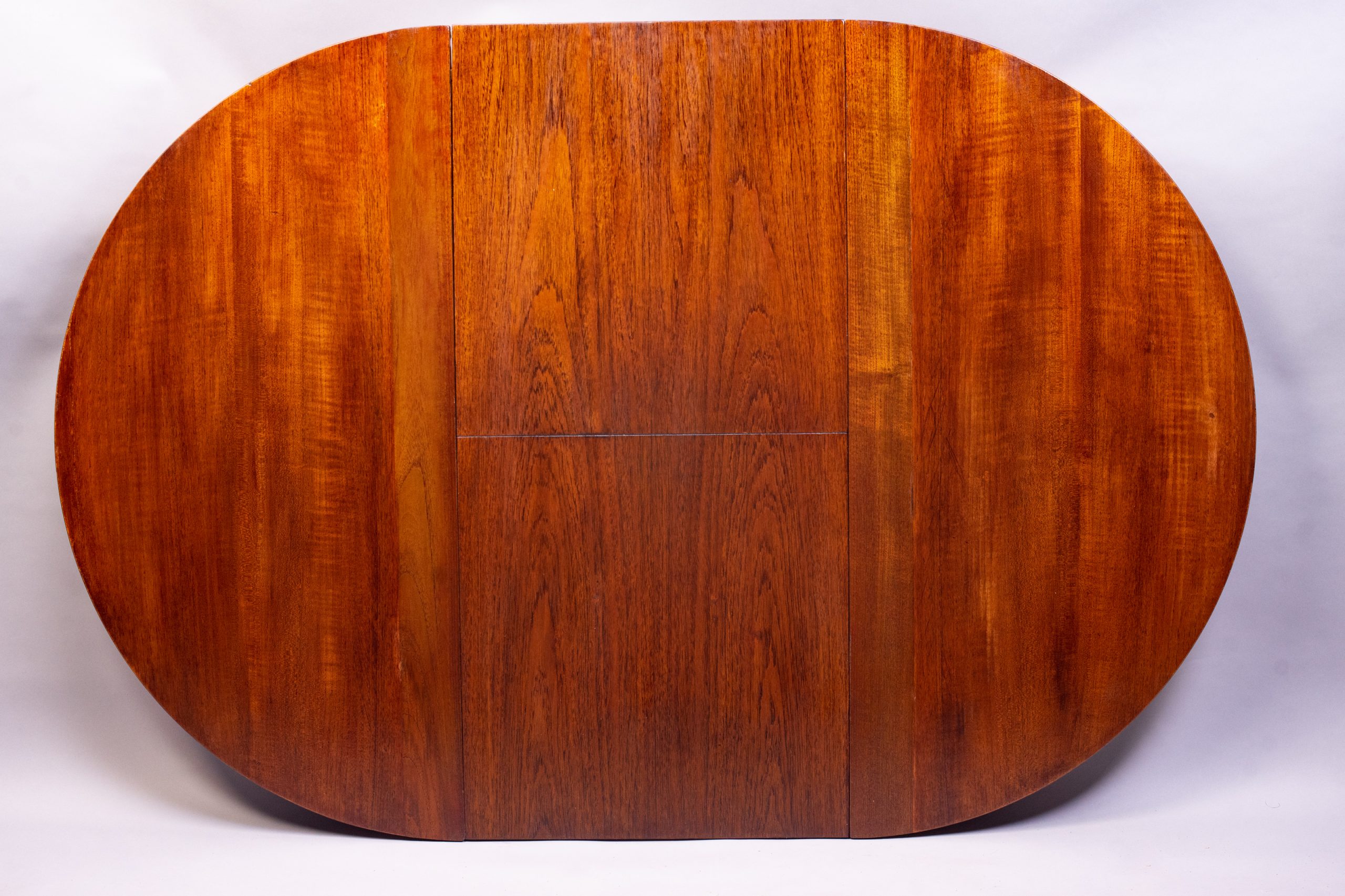 Compact circular dining set with an integral butterfly extension mechanism which expands from 4 to 6 places. In this iconic design the chairs fit seamlessly beneath the table when not in use forming a continuous band of beautifully grained afromosia wood. The extra chairs can be stacked when not in use. A stunning dining set perfect for use in any setting, particularly where space is at a premium.