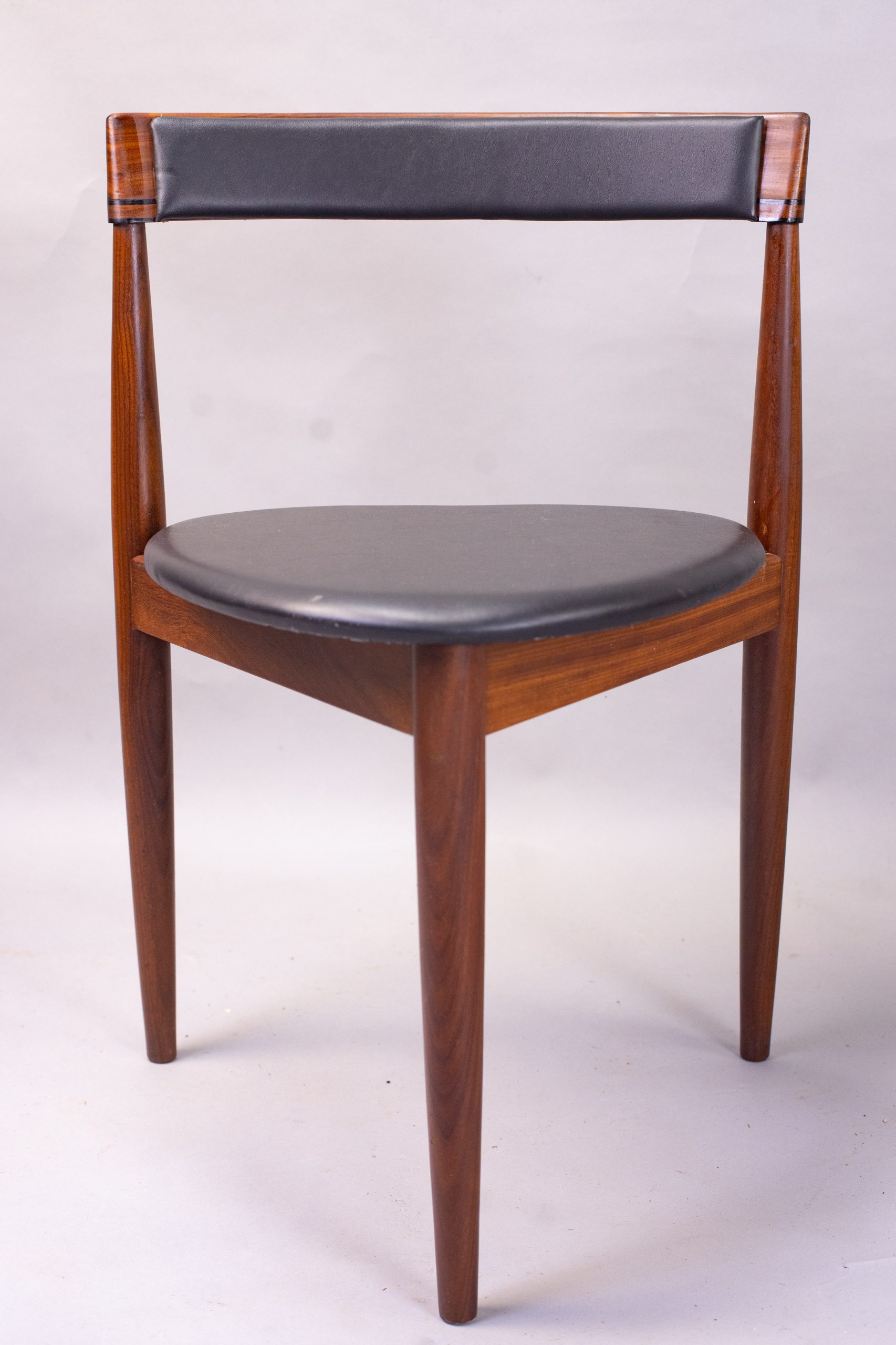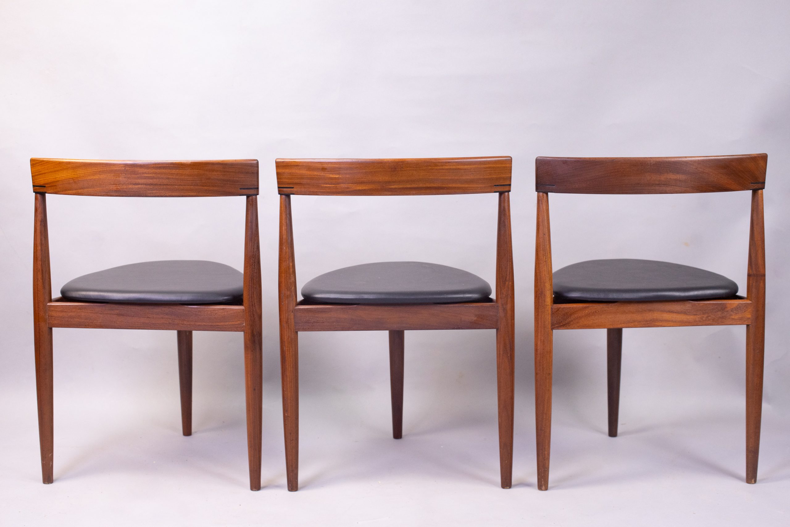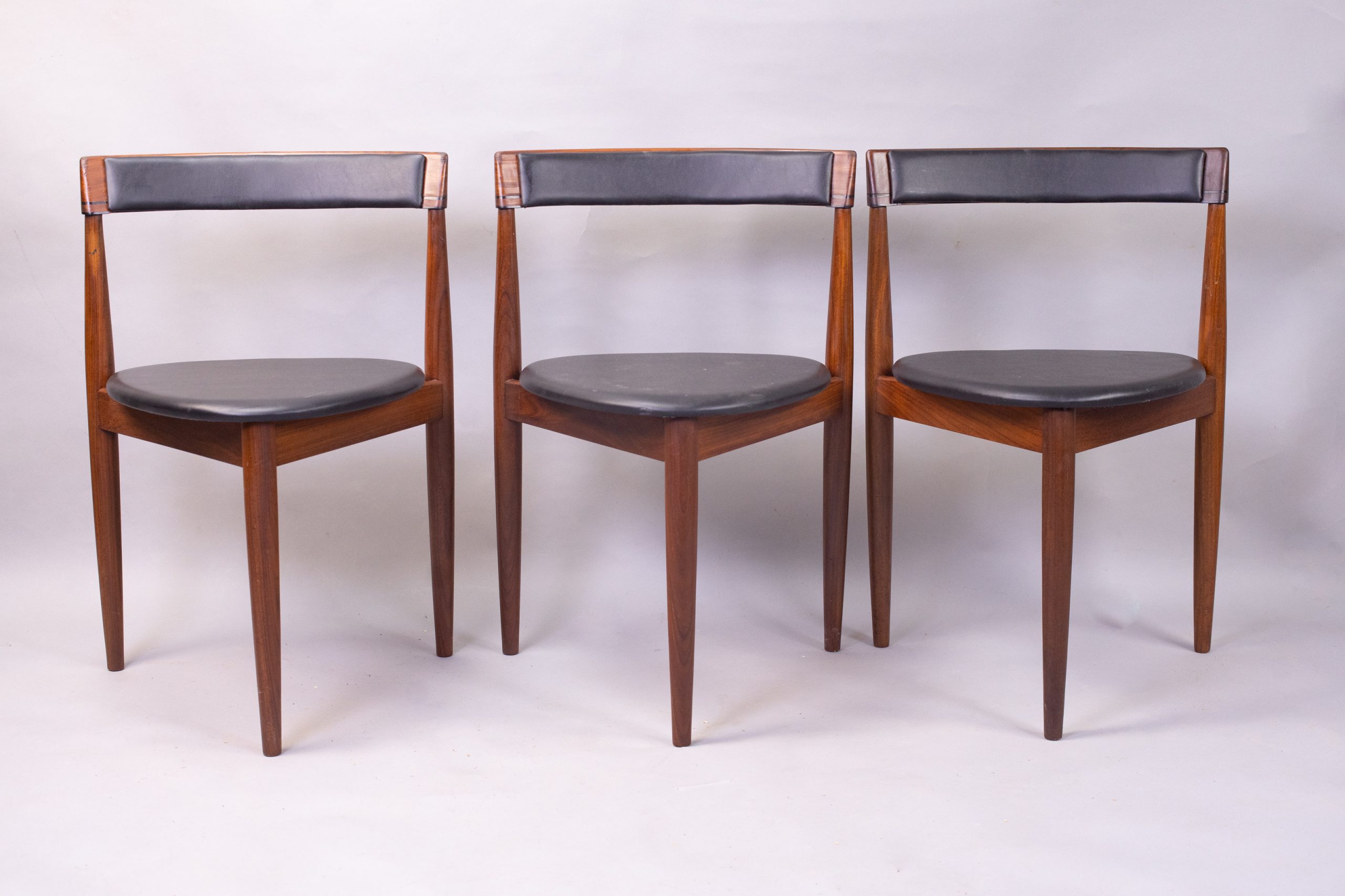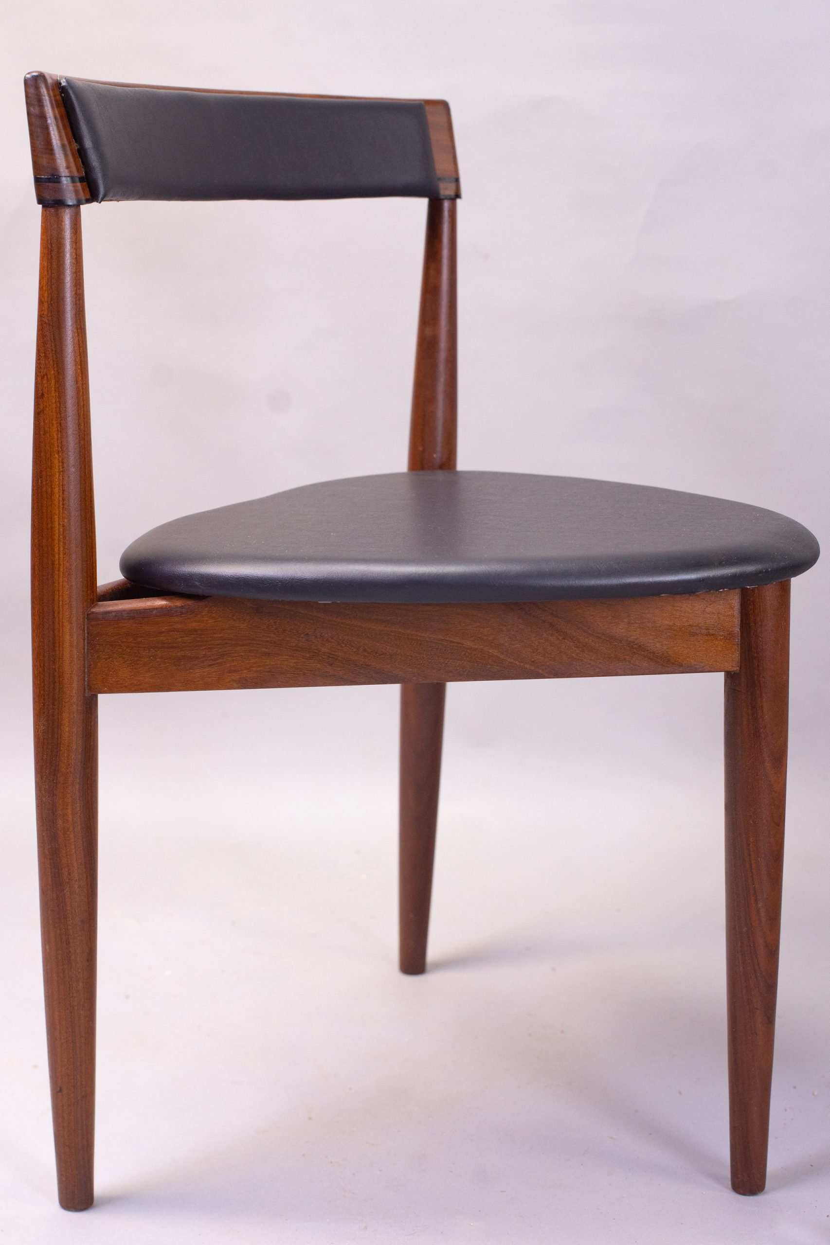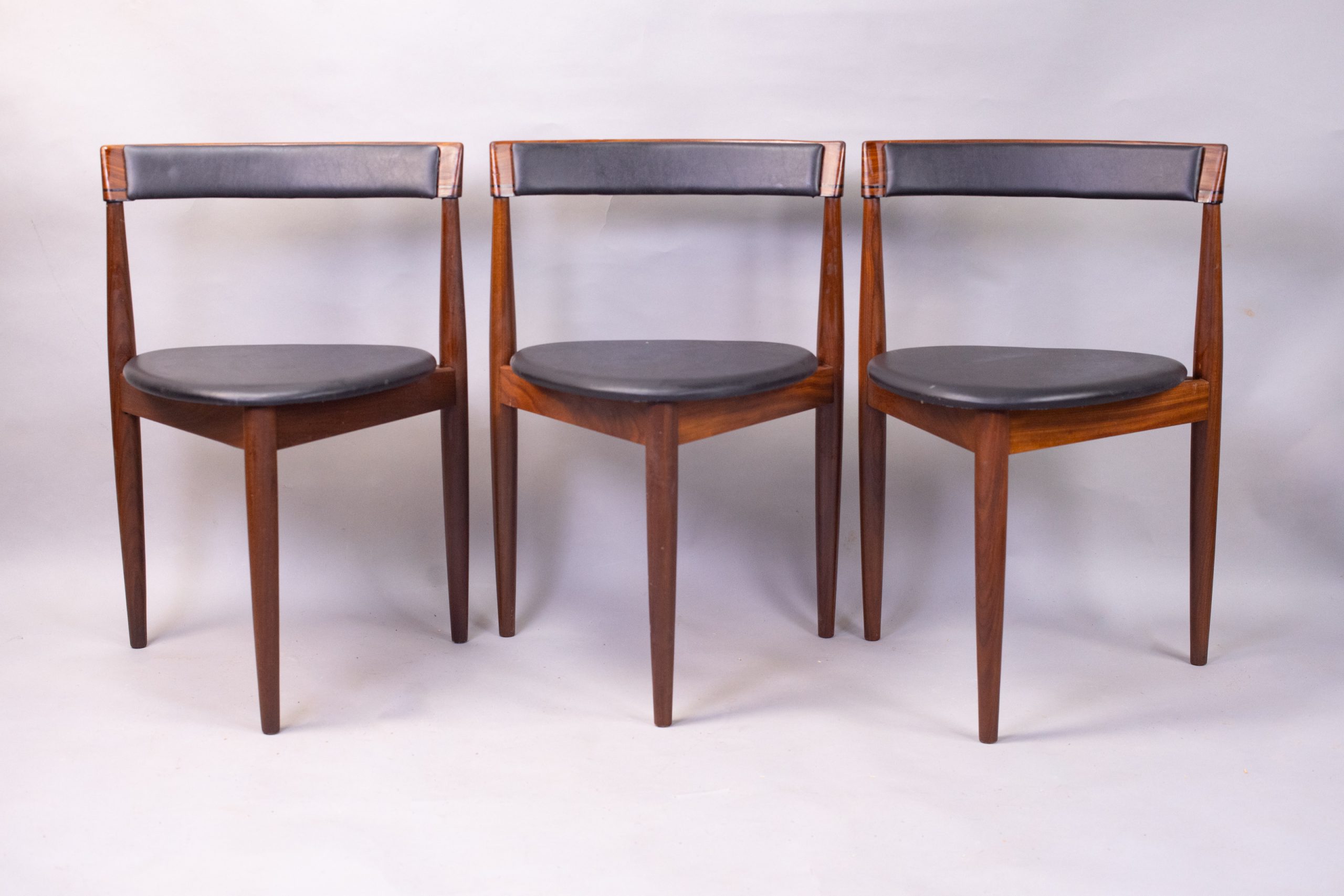 The six triangular tripod chairs have frames made of solid afromosia with a distinctive black inlay detail on the back rail. The chairs have been fully restored with newly upholstered seats covered in a high-quality black vinyl leather.