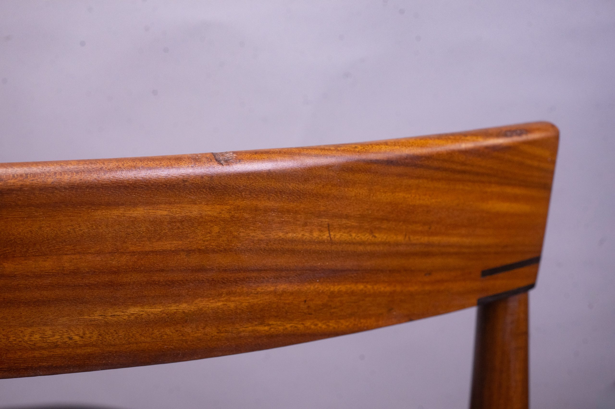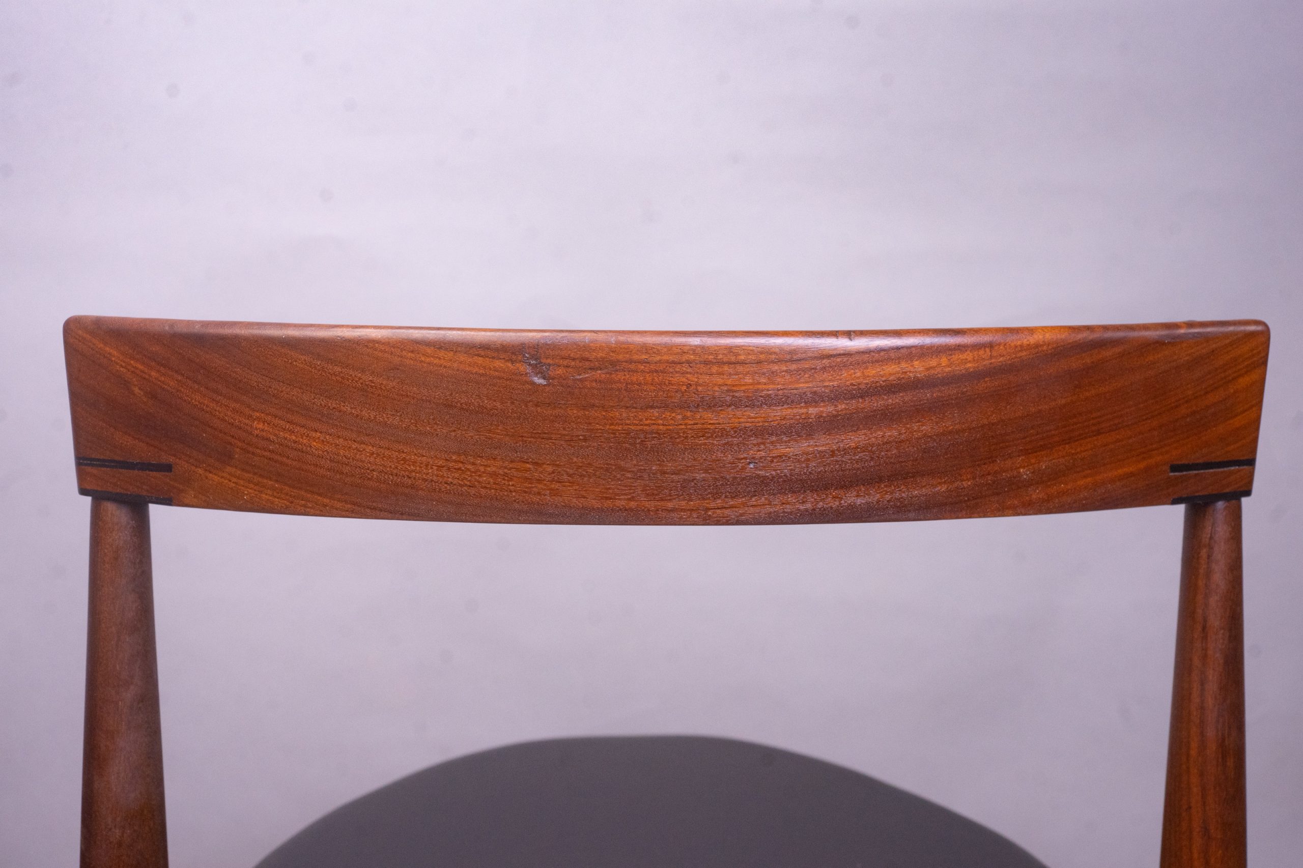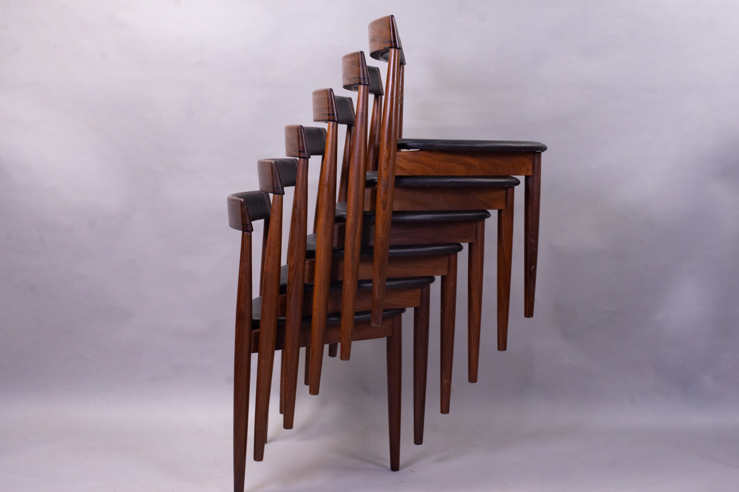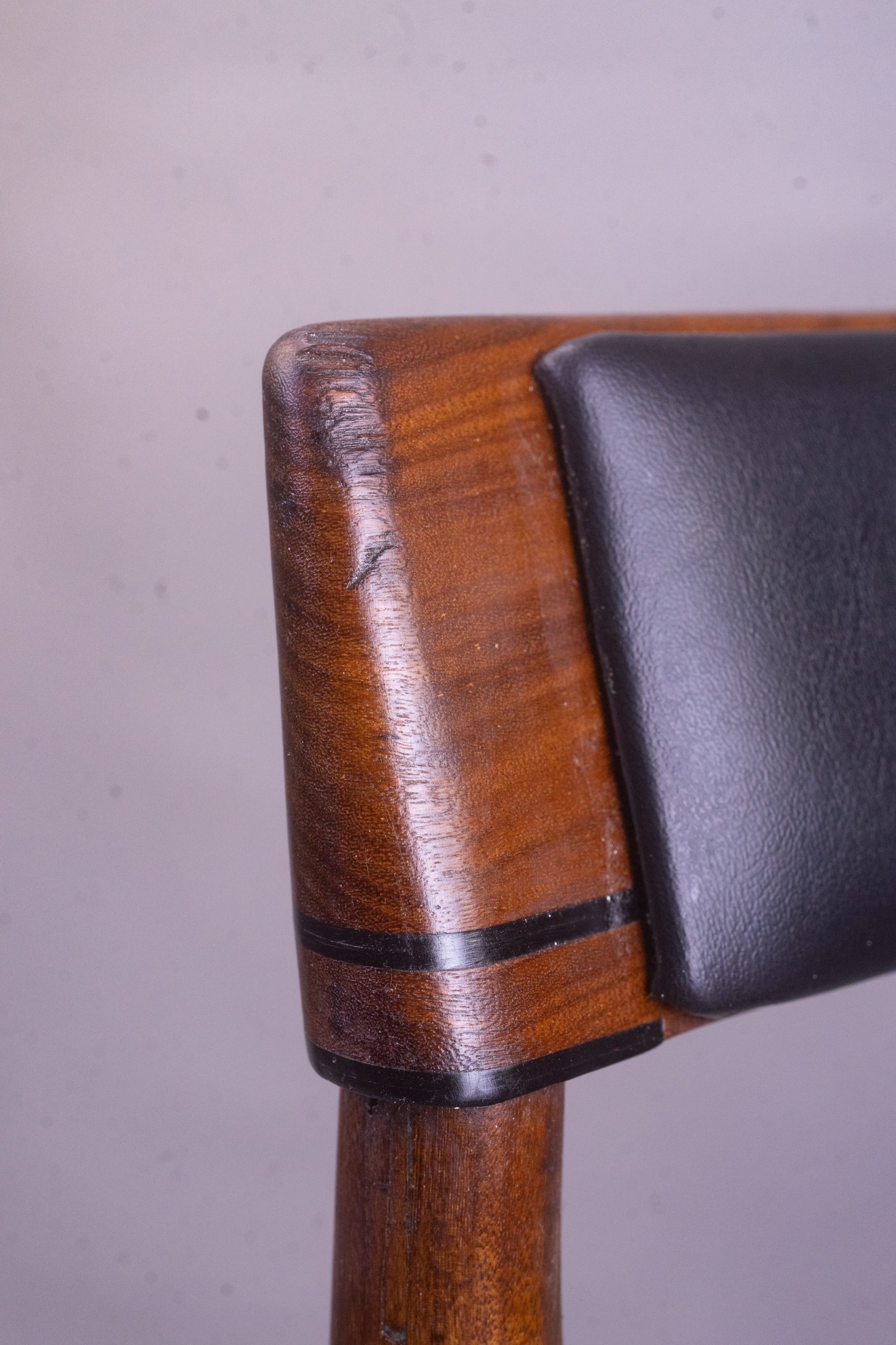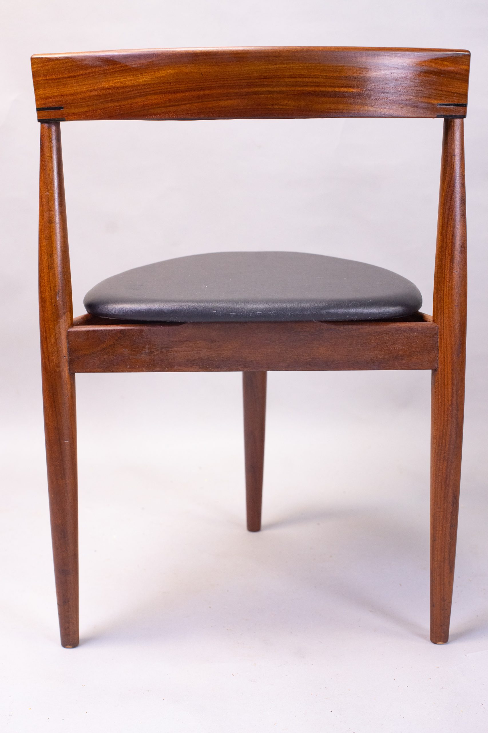 The six triangular tripod chairs have frames made of solid afromosia with a distinctive black inlay detail on the back rail. The chairs have been fully restored with newly upholstered seats covered in a high-quality black vinyl leather.