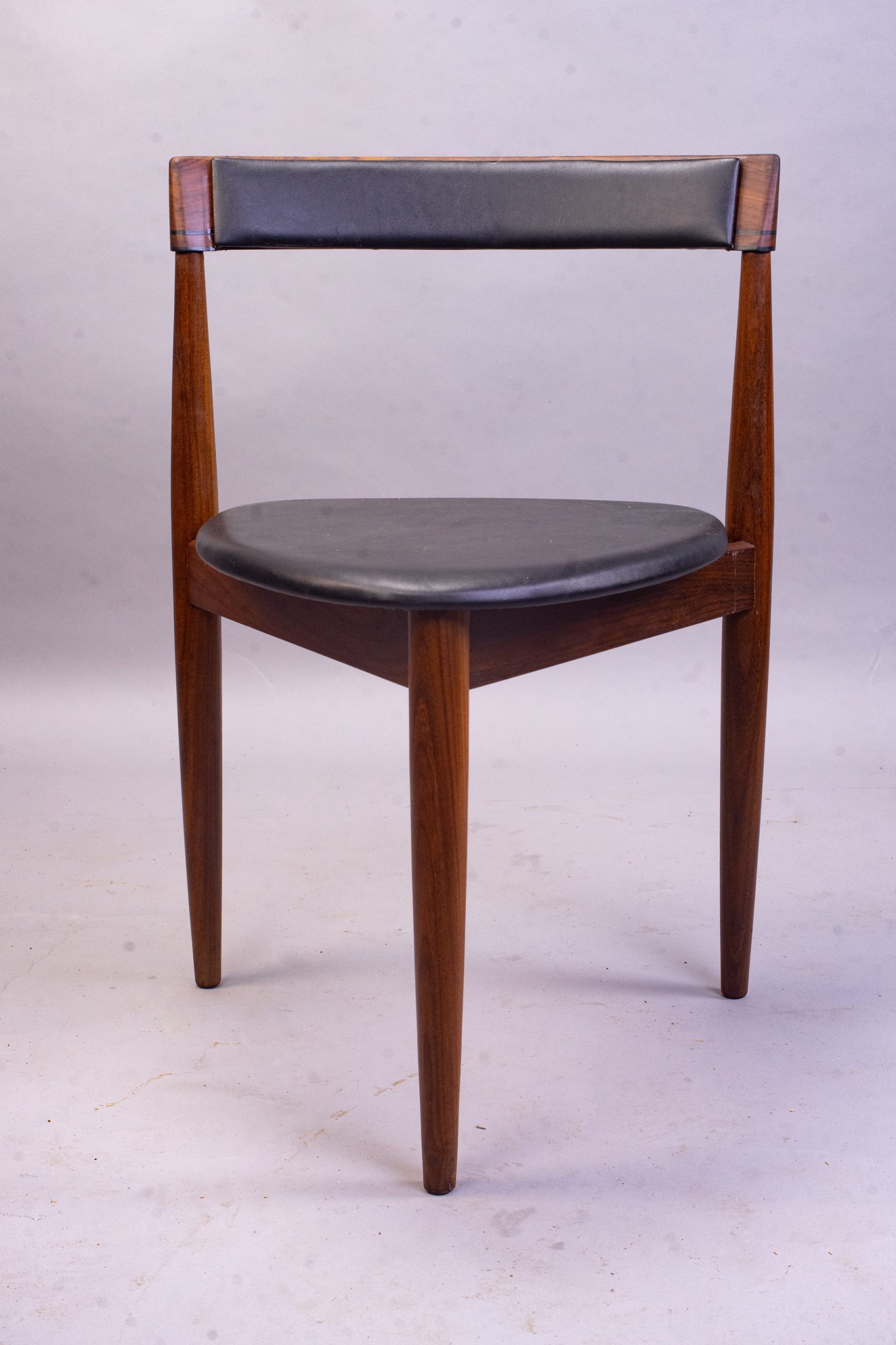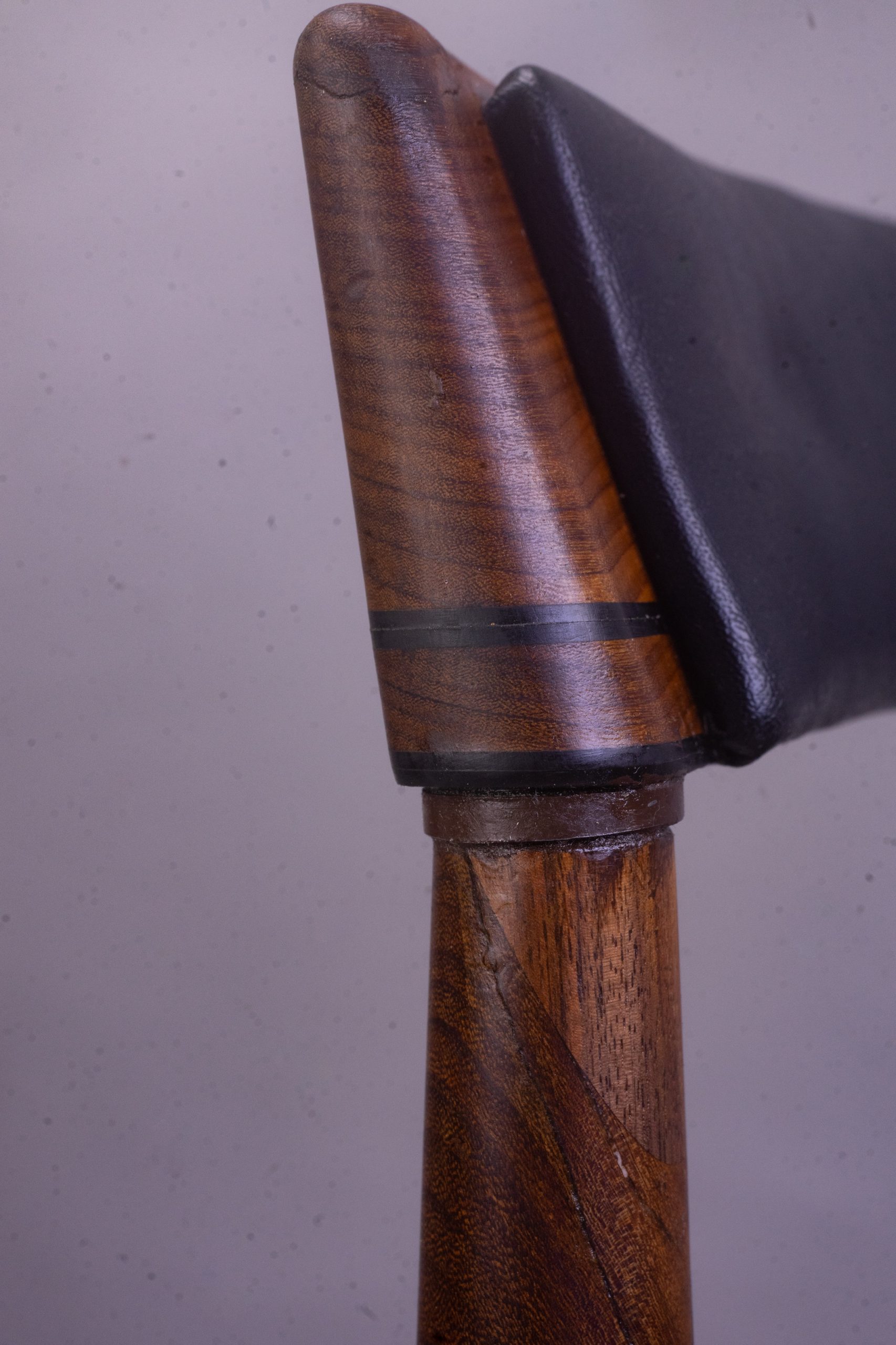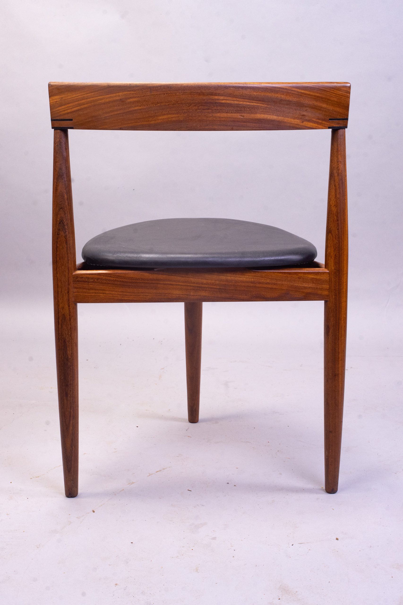 The six triangular tripod chairs have frames made of solid afromosia with a distinctive black inlay detail on the back rail. The chairs have been fully restored with newly upholstered seats covered in black vinyl.