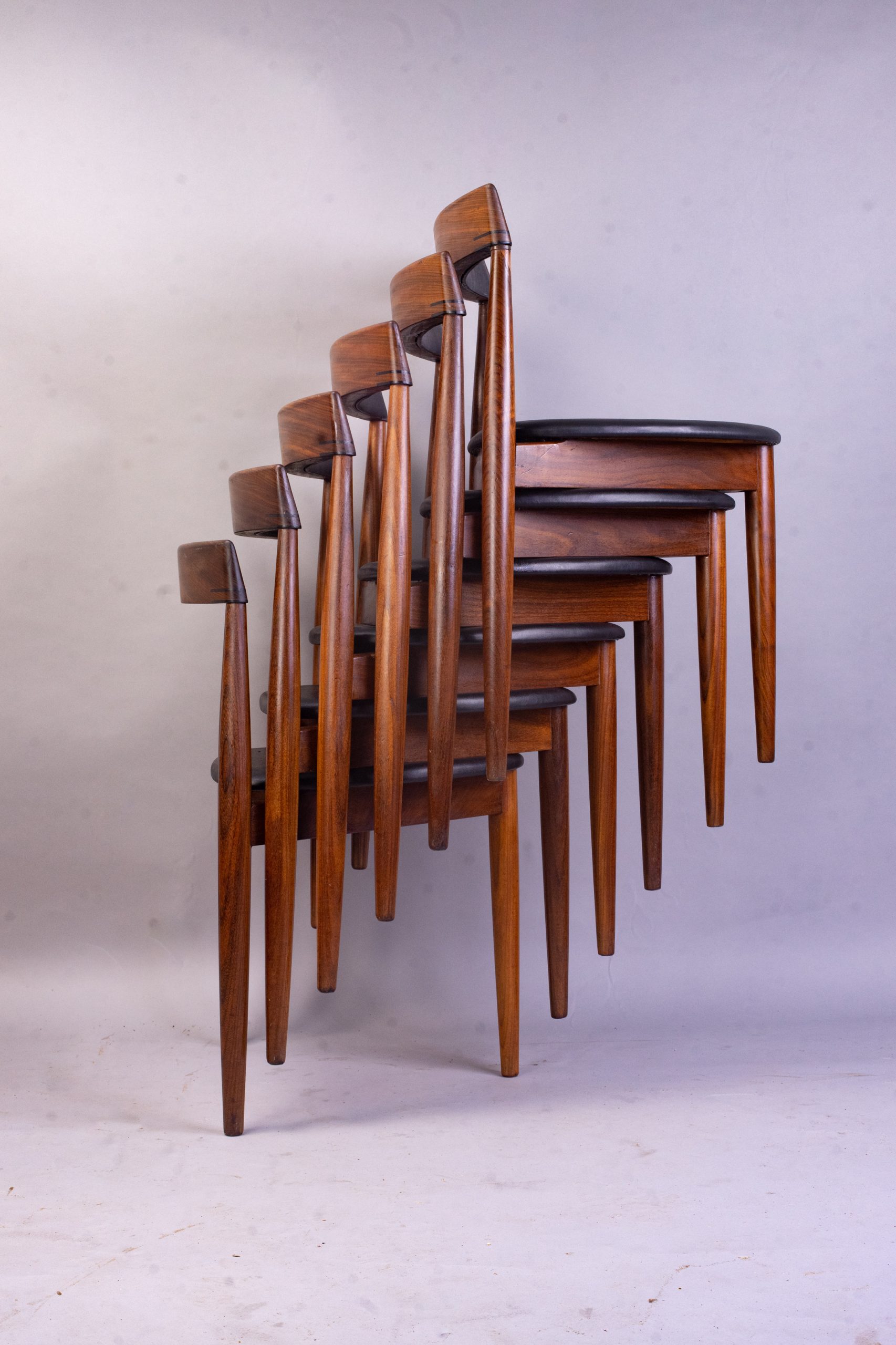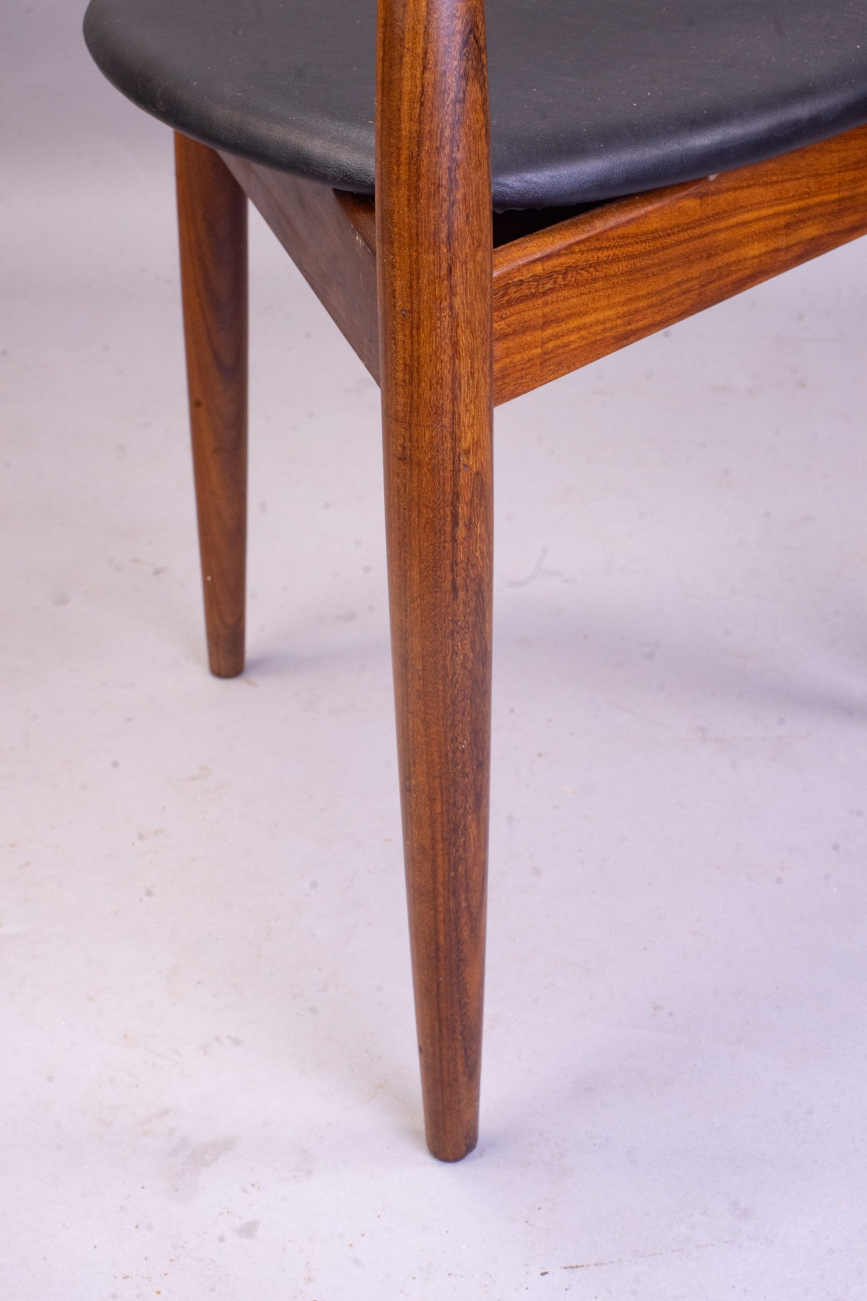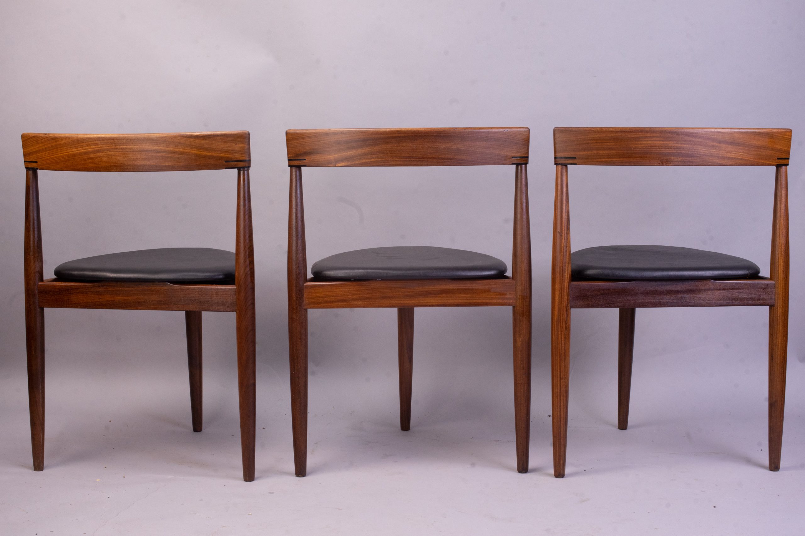 The six triangular tripod chairs have frames made of solid afromosia with a distinctive black inlay detail on the back rail. The chairs have been fully restored with newly upholstered seats covered in black vinyl.