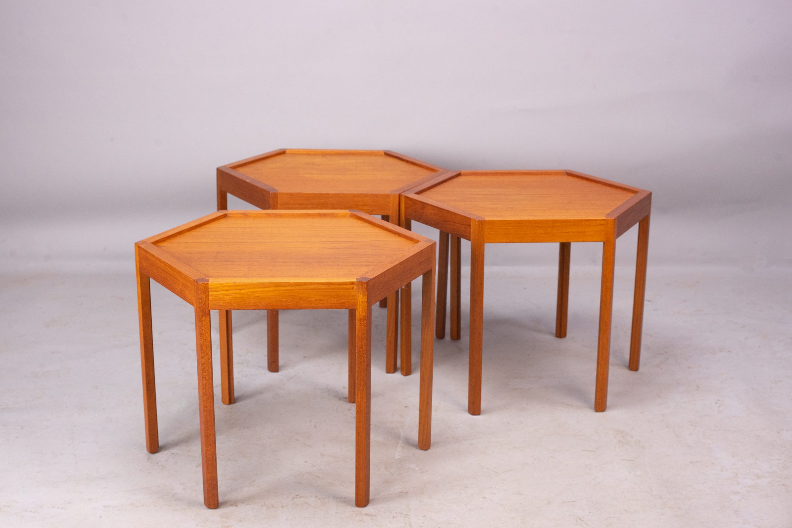 and manufactured by Artek in the 1960s from solid teak of exceptional quality and grain. The three hexagonal tables can be arranged in various tessellating formations and can even be stacked to store when not in use. The joints between the legs and the top frame form an attractive detail on the the table top and the precisely-cut profile continues down through the leg creating a v-shaped groove on the inner side.