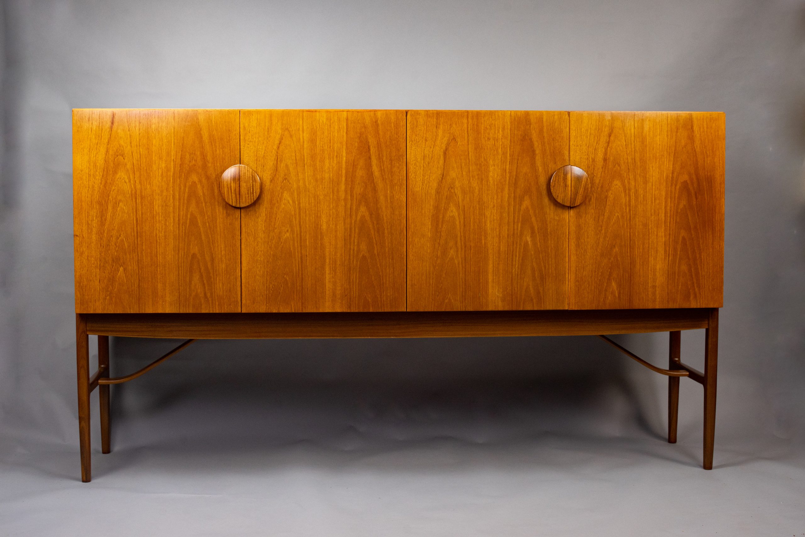 finished in teak with solid Bombay rosewood handles and afromosia legs. Simple and distinctive lines with a nod to classical Chinese cabinets with the large split circular handles.