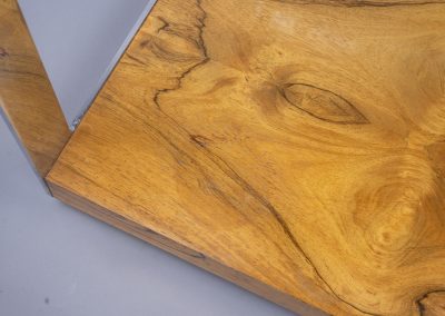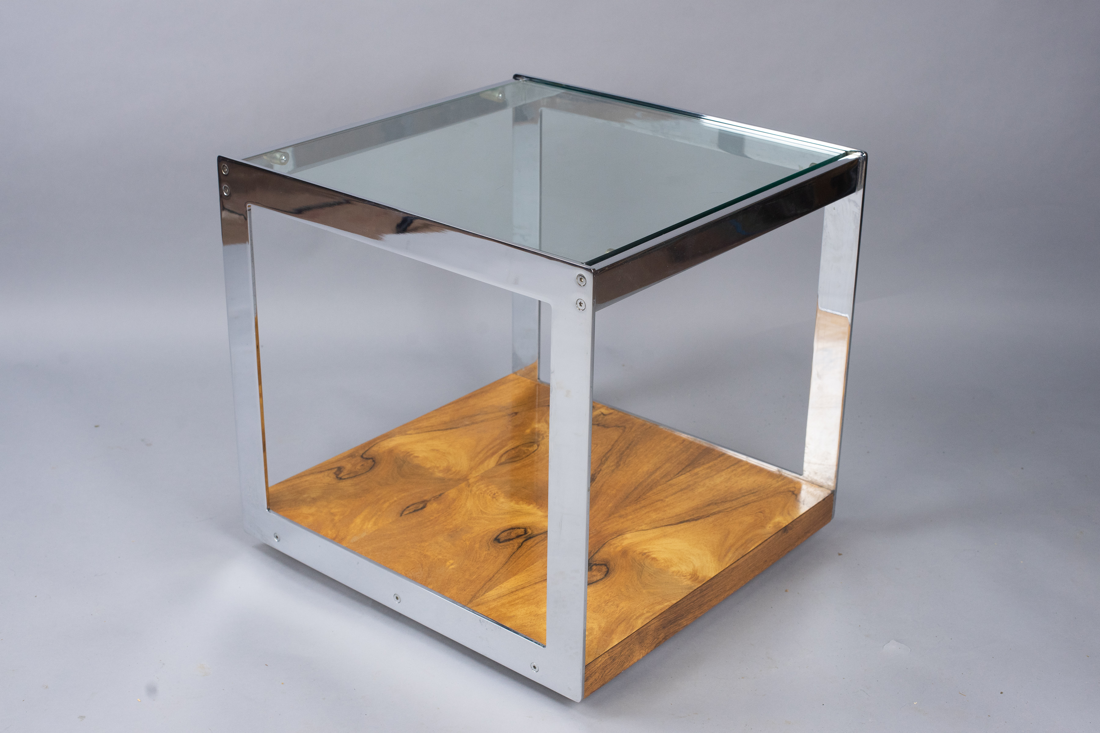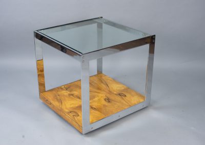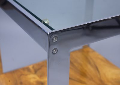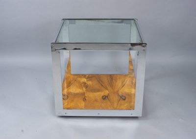 A classic 1970s coffee table design from Merrow Associates with a rosewood finish which complements the trademark polished chrome panels. The rosewood has aged and mellowed to a rich golden colour. The highest possible quality of construction: all the metalwork is weighty, precisely milled and highly polished.