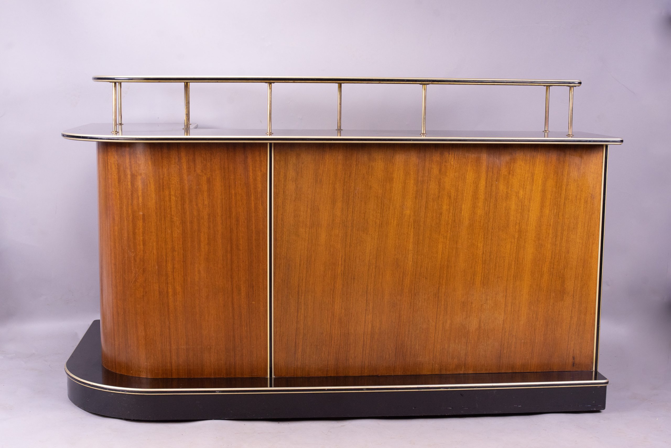 This substantial piece of furniture is set on concealed castors allowing it to be manoeuvred with relative ease across a level floor. A particular feature is the two tiered countertops covered in jet-black formica. The upper level is supported on elegant brass pillars. The curved sweep of the bar is finished in teak veneer with aluminium and black rubber trim which acts as a protective bumper. At the base there is a short formica-topped plinth (or foot rest for the indolent barfly…). Behind the bar are open shelves (two with brass rails) and a cupboard with working lock and key.
