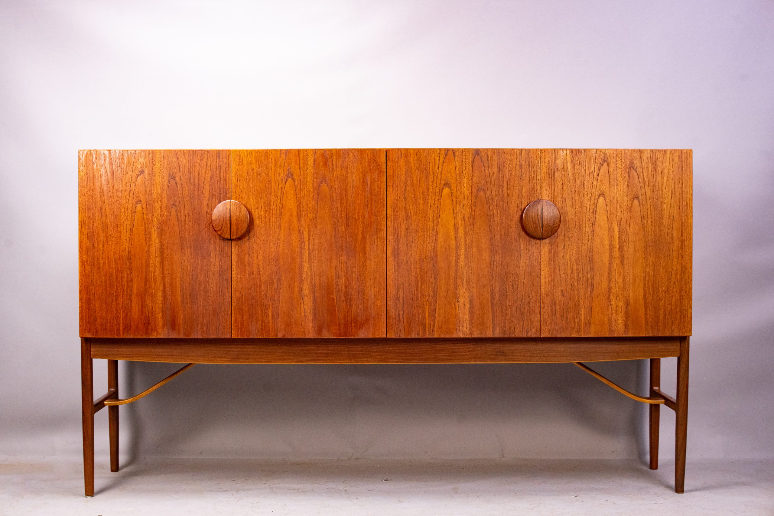 and finished in teak with solid Bombay rosewood handles and afromosia legs. Simple and distinctive lines with a nod to classical Chinese cabinets with the large split circular handles.