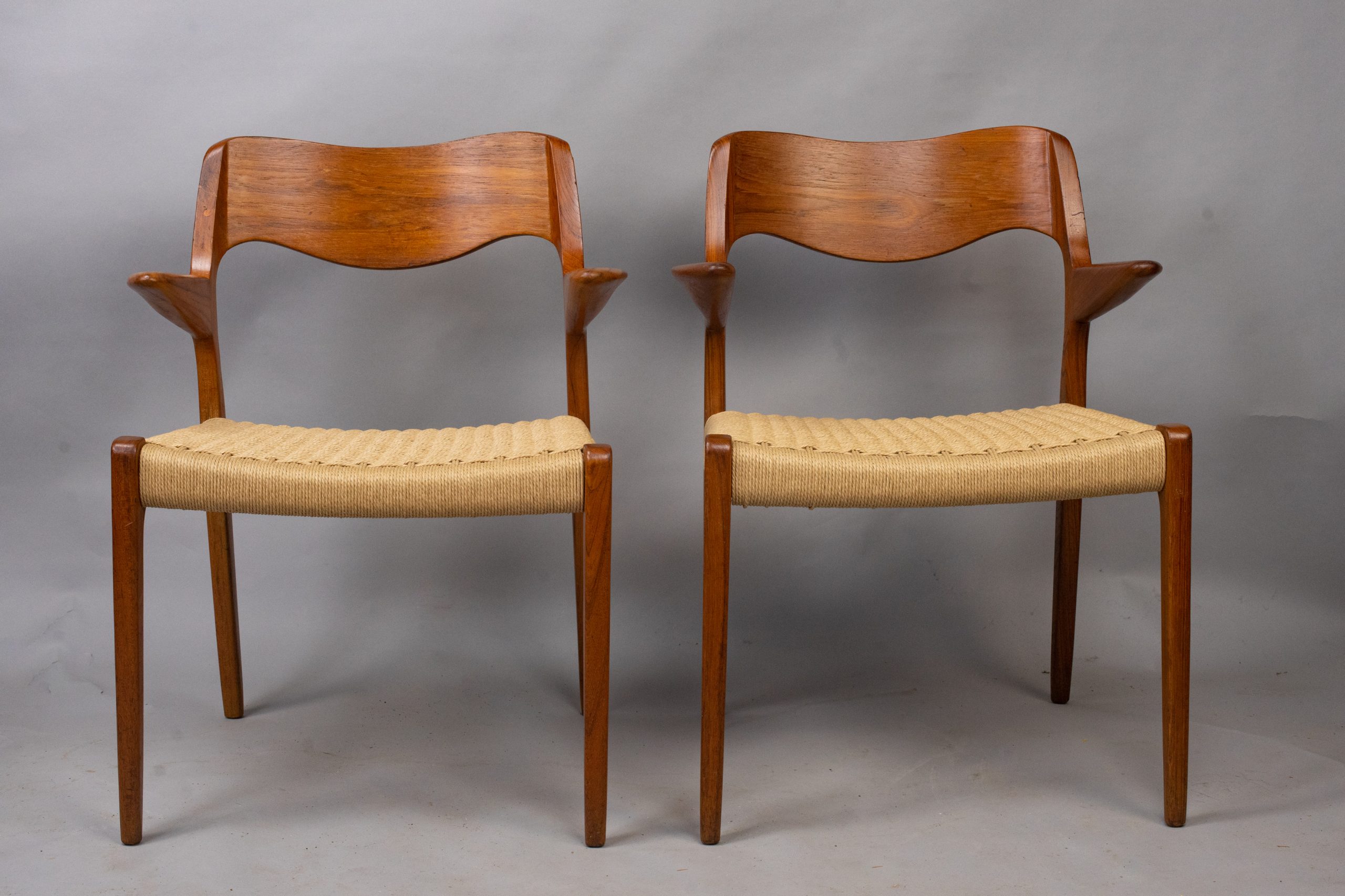 A pair of carver dining chairs with arms hand-made in Denmark in the 1970s by J L Møllers to Niels Otto Møller’s 1951 design No. 55.