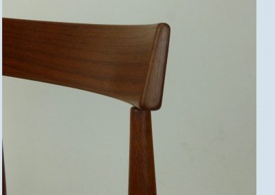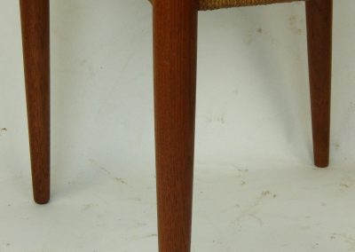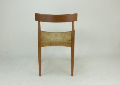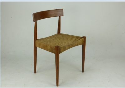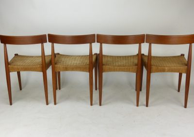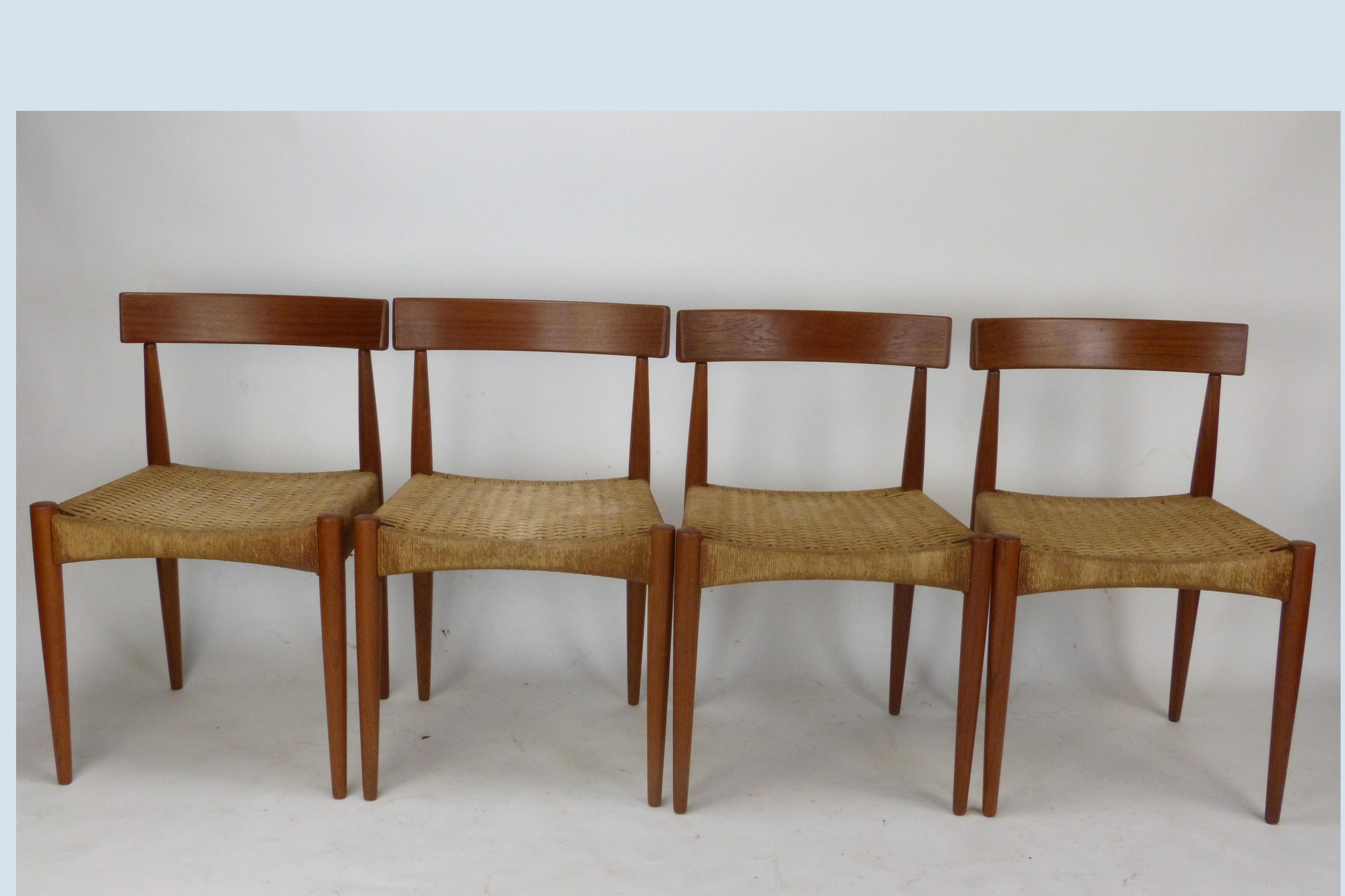 Four teak dining chairs with woven paper-cord seats designed by Arne Hovmand Olsen for Mogens Kold Denmark 1960s.