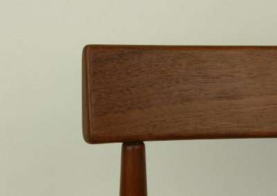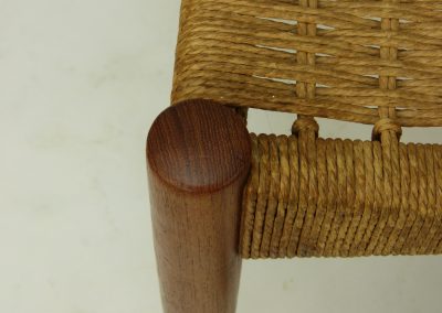 An understated classic dining chair design with finely tapered spindles made of a warm-toned teak and with comfortable concave seats woven with typically Danish, spun paper cords.