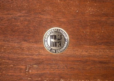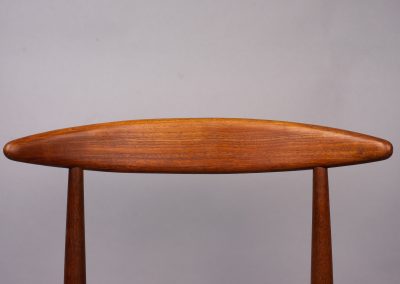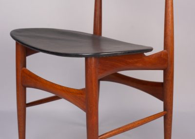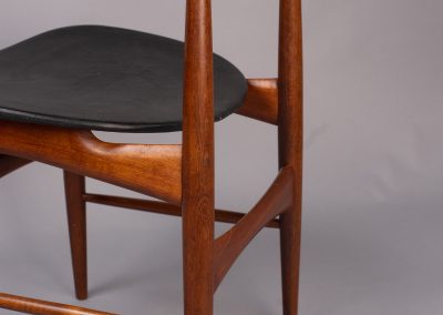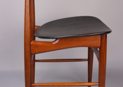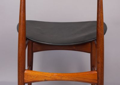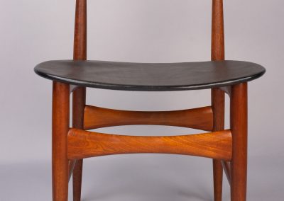 Four teak dining chairs designed by Arne Hovmand Olsen and produced by Mogens Kold in Denmark in the 1960s. The chairs have solid teak frames with tapered legs and stretchers in beautifully grained teak and a lens-shaped backrest. The formed plywood seats are covered in black vinyl faux-leather.