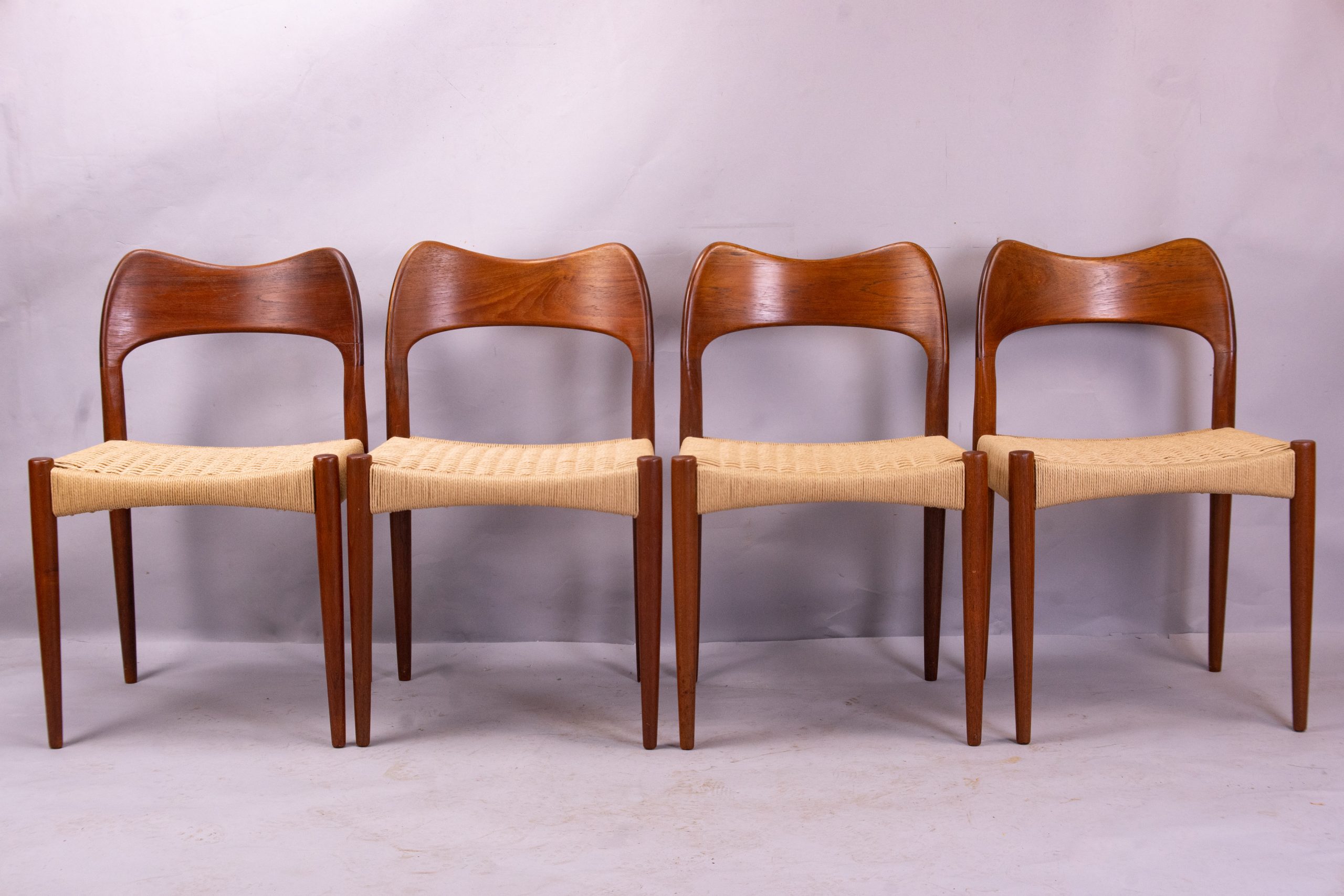 A set of 4 teak dining chairs designed by Arne Hovmand-Olsen and manufactured in Denmark in the 1960s by Mogens Kold.