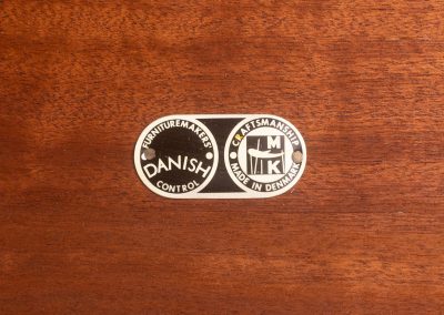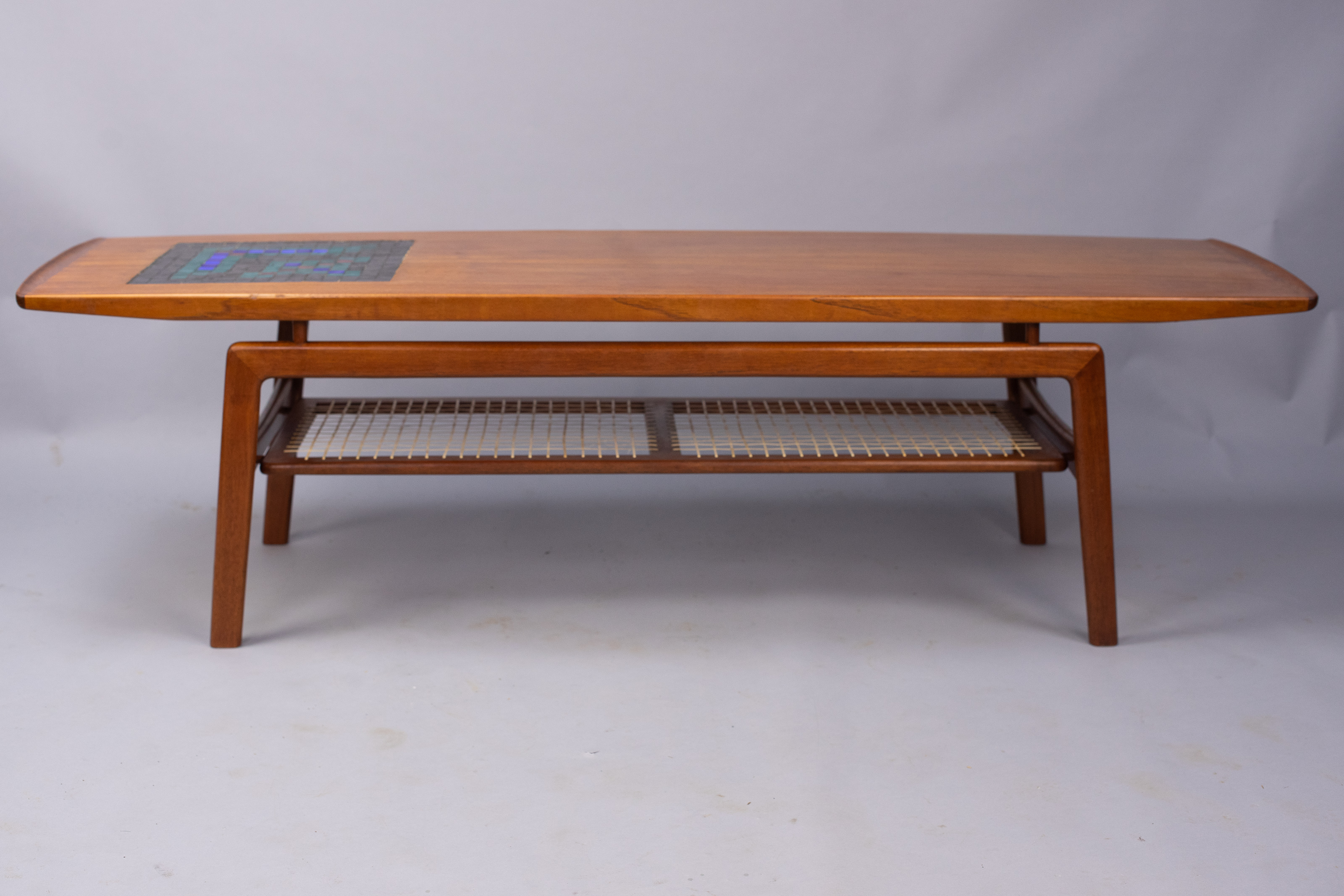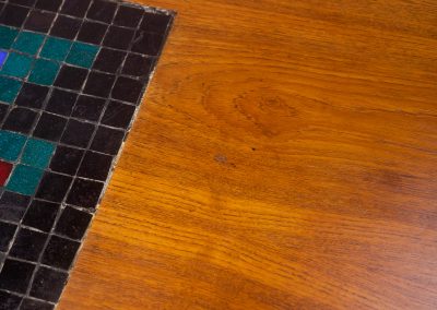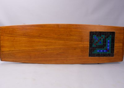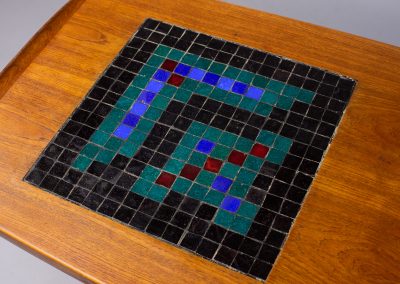 The long, sweeping teak table-top has upturned ends and an inset mosaic panel in black, blue, red, and green tiles in an abtract pattern that now rather suggests the graphics of early 1980s computer games – though it obviously predates them. The panel provides a very practical stand for hot coffee pots as well as being a very distinctive decorative feature.