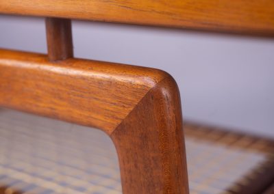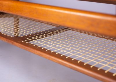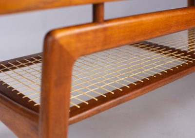 The top appears to float above a simple trapezoid leg-frame supporting a magazine shelf of open-weave rattan panels which have now been fully restored with new cane.