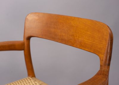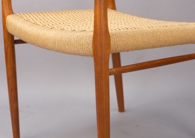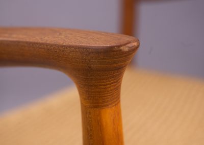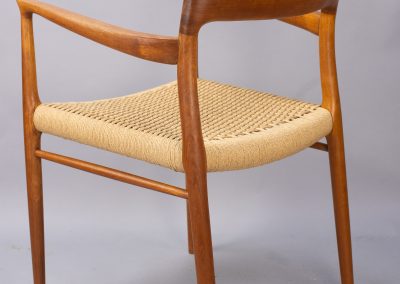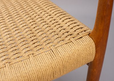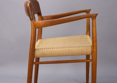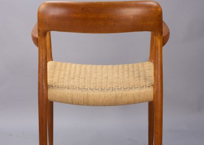 A popular design which matches the Model 75 dining chair. The organic curves of the frame are carved from solid teak. The traditional woven seat has been fully restored in new paper cord. Stamped with the original maker’s stamp and the Danish furniture control mark.