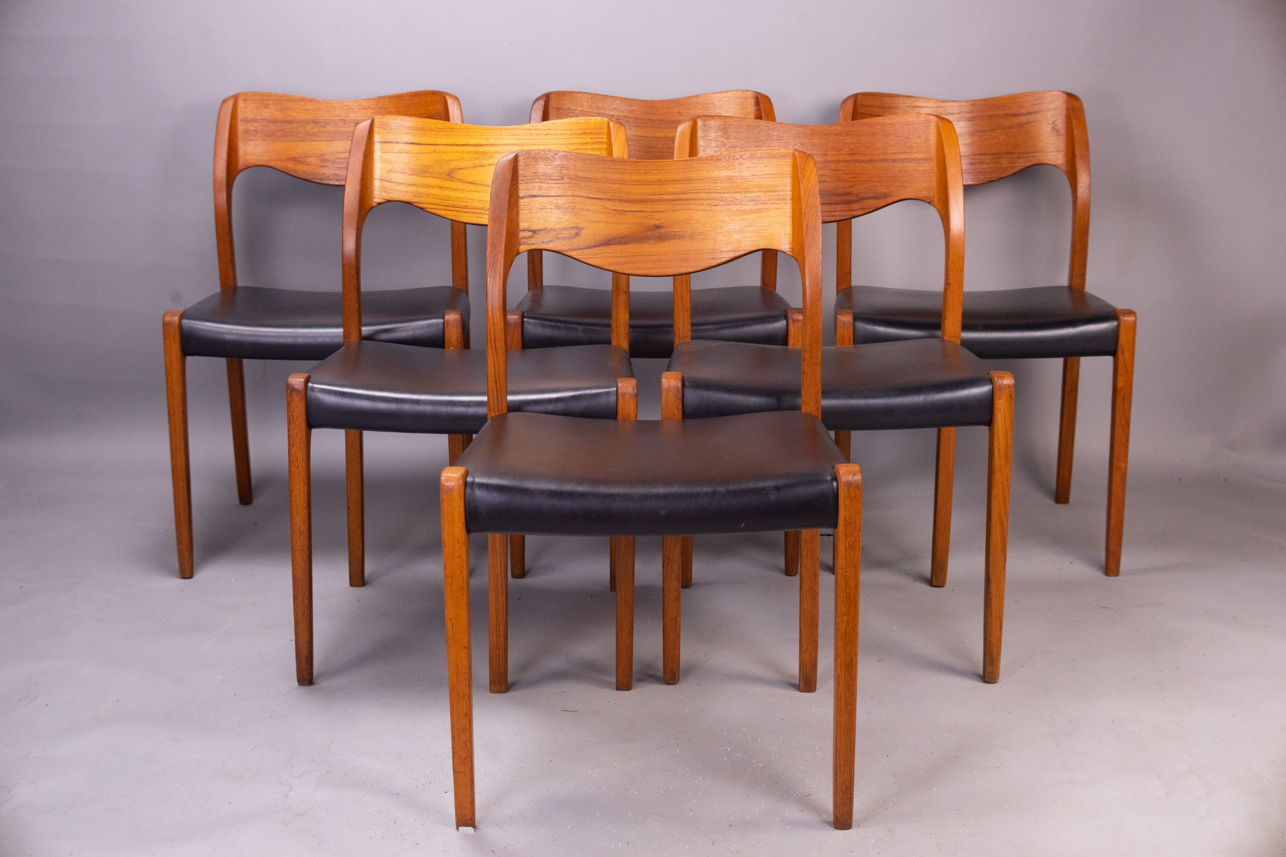 A set of six elegant dining chairs hand-made in Denmark in the 1970s by J L Møllers to Niels Otto Møller’s 1951 design No. 71.