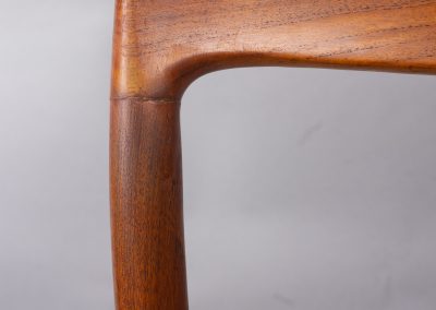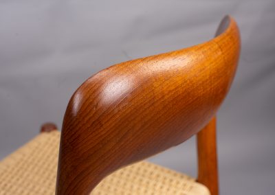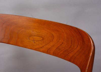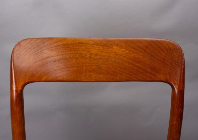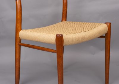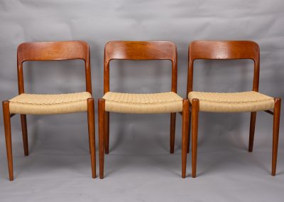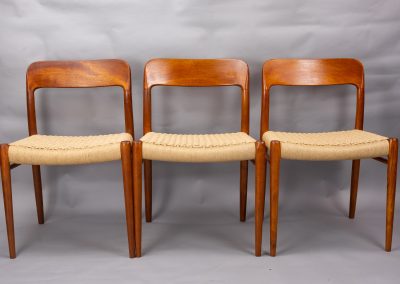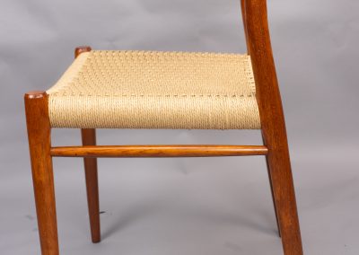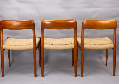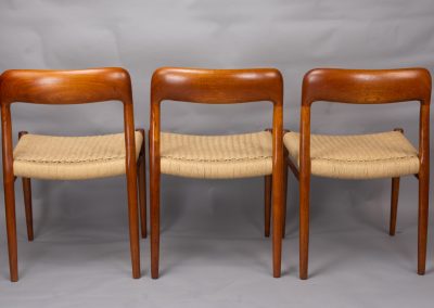 A set of six elegant dining chairs hand-made in Denmark in the 1950s by J L Møllers to Niels Otto Møller’s 1954 design No. 75.