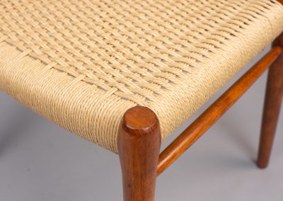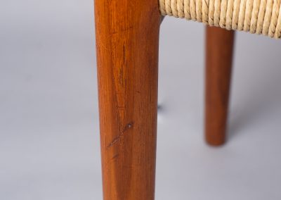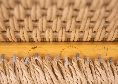 The organic curves of the frame are carved from solid teak. The traditional woven seats have been fully restored in new paper cord. Stamped with the original maker’s stamp and the Danish furniture control label.