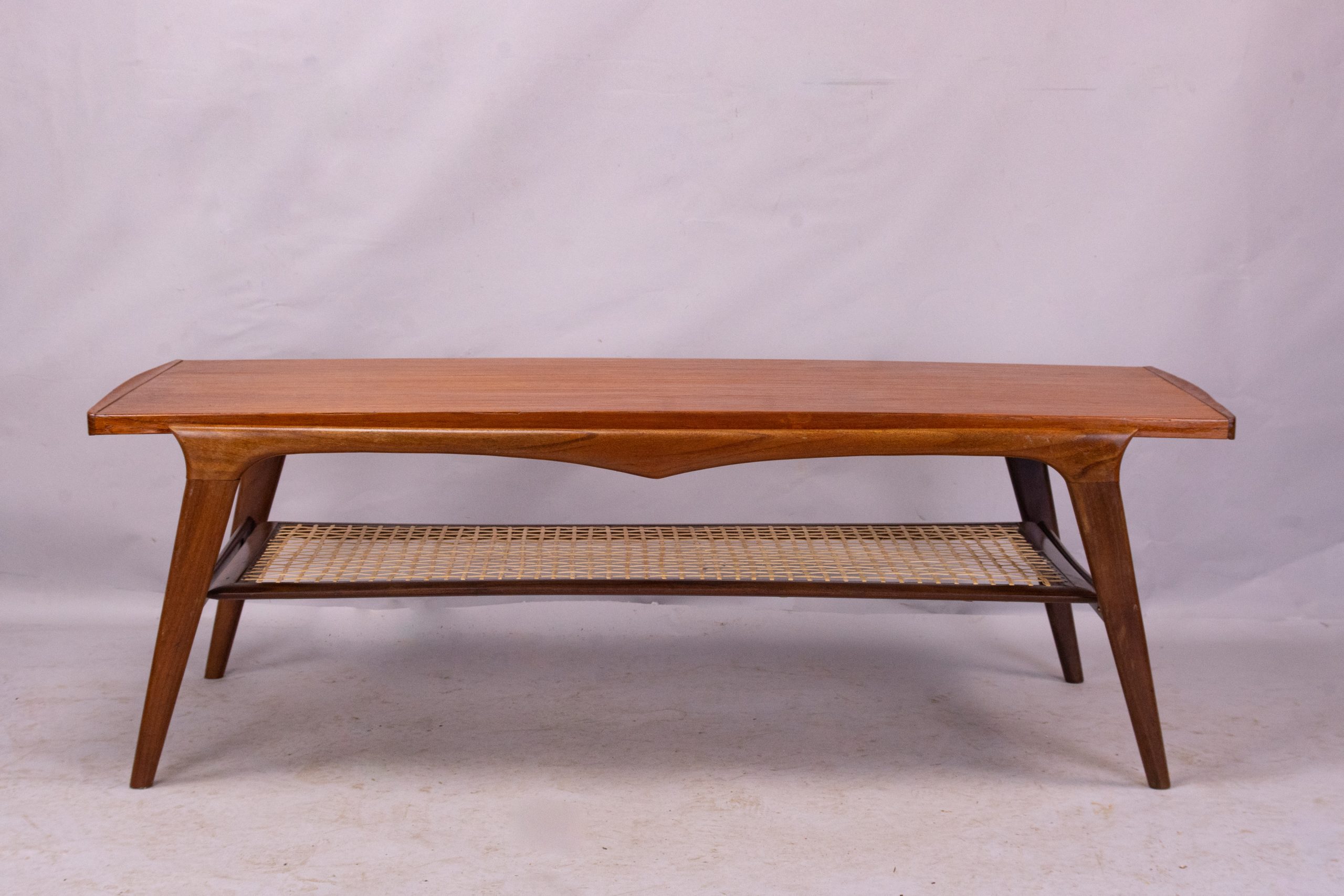The dual-faced table top sits on an elegant afromosia frame with a magazine shelf woven in a simple pattern of wide 5mm cane.
