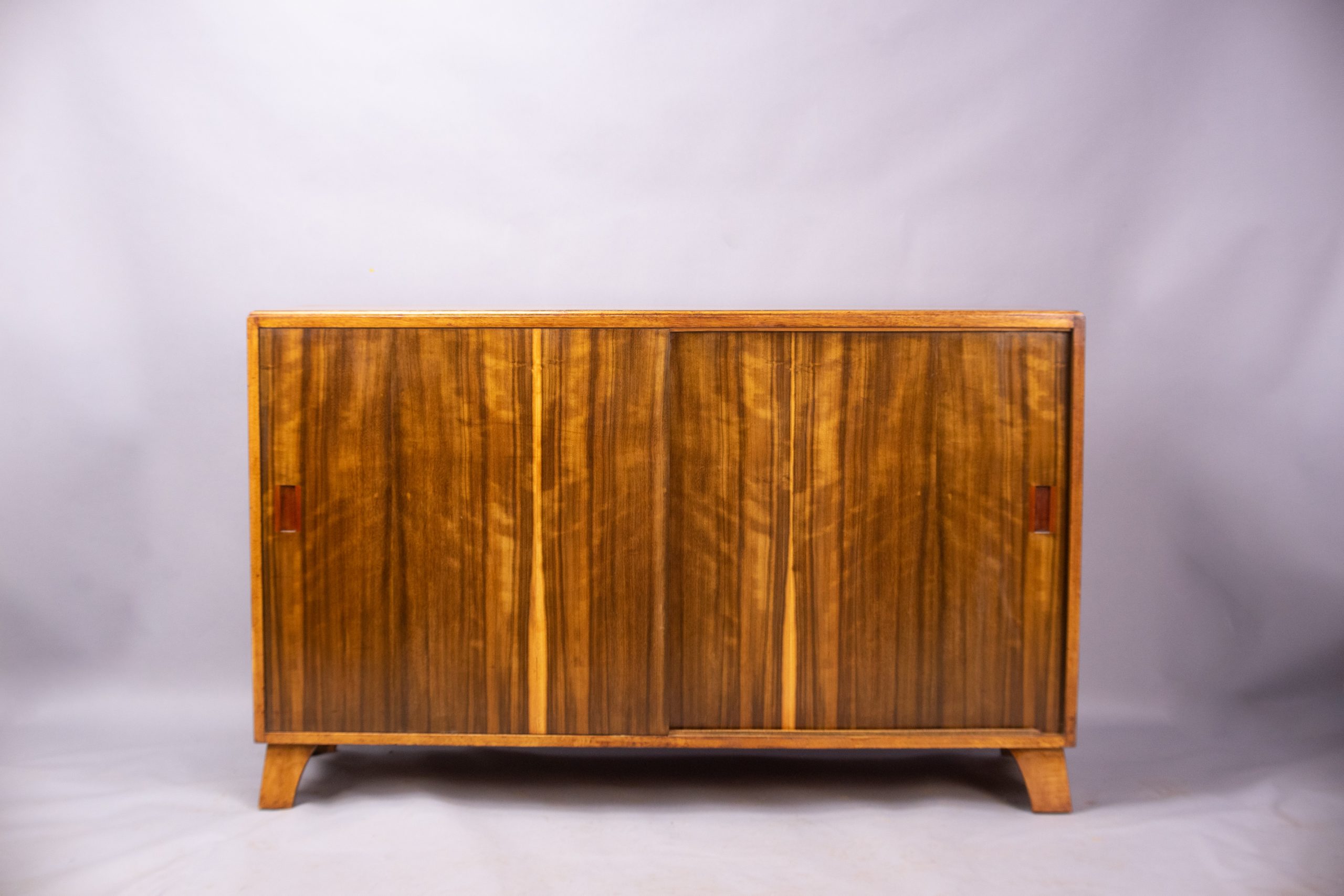 An elegant sideboard/cabinet hand-made in the workshops of David Joel, Kingston-upon-Thames in the early 1950s, Simple uncluttered lines that cross the styles of Art Deco and Modernism finished in striking Indian laurel veneers. The sliding doors have inset handles in a contrasting red wood and open onto two cupboards: one with two removable shelves on the left and a cupboard on the right with a shelf and an internal cutlery drawer lined in green baize.