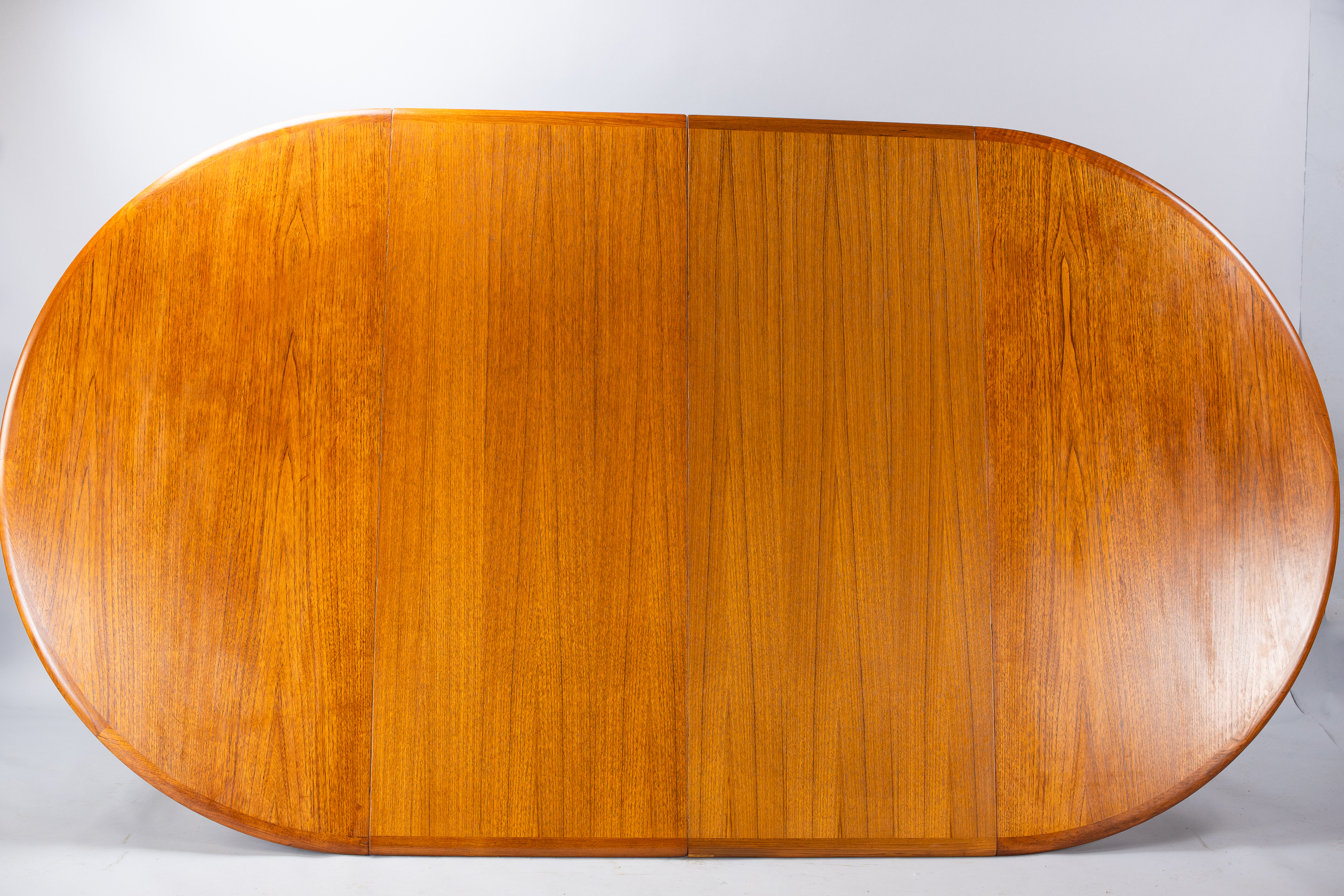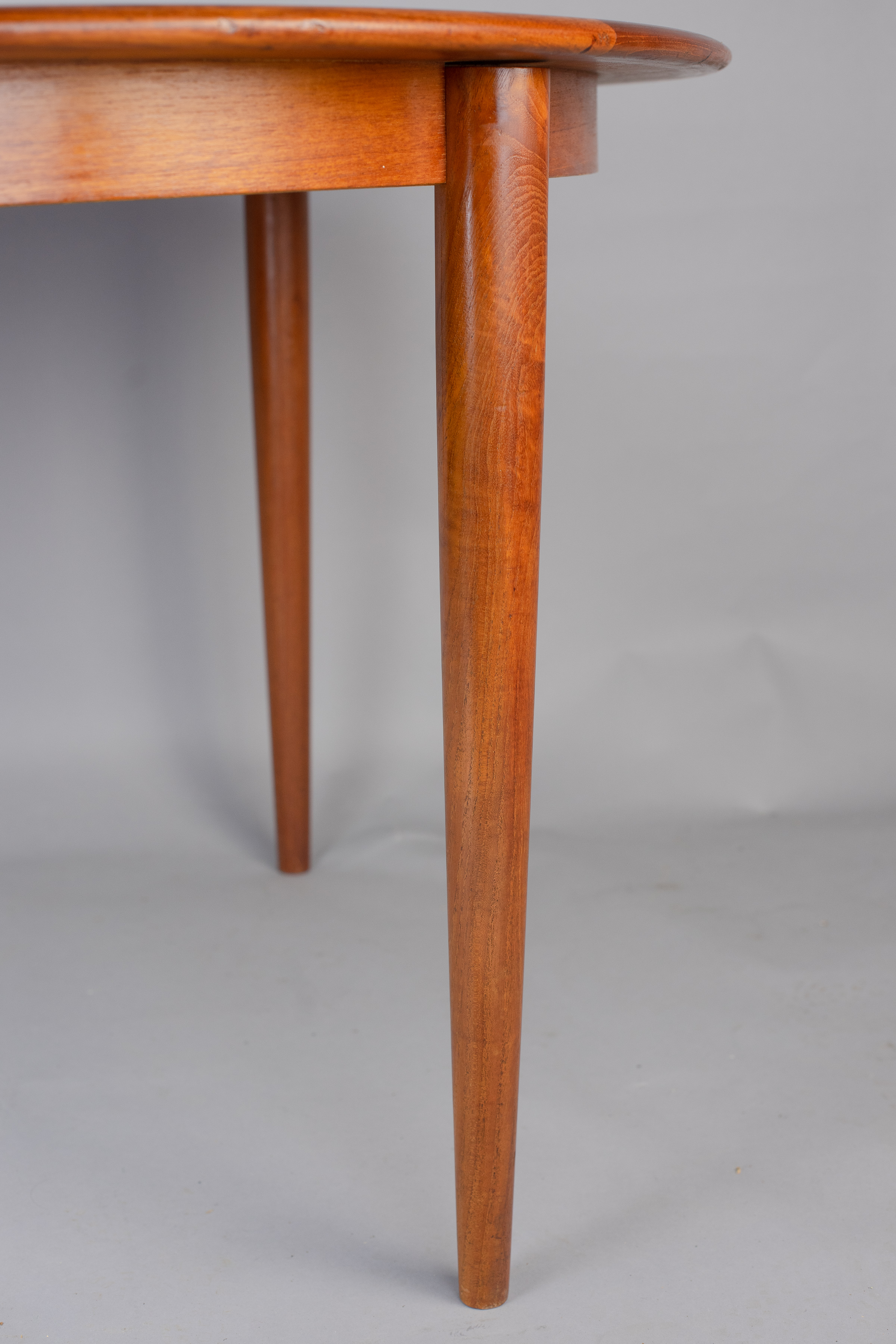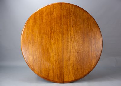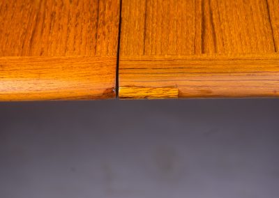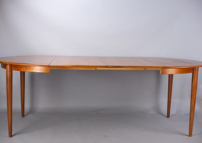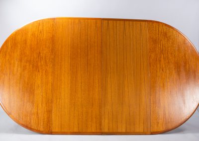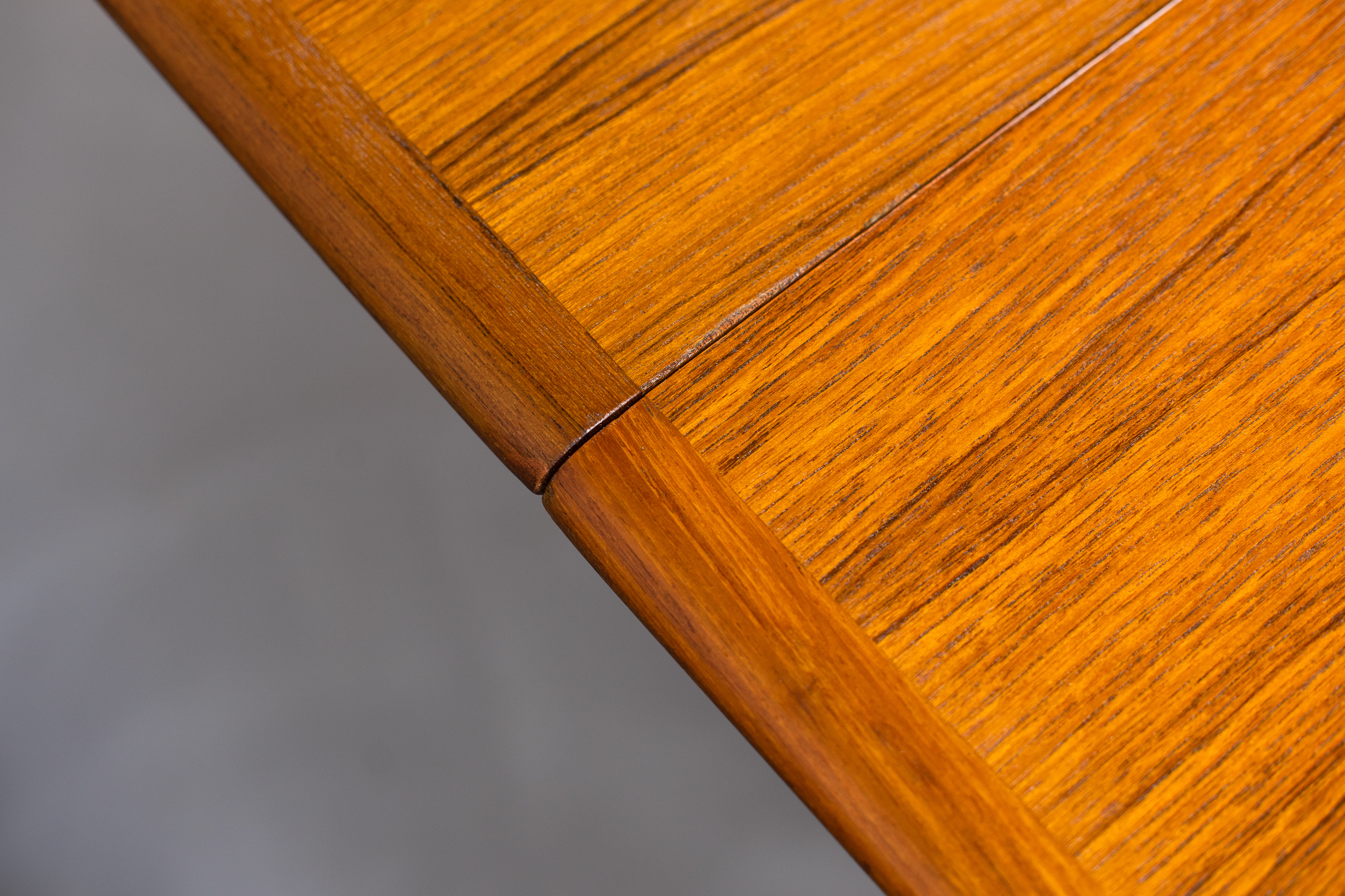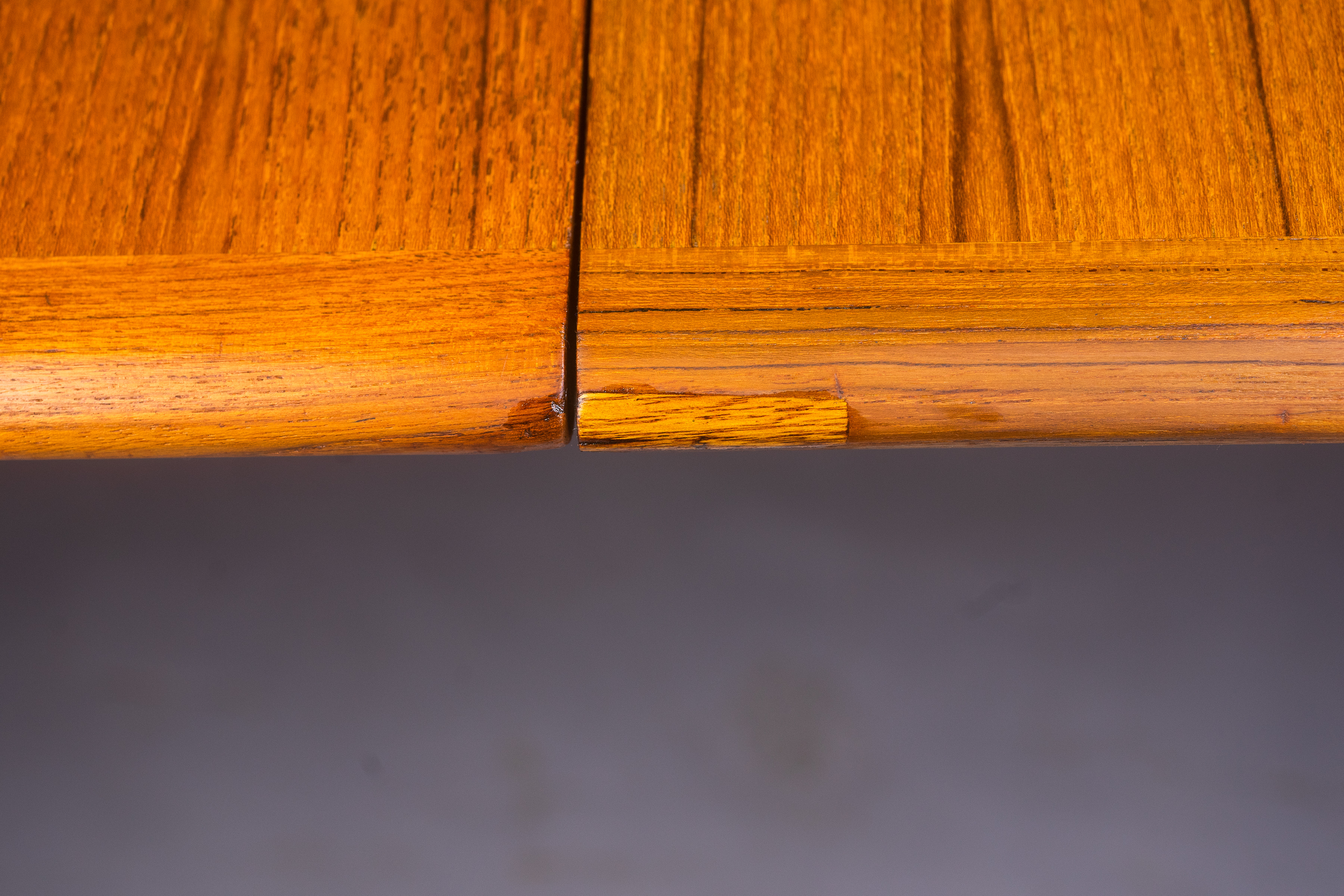 Beautifully patinated oiled teak finish. Simple minimalist lines with tapered edge detail. Good colour match between main table and extension leaves. There are some light scratches and marks on the surface as to be expected from half a century of use; a small triangular veneer repair; small inset repair on corner of extension. Please see photos for these details, none of which detracts from the overall impression of this elegant dining table.
